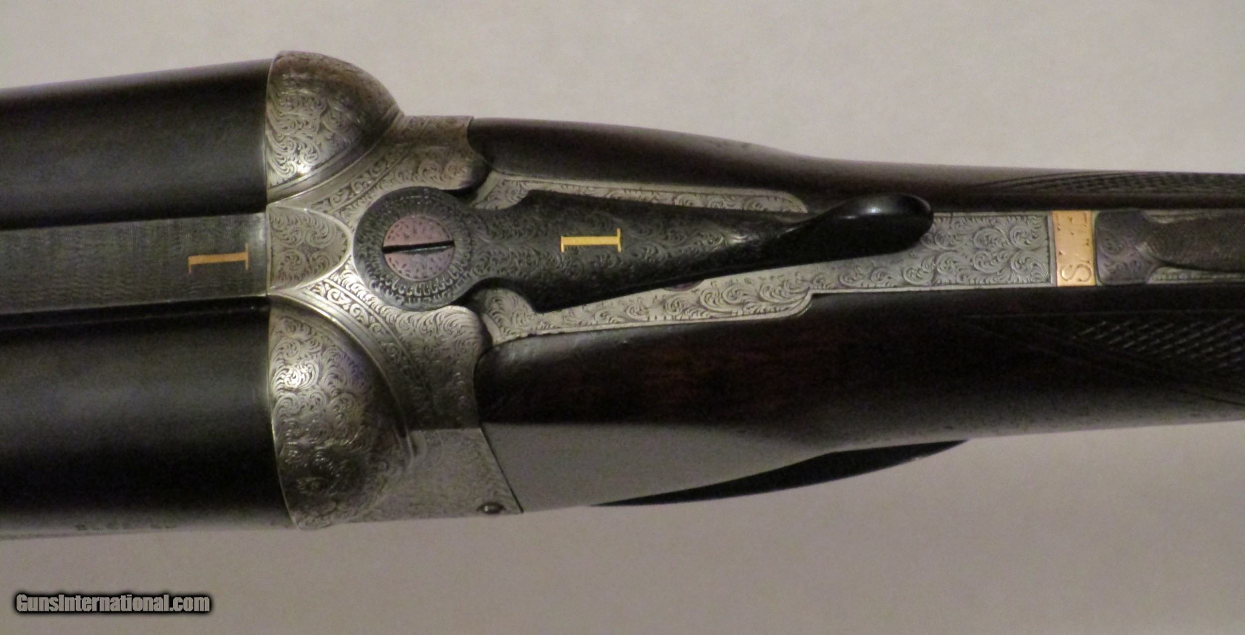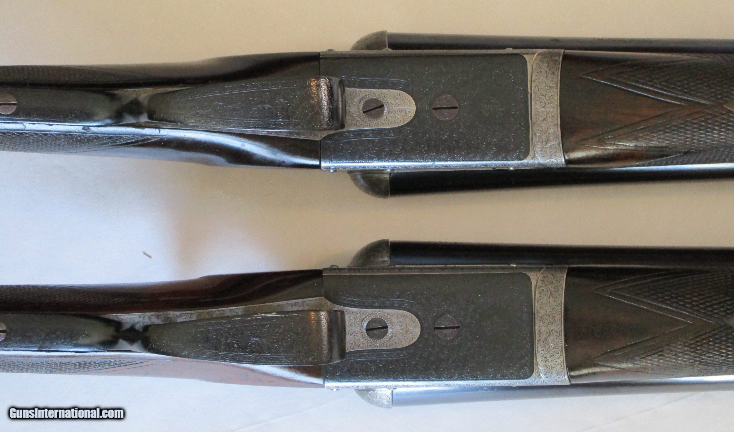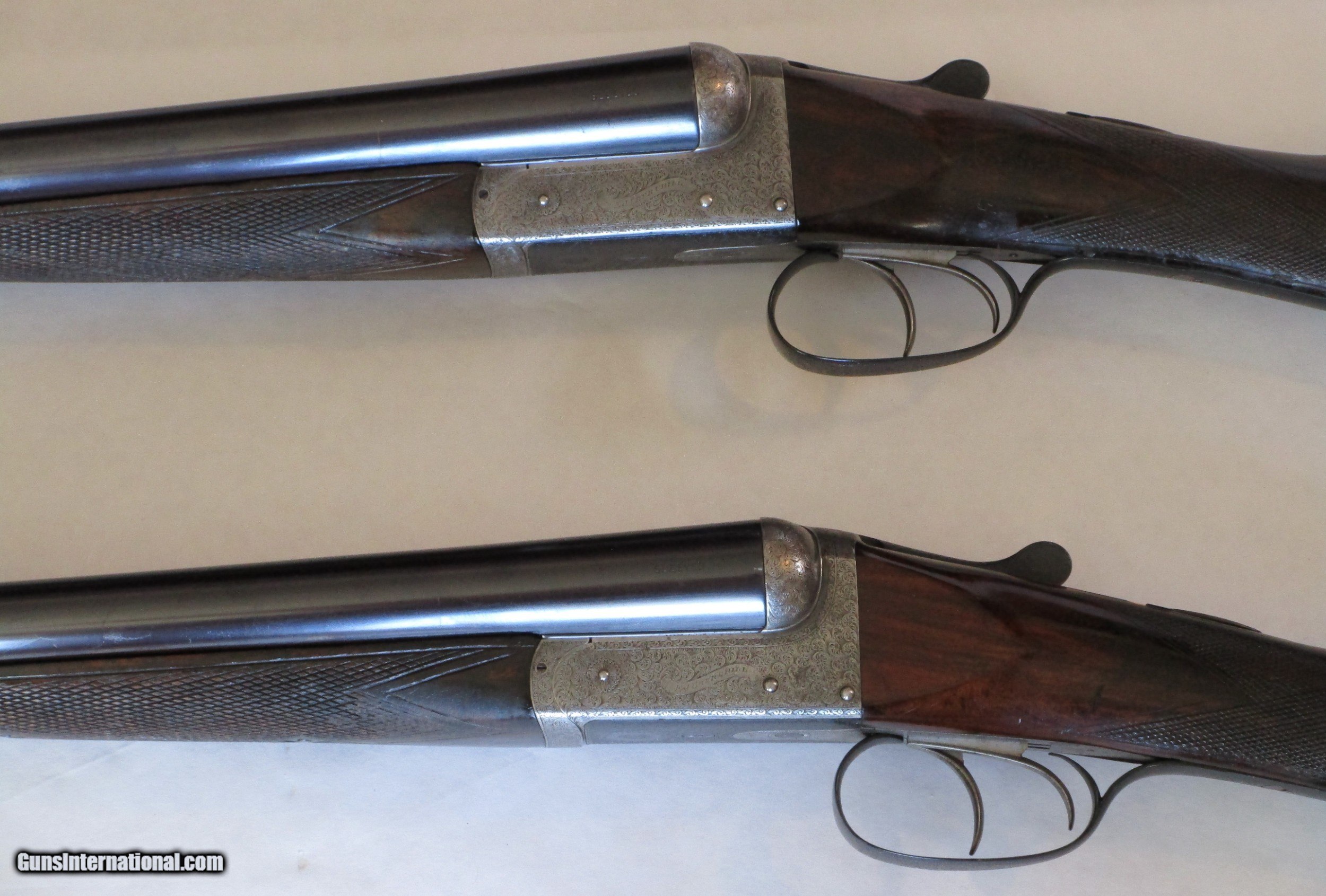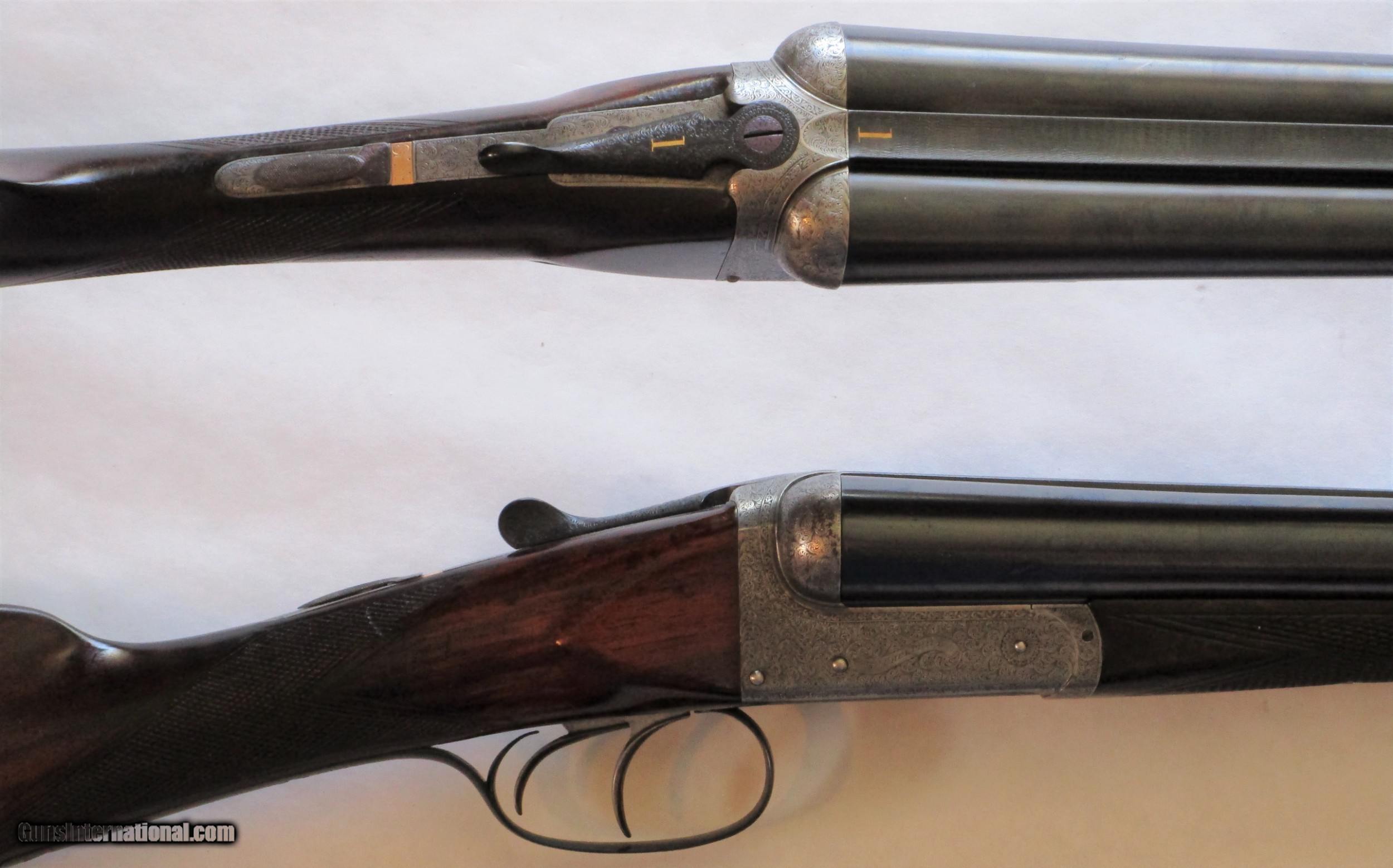 Description: A PAIR OF E. J. CHURCHILL 12-BORE BOXLOCK EJECTORS, serial numbers 1309 and 1310.( circa. 1900-1910) 28" nitro proofed, sleeved barrels with 2 1/2 chambers(no,1) bored approx. imp. cyl. and 1/2 choke, (no.2) bored approx. imp. cyl. and 1/4 choke. The bores are bright and shiny. Full coverage of border and fine acanthus scroll engraving. Gold inlaid "1" and "2" on the top levers, splinter forends and ribs at the breech ends. Gold inlaid automatic safeties. The straight, nicely figured stocks have extensions that bring the length of pull to 15 1/2" (no.1) weight 7lbs. 3oz. (no.2) weight 7lbs. 1oz. If you have any questions, please don't hesitate to ask. SOLD Manufacturer: E. J. CHURCHILL Serial Number: 1309 and 1310 Bore: 12 Chambers: 2 1/2 Ejectors: YES Condition: GOOD Metal Condition: GOOD Wood Condition: GOOD Bore Condition: VERY GOOD Action: BOXLOCK Triggers: DOUBLE Stock: STRAIGHT Stock Comb: 1 3/8 Stock Heel: 2 Stock Cast: RIGHT HAND Fore End: SPLINTER Butt Pad: RUBBER LOP: 15 1/2 Weight: 7lbs. 3oz. and 7lbs. 1oz. Sights: BEAD Manufacture Date: 1900-1910 Engraving: ACANTHUS SCROLL Case: NO CASE Item Location: Michigan Proof:Nitro: YES |