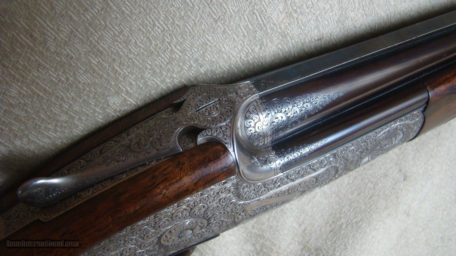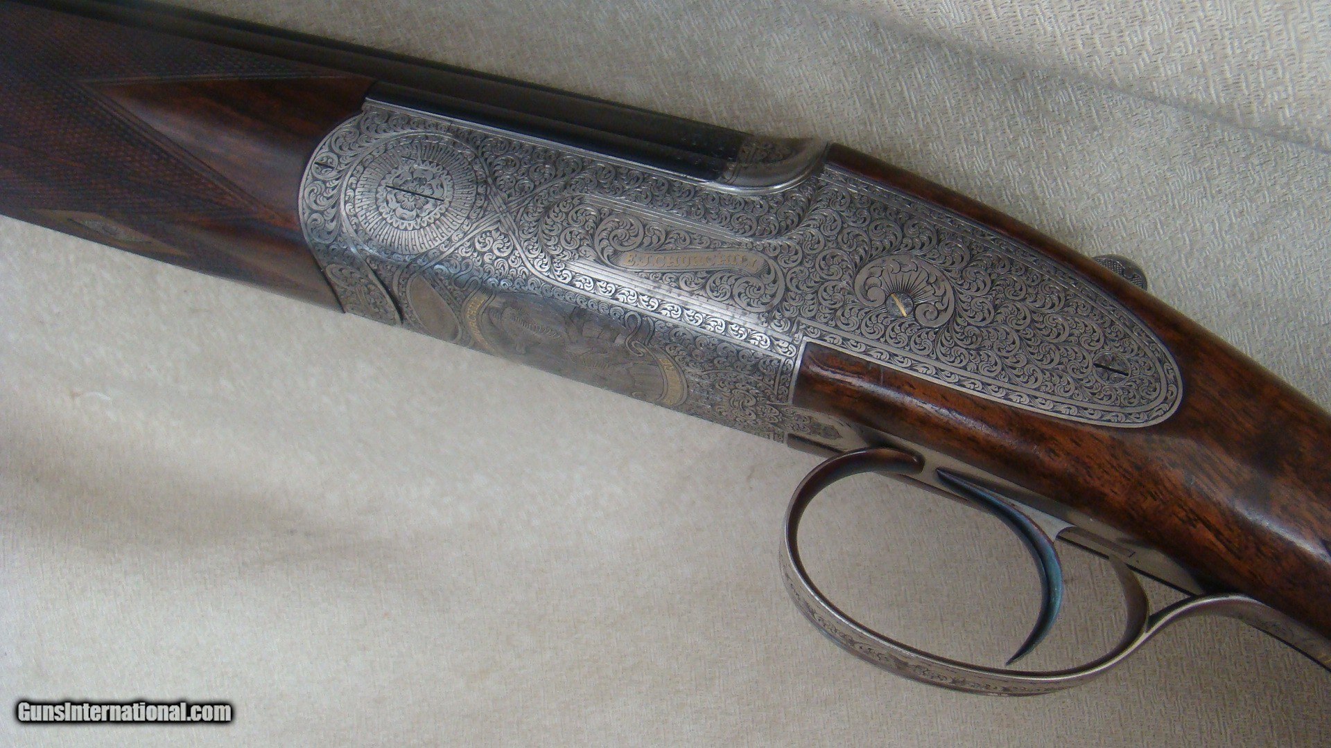 Description: E. J. Churchill Premier over under 28 gauge. 29" chopper lump barrels choked .005/.009 (improved cylinder/open modified) feature a raised, tapered file cut game rib. Auto ejectors, auto safe, single trigger. The round bar action is engraved in the finest small scroll with a fabulous scene of flushing quail on the action bottom and framed with "EJ Churchill Premier" in gold. The locks also bear the Churchill name, also in gold, contrasting against the old silver finish. Truly a sensational visual treat! Pistol grip stock of dark, old world burl walnut with extraordinary figure measures 1-3/8" comb, 2-3/8" heel, 14-3/8" to a checkered butt, slight cast for a right-hand shooter. Slight forward bias, weighing only 5 lbs., 10 oz., results in an exceptional feel and swing. A true masterpiece! Just the ticket for quail and dove! Deluxe brass cornered leather case with outer canvas cover. Offered at half of replacement. SOLD |