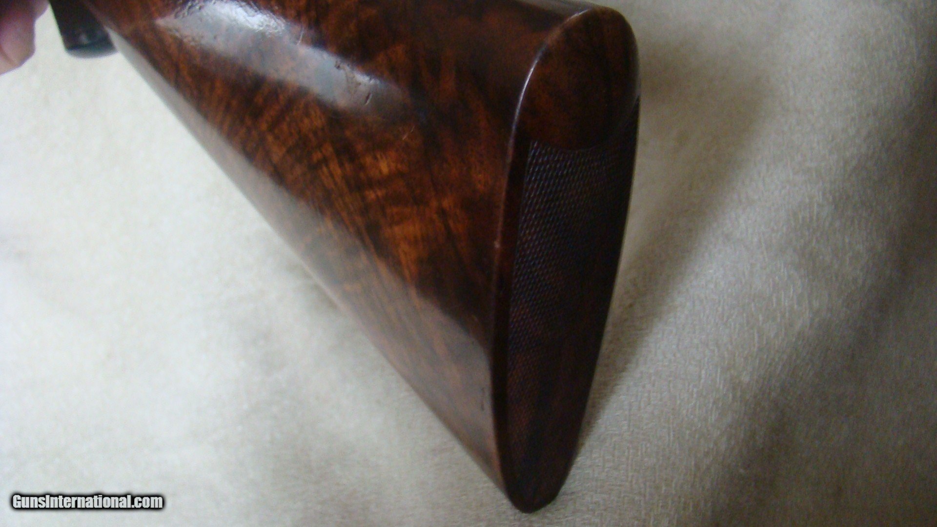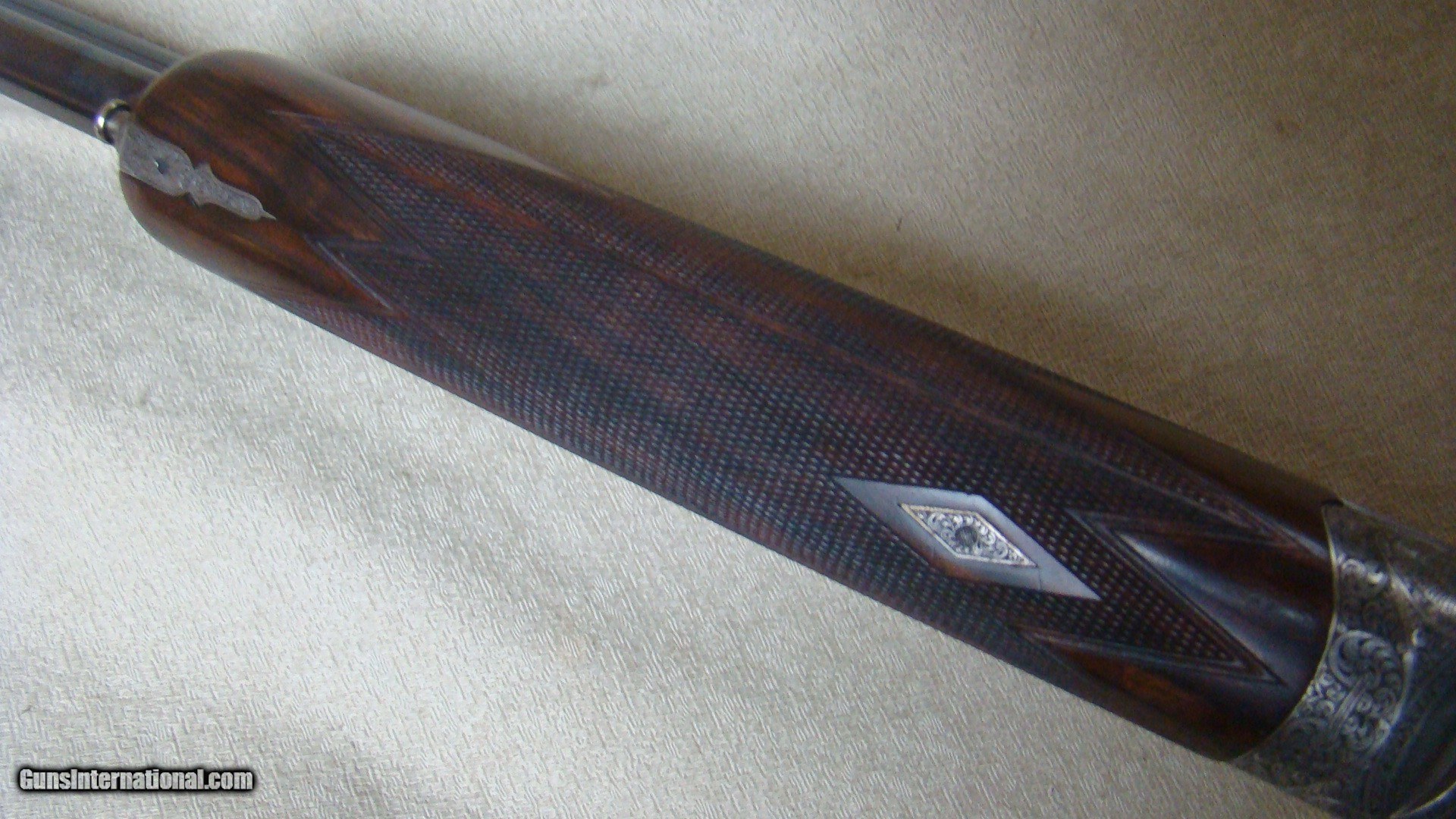Description: E. J. Churchill Premier over under 28 gauge. 29" chopper lump barrels choked .005/.009 (improved cylinder/open modified) feature a raised, tapered file cut game rib. Auto ejectors, auto safe, single trigger. The round bar action is engraved in the finest small scroll with a fabulous scene of flushing quail on the action bottom and framed with "EJ Churchill Premier" in gold. The locks also bear the Churchill name, also in gold, contrasting against the old silver finish. Truly a sensational visual treat! Pistol grip stock of dark, old world burl walnut with extraordinary figure measures 1-3/8" comb, 2-3/8" heel, 14-3/8" to a checkered butt, slight cast for a right-hand shooter. Slight forward bias, weighing only 5 lbs., 10 oz., results in an exceptional feel and swing. A true masterpiece! Just the ticket for quail and dove! Deluxe brass cornered leather case with outer canvas cover. Offered at half of replacement. SOLD |