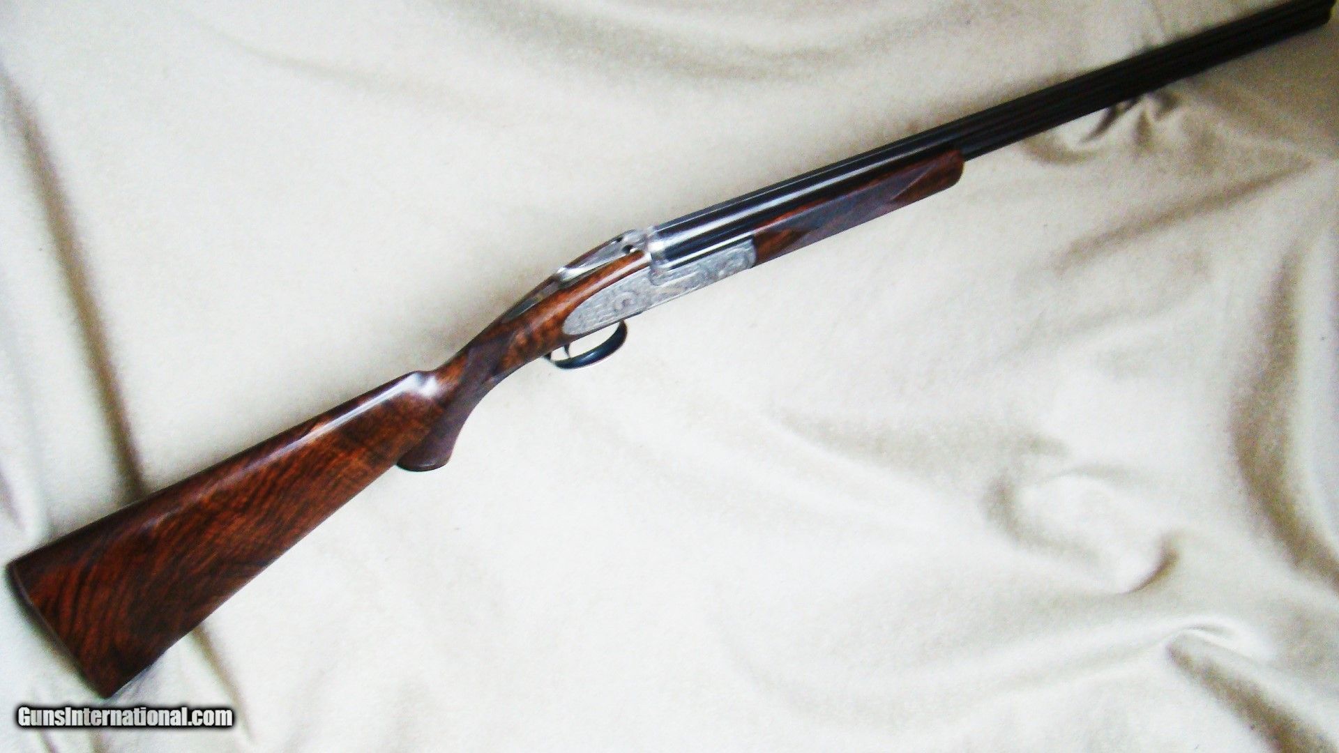 Description: E. J. Churchill Premier over under 28 gauge. 29" chopper lump barrels choked .005/.009 (improved cylinder/open modified) feature a raised, tapered file cut game rib. Auto ejectors, auto safe, single trigger. The round bar action is engraved in the finest small scroll with a fabulous scene of flushing quail on the action bottom and framed with "EJ Churchill Premier" in gold. The locks also bear the Churchill name, also in gold, contrasting against the old silver finish. Truly a sensational visual treat! Pistol grip stock of dark, old world burl walnut with extraordinary figure measures 1-3/8" comb, 2-3/8" heel, 14-3/8" to a checkered butt, slight cast for a right-hand shooter. Slight forward bias, weighing only 5 lbs., 10 oz., results in an exceptional feel and swing. A true masterpiece! Just the ticket for quail and dove! Deluxe brass cornered leather case with outer canvas cover. Offered at half of replacement. SOLD |