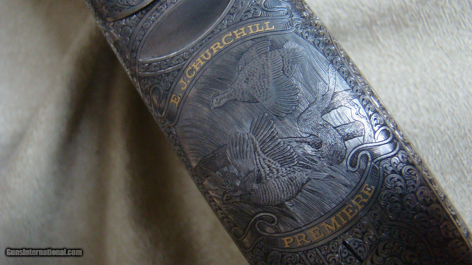 Description: E. J. Churchill Premier over under 28 gauge. 29" chopper lump barrels choked .005/.009 (improved cylinder/open modified) feature a raised, tapered file cut game rib. Auto ejectors, auto safe, single trigger. The round bar action is engraved in the finest small scroll with a fabulous scene of flushing quail on the action bottom and framed with "EJ Churchill Premier" in gold. The locks also bear the Churchill name, also in gold, contrasting against the old silver finish. Truly a sensational visual treat! Pistol grip stock of dark, old world burl walnut with extraordinary figure measures 1-3/8" comb, 2-3/8" heel, 14-3/8" to a checkered butt, slight cast for a right-hand shooter. Slight forward bias, weighing only 5 lbs., 10 oz., results in an exceptional feel and swing. A true masterpiece! Just the ticket for quail and dove! Deluxe brass cornered leather case with outer canvas cover. Offered at half of replacement. SOLD |