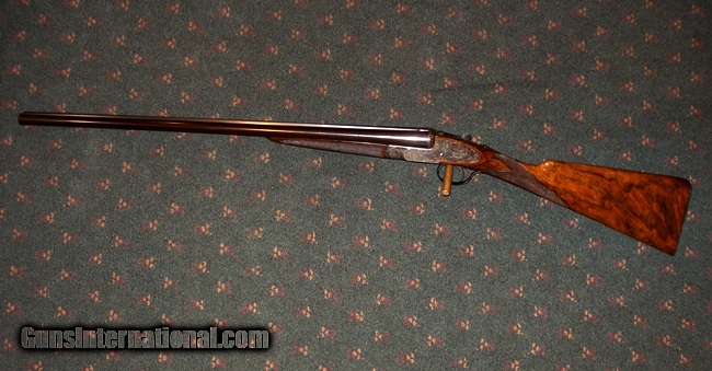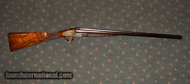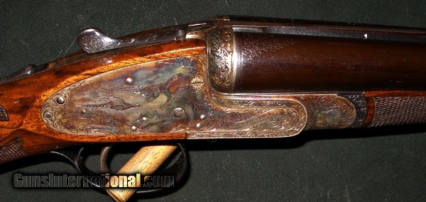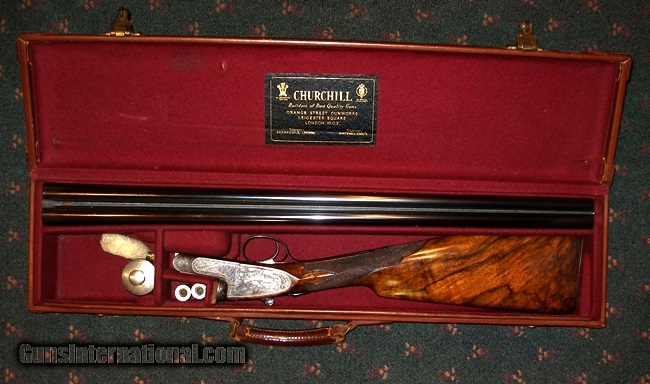 Description: E.J. CHURCHILL RARE DELUXE PREMIER SIDELOCK 20GA S/S SHOTGUN, 1962 VINTAGE, DEEP CHISELLED FENCES WITH FOLITE SCROLL & GAME SCENES, 25" BBLS, 2 3/4 ORIGINAL PROOFS, CHOKED 1/4, 3/4, CHURCHILL RIB, EJECTORS, SINGLE TRIGGER, BEAUTIFUL COLOR STREAKED WALNUT, STRAIGHT/SPLINTER, DELUXE CHECKERING, LOP 14 5/8, 1 7/16, 2 18, 5LBS 8OZ, MAKER'S LEATHER CASE WITH ACCESSORIES, MINT, 99% CASE COLORS, 100% BLUE! SOLD |