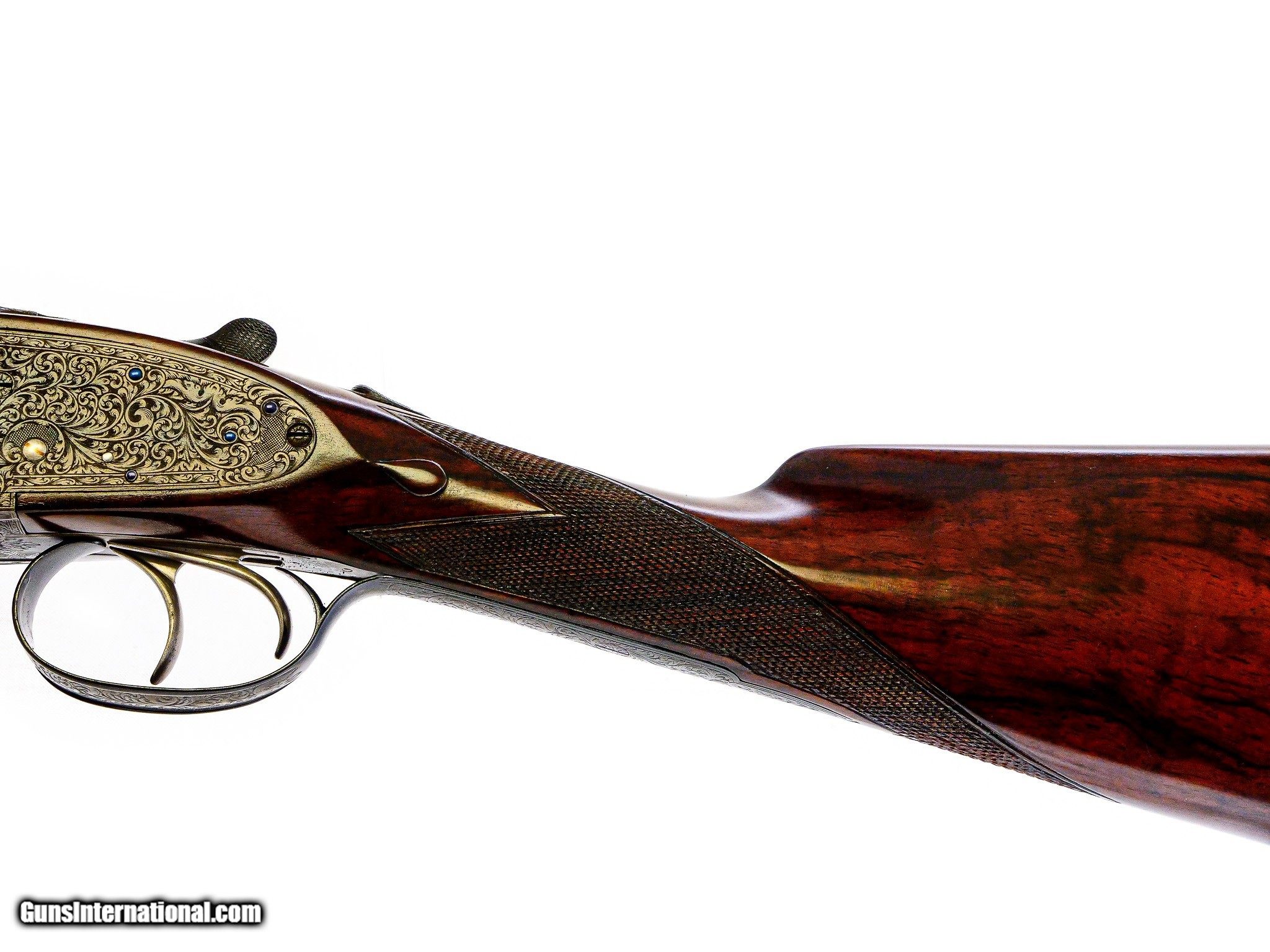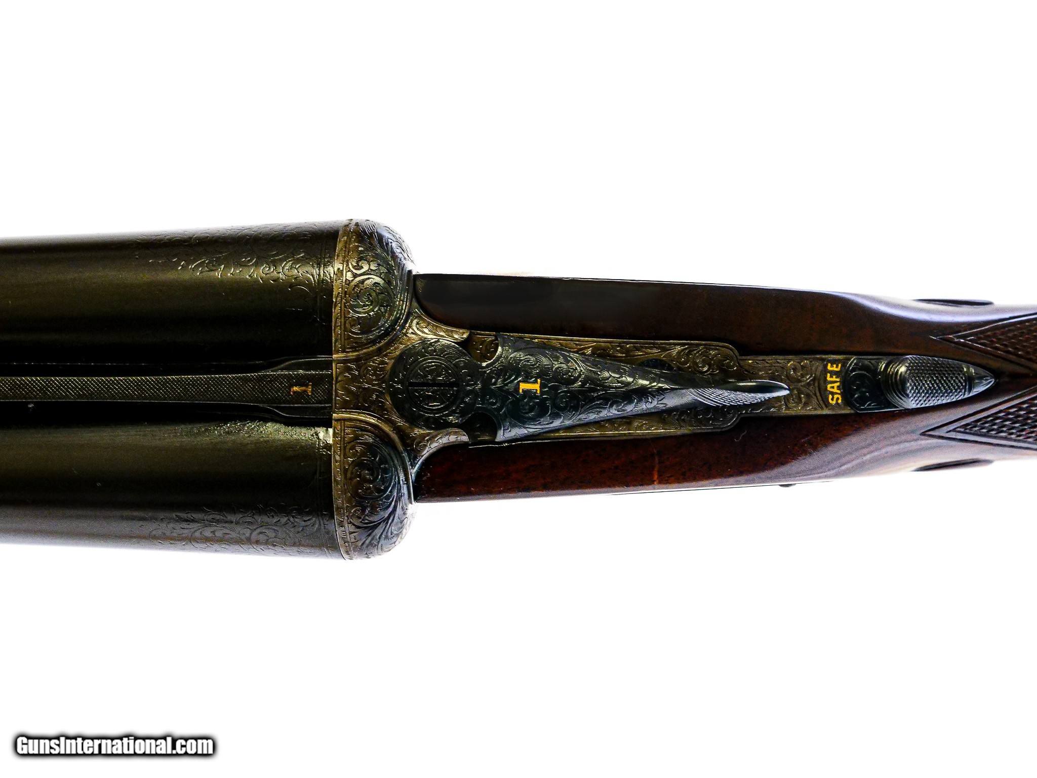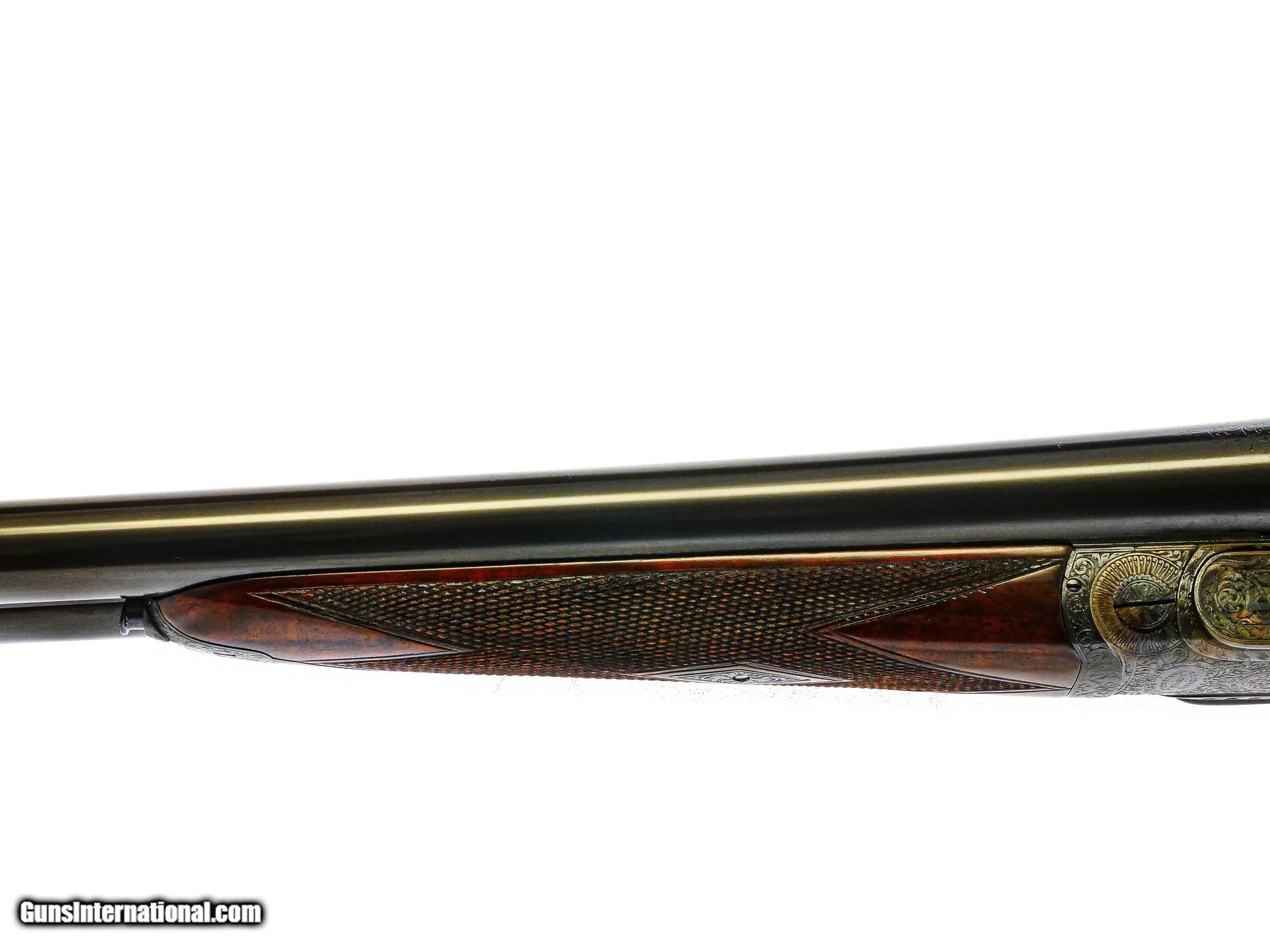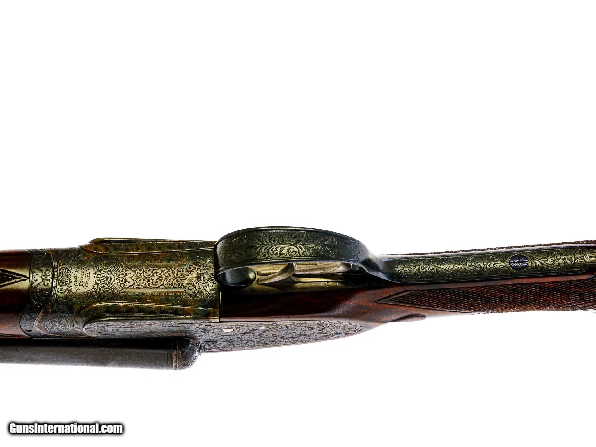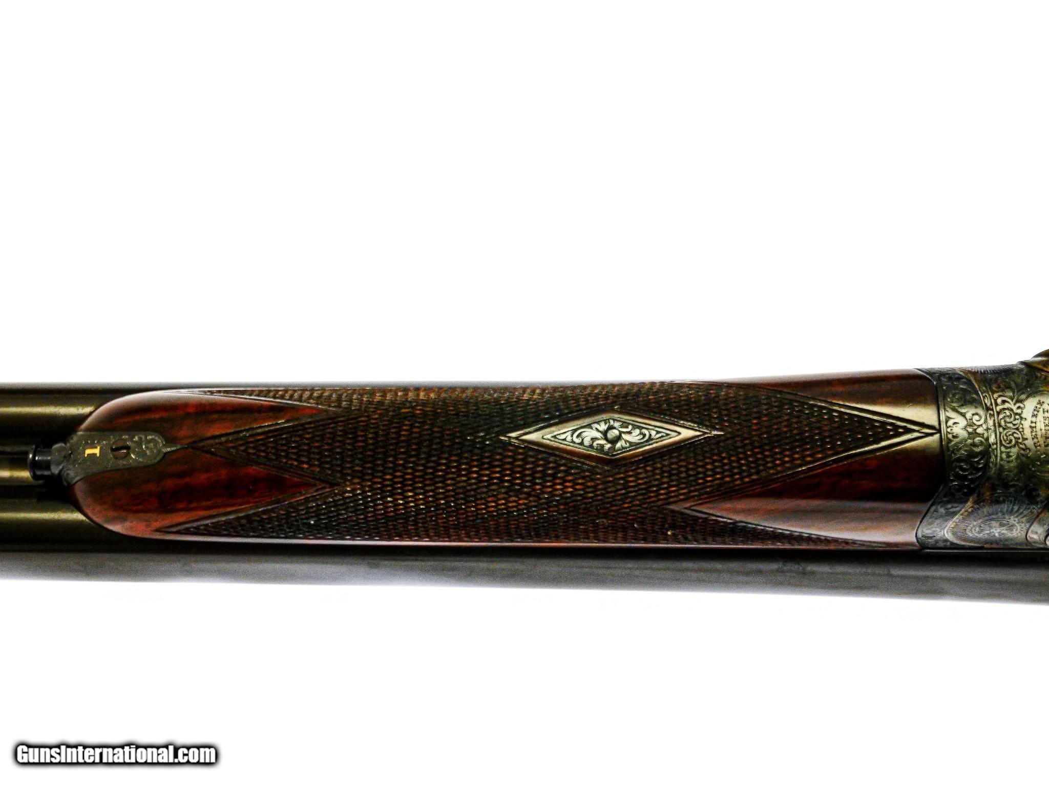 Description: E.J. Churchill - RARE Premier "Finest Quality", SxS, 12ga. 28" Barrels. Assisted opening sidelock, made in 1954, ejector, Churchill raised rib with magnificent scroll engraving over 100% of the action. Original 2 1/2" chamber, chokes 1/2 and 3/4. Top lever, rib, and forend have #1 in gold, gold inlay, cocking indicators, double roll end trigger guard. Just magnificent engraving. Approximately 1/4" castoff, highly figured Turkish walnut stock, splinter forend. These guns have been completely gone over and are virtually a new product. Everything is perfect including the blue, wood finish, and checkering. Highest quality english full sidelock gun with rare barrel length and assisted opening action. Inv: 66595 14 1/2" x 1 1/2" x 2" $13,500.00 SOLD |