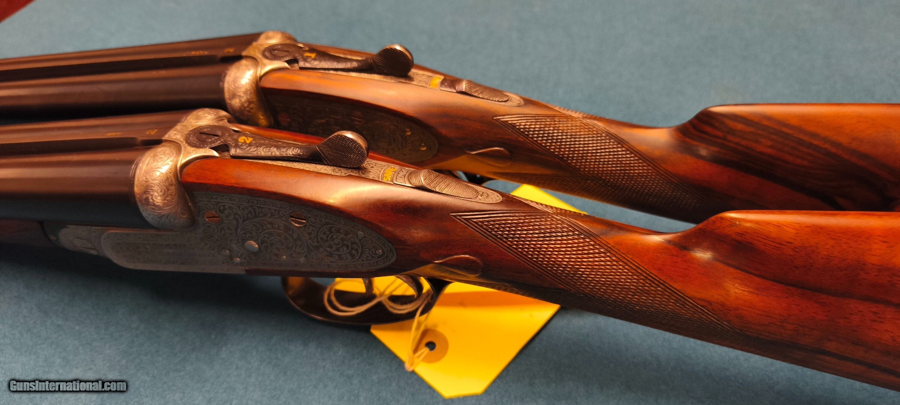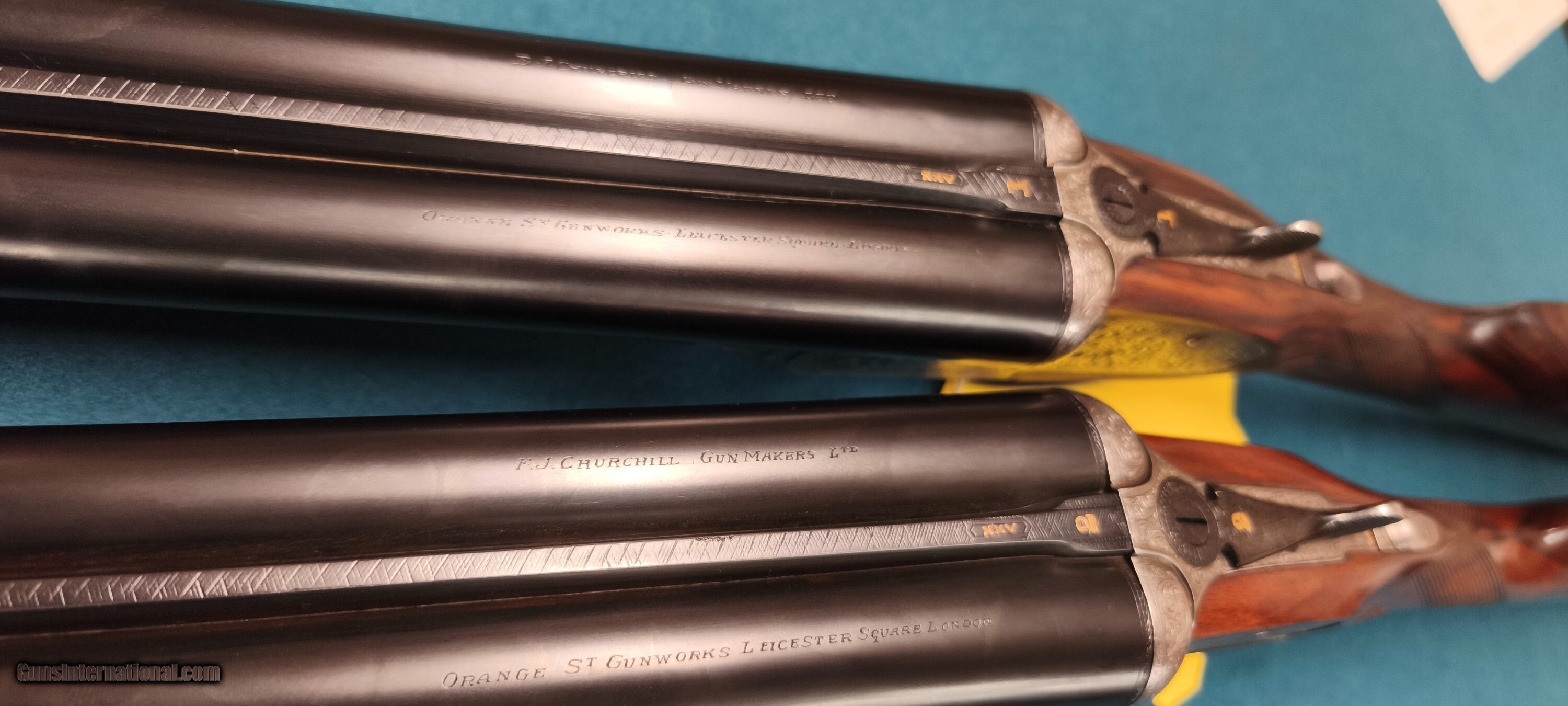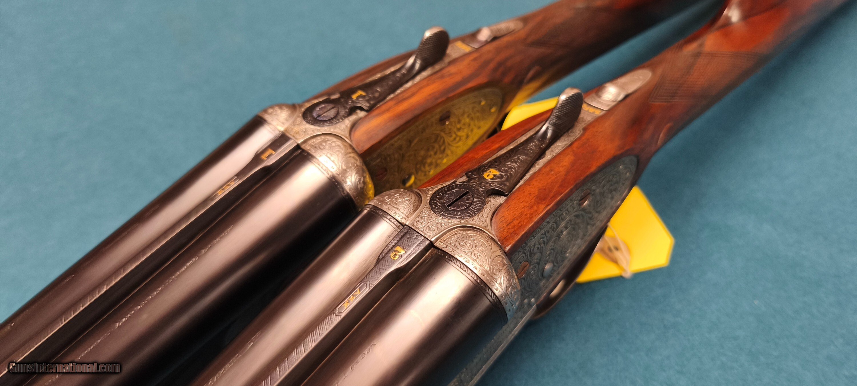 Description: A PAIR OF 12-BORE ''CROWN'' MODEL SIDELOCK EJECTOR GUNS, NOS. 4407/8 25-inch chopper-lump barrels with 2 1/2-inch chambers, about 1/4 choke borings, file-cut Churchill ribs, the frames, locks and gold numbered top levers with fine scroll engraving and retaining some original hardening colour, the maker's name signed within a scrolling banner, gold lined cocking indicators and rolled edge trigger guards, 14 1/2-inch well figured stocks cast-off for right handed shooter, 6lb. 4oz., nitro proof, in their maker's ''VC'' case S2 These guns arrive in the US in February 2026 Shotgun Gauge: 12 Gauge Manufacturer: E J Churchill Model: Crown Serial Number: 4407/8 Barrel Length: 25 Bore Info: 729 Chambers: 2 1/2 Ejectors: Yes Condition: Excellent Metal Condition: Excellent Wood Condition: Excellent Bore Condition: Excellent Barrel Type: Double Action: Sidelock Triggers: Double Stock: Walnut Stock Dimensions: 14 1/2" LOP Stock Drop: 1.5 inch Stock Comb: 1 1/2 inch Stock Heel: 2 Stock Cast: 1/8" off Fore End: Splinter LOP: 14 1/2 Weight: 6lb 4oz Choke Left: Light Mod Choke Right: Light Mod Engraving: Scroll Proof:Nitro: Yes Minimum Wall Thickness Left: 25 Minimum Wall Thickness Right: 25 Price: $13,995.00 Shipping: $150.00 Contact Seller |