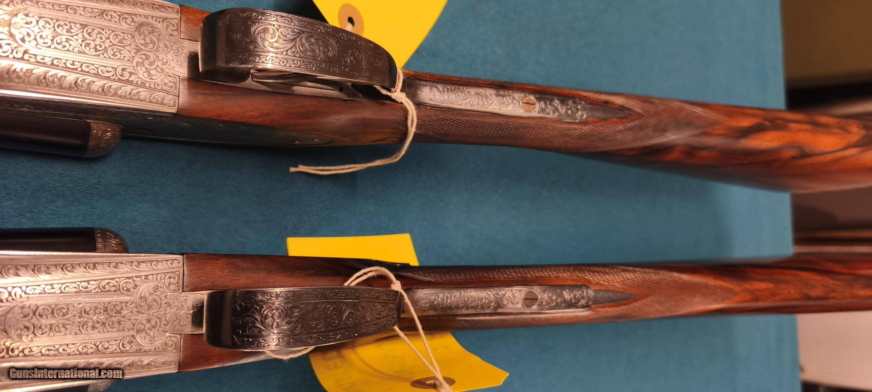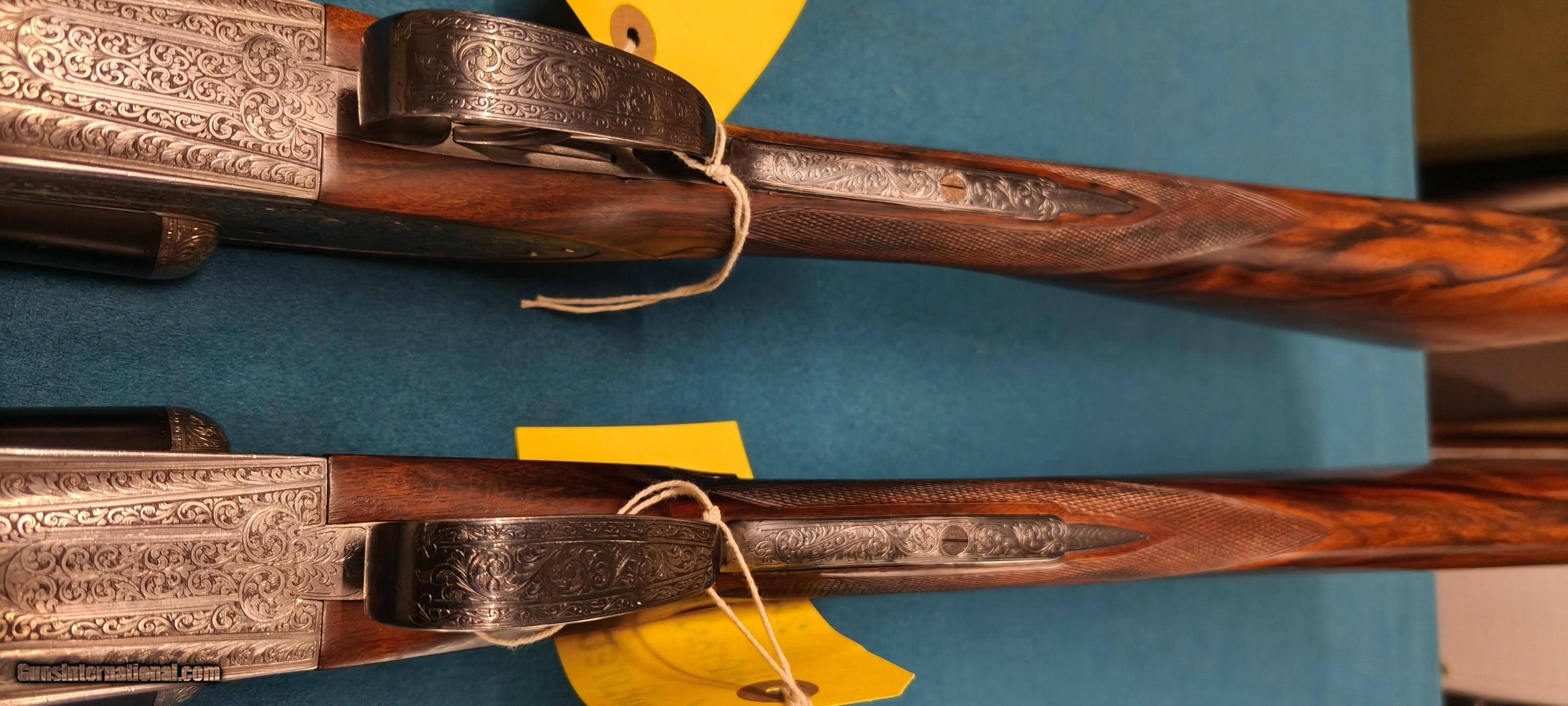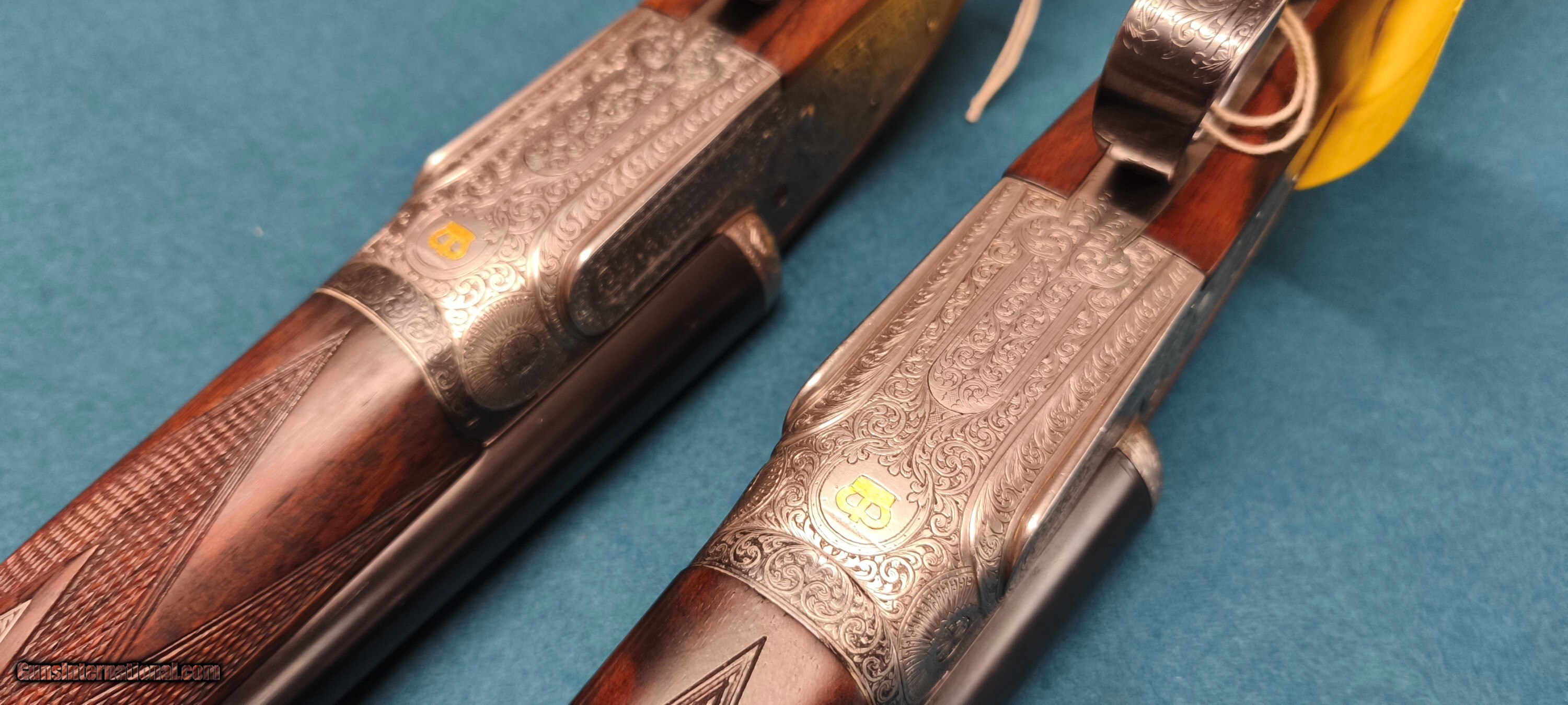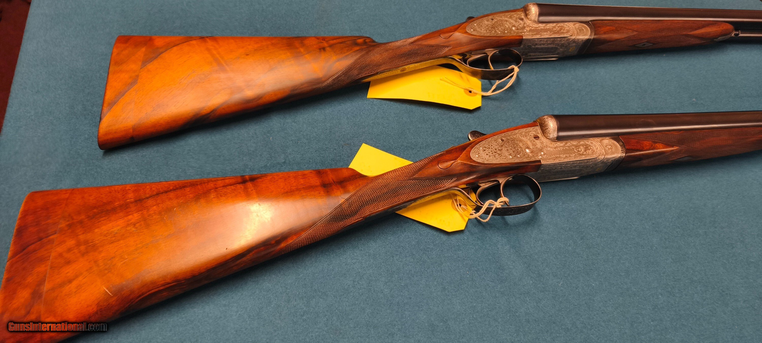 Description: A PAIR OF 12-BORE ''CROWN'' MODEL SIDELOCK EJECTOR GUNS, NOS. 4407/8 25-inch chopper-lump barrels with 2 1/2-inch chambers, about 1/4 choke borings, file-cut Churchill ribs, the frames, locks and gold numbered top levers with fine scroll engraving and retaining some original hardening colour, the maker's name signed within a scrolling banner, gold lined cocking indicators and rolled edge trigger guards, 14 1/2-inch well figured stocks cast-off for right handed shooter, 6lb. 4oz., nitro proof, in their maker's ''VC'' case S2 These guns arrive in the US in February 2026 Shotgun Gauge: 12 Gauge Manufacturer: E J Churchill Model: Crown Serial Number: 4407/8 Barrel Length: 25 Bore Info: 729 Chambers: 2 1/2 Ejectors: Yes Condition: Excellent Metal Condition: Excellent Wood Condition: Excellent Bore Condition: Excellent Barrel Type: Double Action: Sidelock Triggers: Double Stock: Walnut Stock Dimensions: 14 1/2" LOP Stock Drop: 1.5 inch Stock Comb: 1 1/2 inch Stock Heel: 2 Stock Cast: 1/8" off Fore End: Splinter LOP: 14 1/2 Weight: 6lb 4oz Choke Left: Light Mod Choke Right: Light Mod Engraving: Scroll Proof:Nitro: Yes Minimum Wall Thickness Left: 25 Minimum Wall Thickness Right: 25 Price: $13,995.00 Shipping: $150.00 Contact Seller |