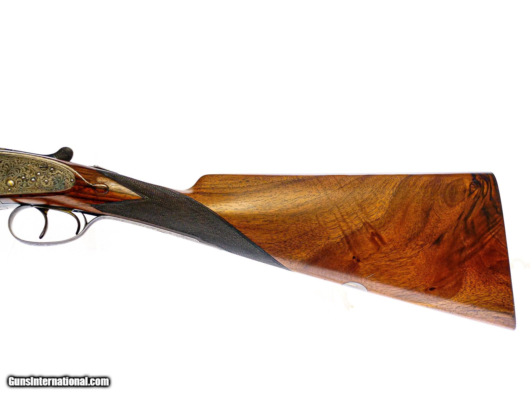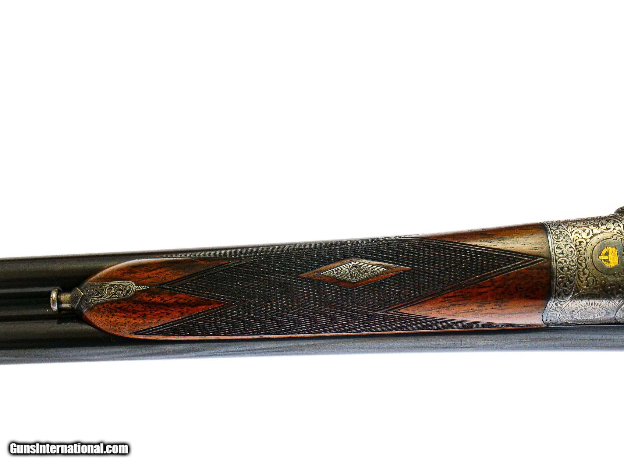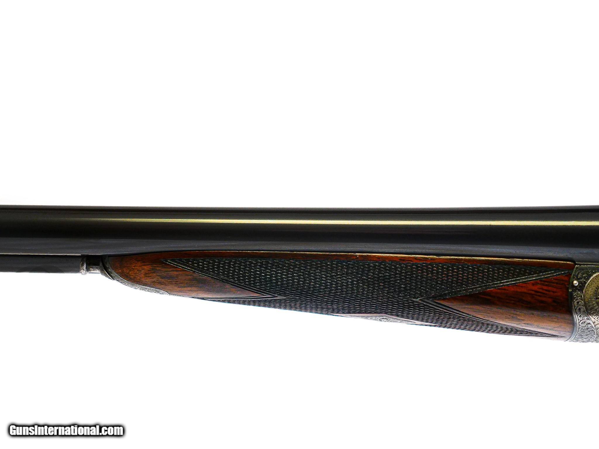 Description: E.J. Churchill - XXV Crown Grade Sidelock Ejector, SxS, 20ga. 25" Barrels Choked IC/M. Straight grip, checkered butt, double triggers, gold oval, automatic ejectors, splinter forend, Orange St., Leichester Square, London address on rib, high condition gun completely untouched with near perfect bluing, wood finish, and strong case coloring, magnificent West London workmanship throughout gun remains in pristine condition throughout, seldom encountered small bore sidelock Churchill. Inv: 27493 5 lbs. 8 oz. 14 5/8" x 1 ½" x 2 3/8" $32,500.00 SOLD |