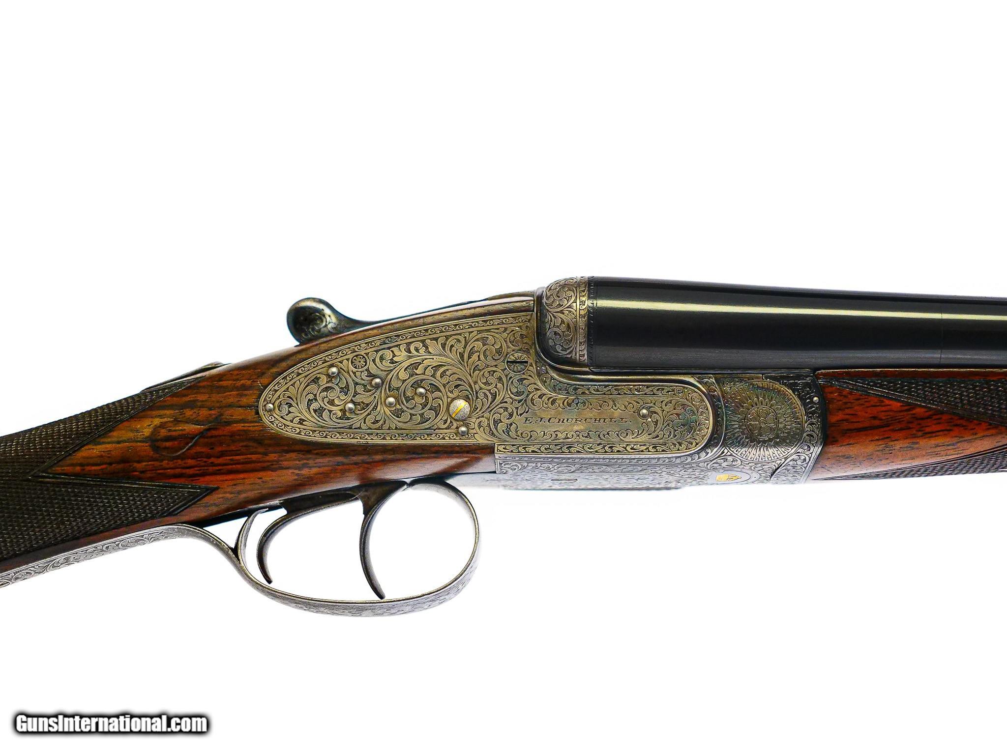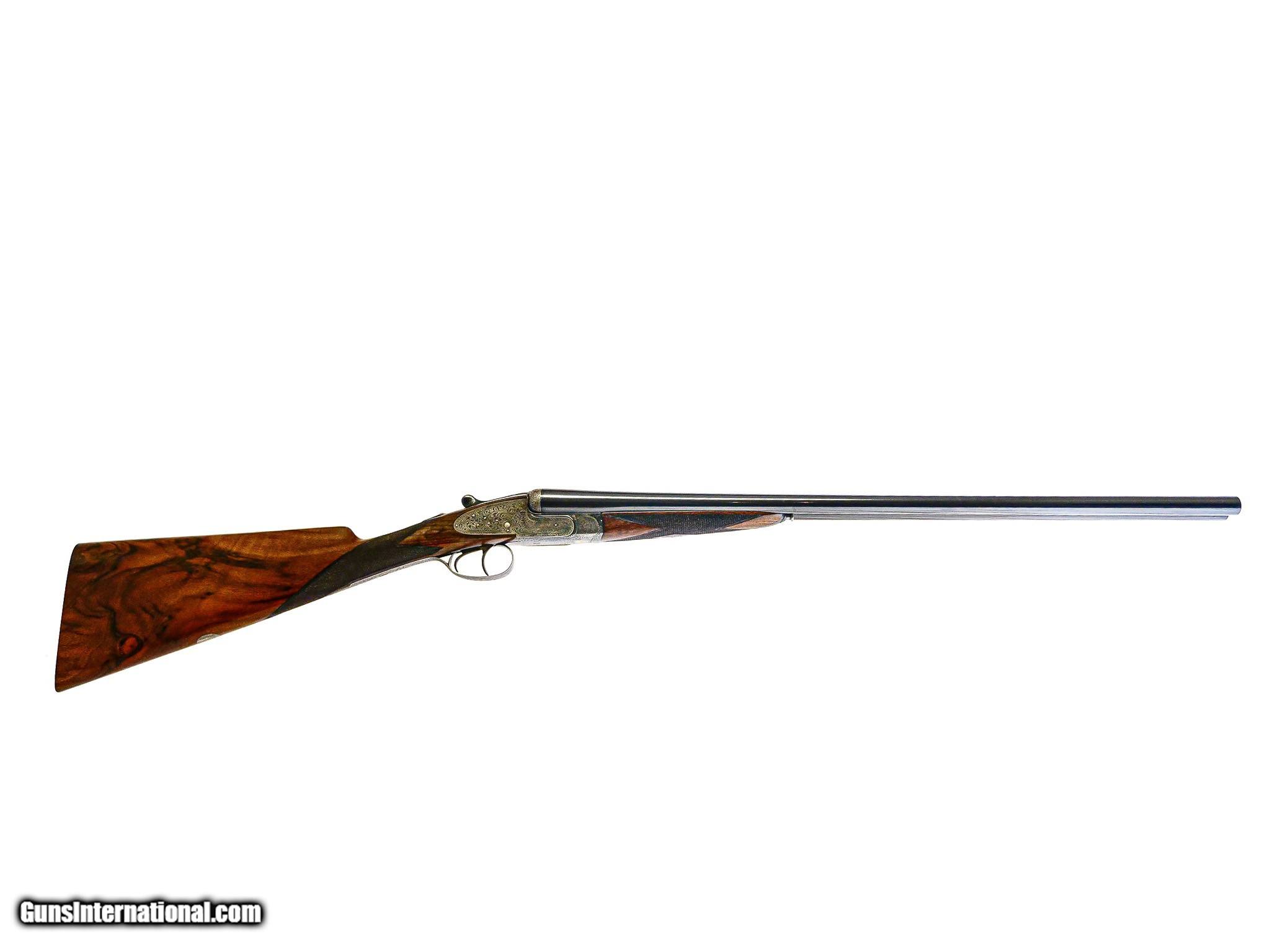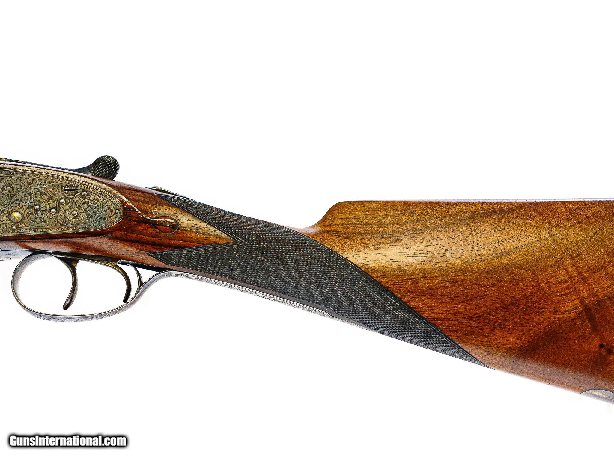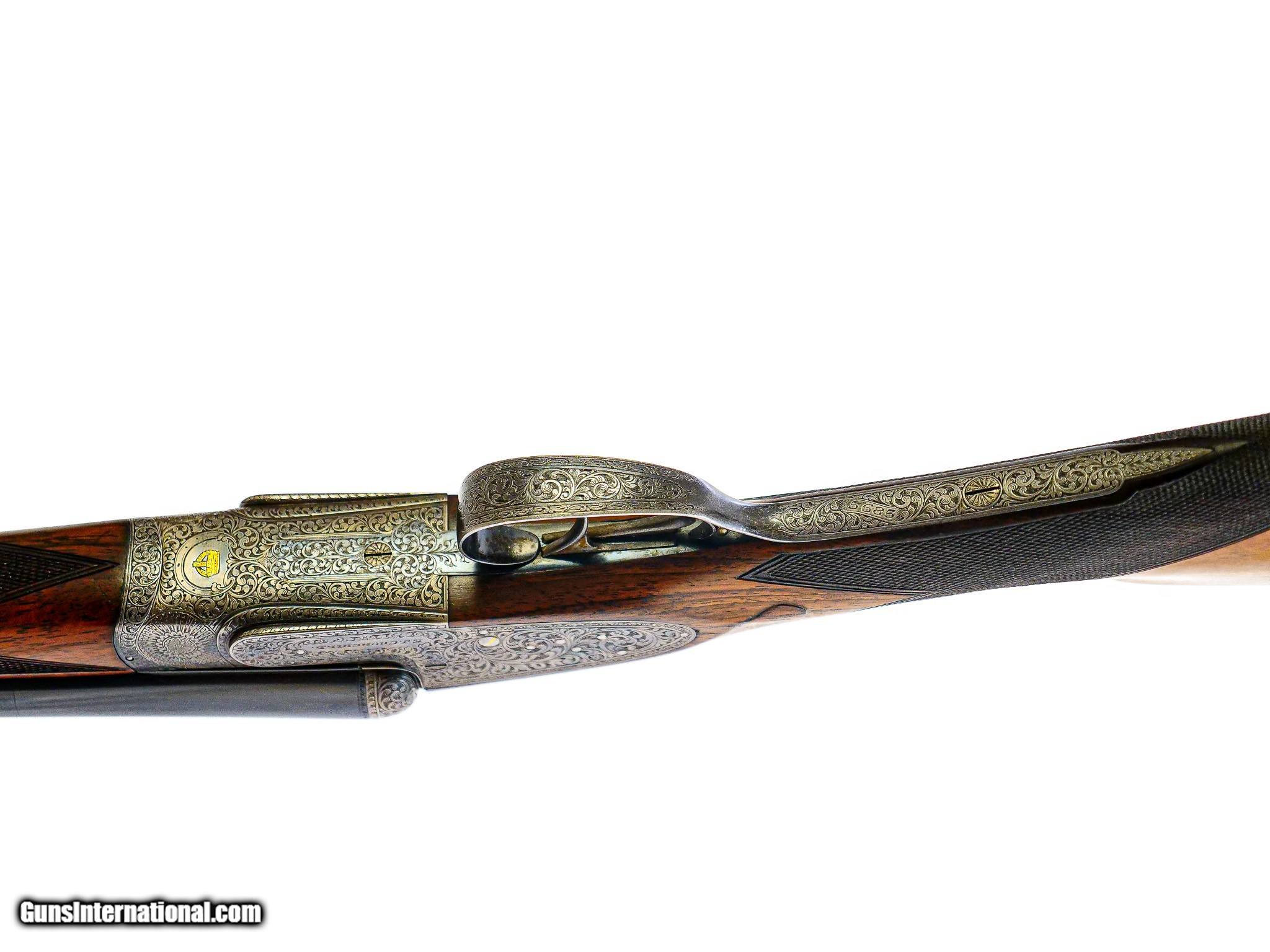 Description: E.J. Churchill - XXV Crown Grade Sidelock Ejector, SxS, 20ga. 25" Barrels Choked IC/M. Straight grip, checkered butt, double triggers, gold oval, automatic ejectors, splinter forend, Orange St., Leichester Square, London address on rib, high condition gun completely untouched with near perfect bluing, wood finish, and strong case coloring, magnificent West London workmanship throughout gun remains in pristine condition throughout, seldom encountered small bore sidelock Churchill. Inv: 27493 5 lbs. 8 oz. 14 5/8" x 1 ½" x 2 3/8" $32,500.00 SOLD |