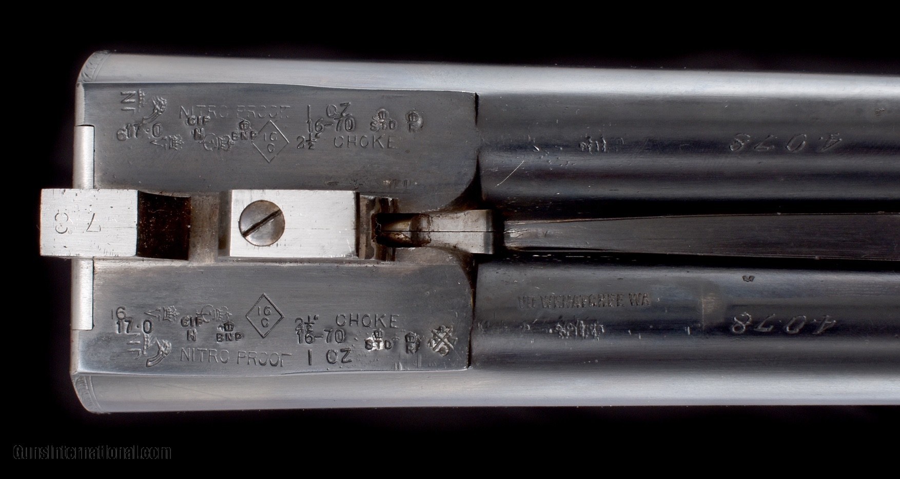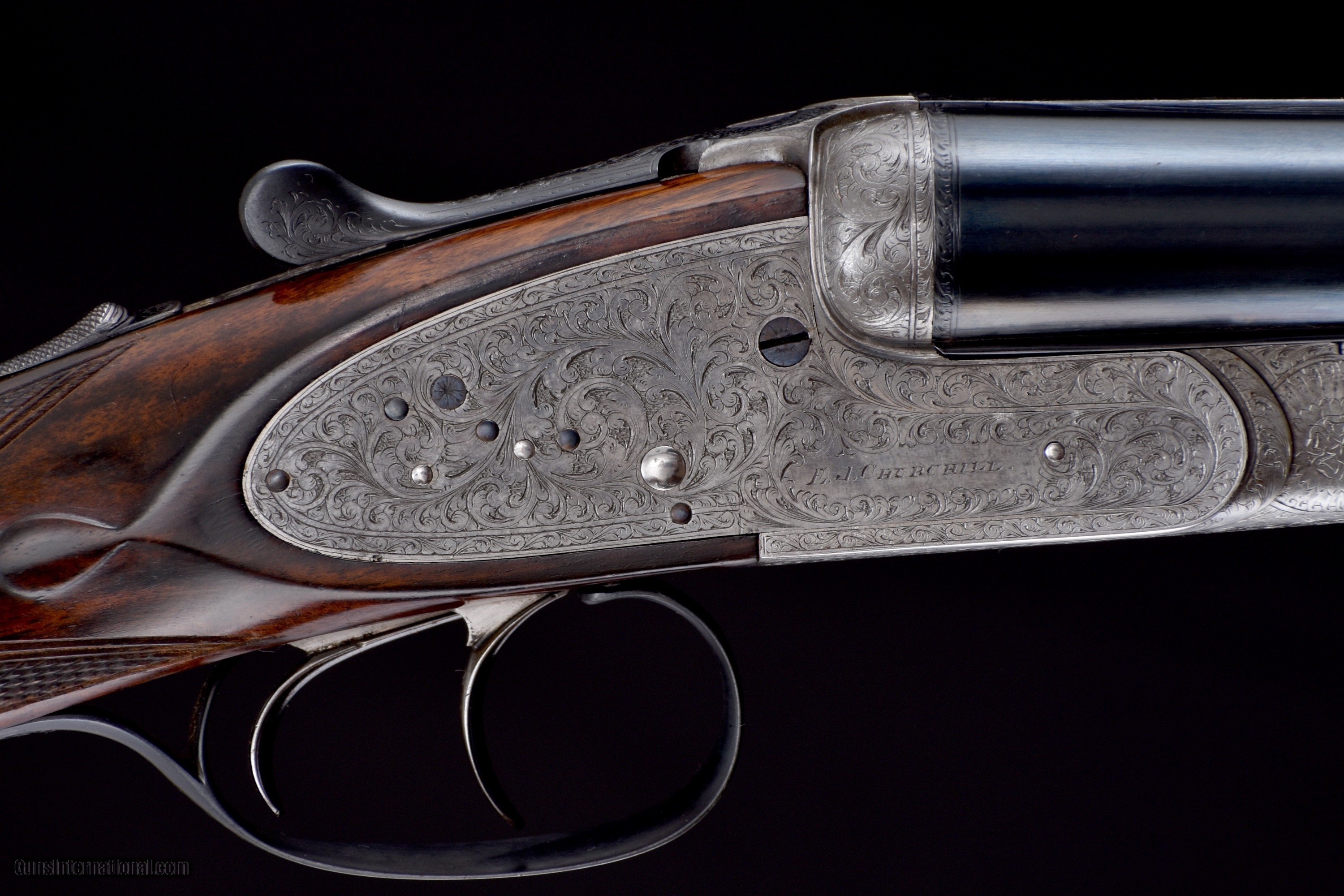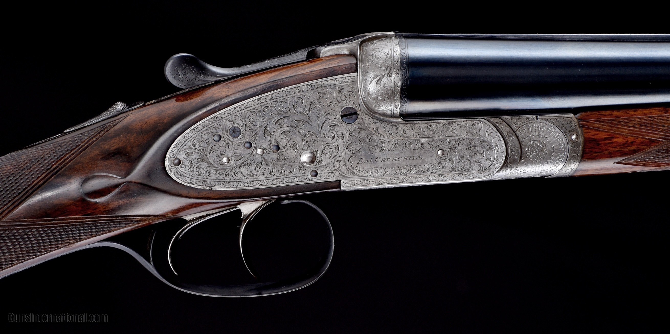 Description: Awesome little grouse and Woodcock "IMPERIAL" quality Churchill 16ga made with XXV (25") barrels that have Churchill rib and gold inlaid "XXV". Full side lock receiver is beautifully engraved in relief scroll and gold inlaid on bottom of frame. Gun made with splinter forend, double triggers, auto ejectors, and auto safety. Very nicely figured straight grip Walnut buttstock which terminates with an aging Silvers pad. Gun is housed in its original "coffin" style leather case. The gun remains in excellent condition. Barrels and wood retain nearly all of their older professionally restored finishes and remain crisp. Barrels are in proof! Frame with crisp engraving. Bores are brilliant and shiny. Mechanics are excellent. Case is very good w/scuffs and leather is drying. Just a super little gun overall! This fine small bore is priced at $12950 plus shipping to your FFL. Please dont hesitate to contact me with any questions or reasonable offers at (704) 280-2382 or via PM on this site. SOLD Curio/Relic: Yes Shotgun Gauge: 16 Gauge Manufacturer: E.J. Churchill Model: Premiere Serial Number: 4078 Barrel Length: 25 Chambers: 2-3/4" (In proof!) Ejectors: Yes Condition: Excellent Metal Condition: Excellent Wood Condition: Excellent Bore Condition: Brilliant and shiny Triggers: Double triggers Stock Comb: 1-1/2 Stock Heel: 2 Stock Cast: 1/4" cast off (Right handed shooter) LOP: 14-1/2 Weight: 5lbs. 10oz. Choke Left: .012 Choke Right: .009 Case: Yes Minimum Wall Thickness Left: Over .025 Minimum Wall Thickness Right: Over .025 |