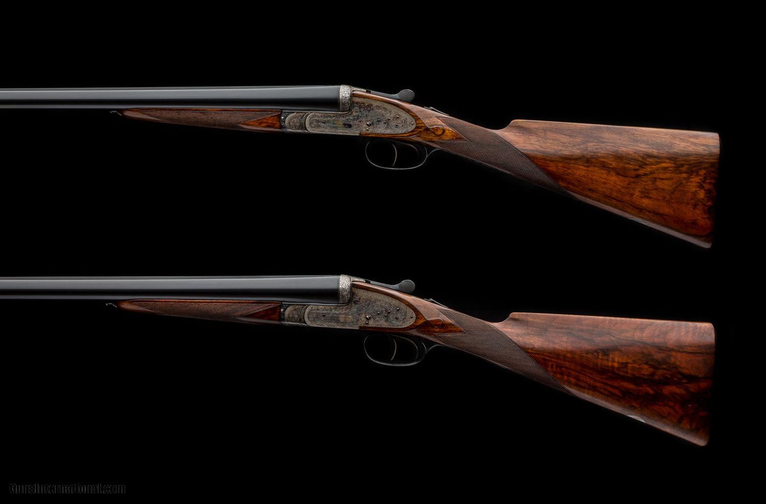 Description: A matched pair of E.J. Churchill Gunmakers Ltd, 12g Crown Grade Sidelock Ejectors with full coverage Arabesque scroll, "SAFE" and numbers "1" and "2" in gold on their respective guns, double triggers, gold lined cocking indicators and automatic safeties. Nicely matched walnut stocks with drop points, checkered butt, which also has engraved gold ovals “JCF”, and the splinter forend has an Anson push rod release. Both guns retain about 90% of their case colours with the wear being on the sharp edges and bottom of the actions. Bores, barrel and wood are 98%. Make: E. J. Churchill Caliber/Gauge: 12g Action: Sidelock Triggers: 2 Ejectors: Yes Barrel Length: 26 1/8" Rib: Engine Turned Raised Rib Chamber: 2 3/4" Choke Right: 1/4 Choke Left: 1/2 Stock: Straight LOP: 13 3/4" Weight: 6lbs 6oz Case: No Case SOLD |
