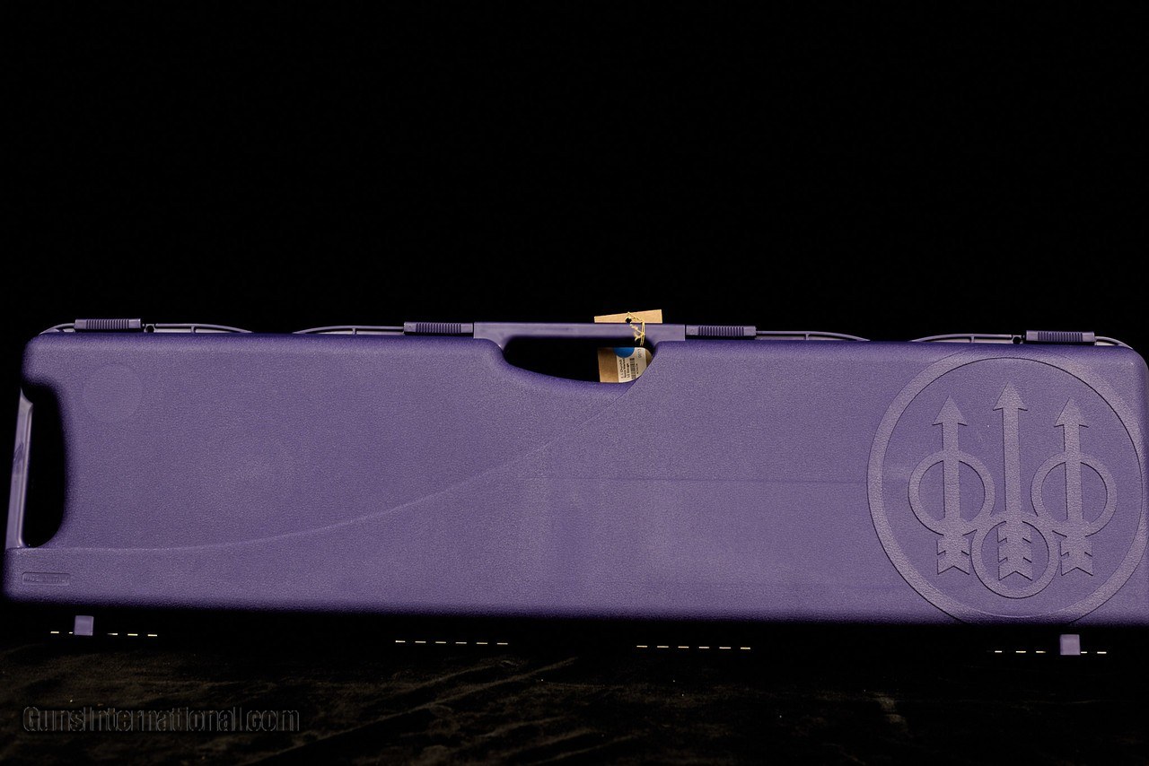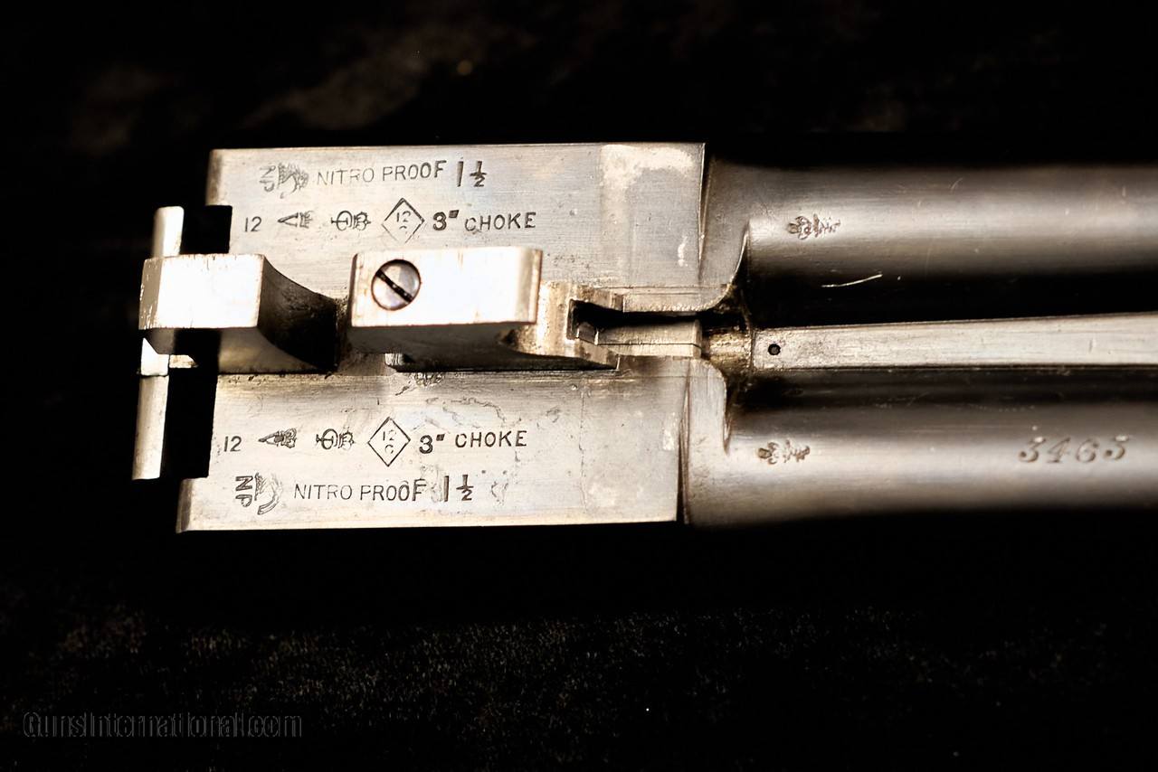 Straight hand grip, double triggers on a boxlock action, Doll’s head third bite, auto-safety, ejectors, gold inlaid “SAFE” ahead of the small button style safety catch, top lever, slightly raised matted concave rib with single front brass bead, checkered wrist and splinter forend with mullered borders, and an Anson push button forend release. The gun is housed in a modern hard plastic case. This circa mid-1920s gun was proofed in London for 1 ½ oz loads with 3” chambers. Chambers measure 3”.