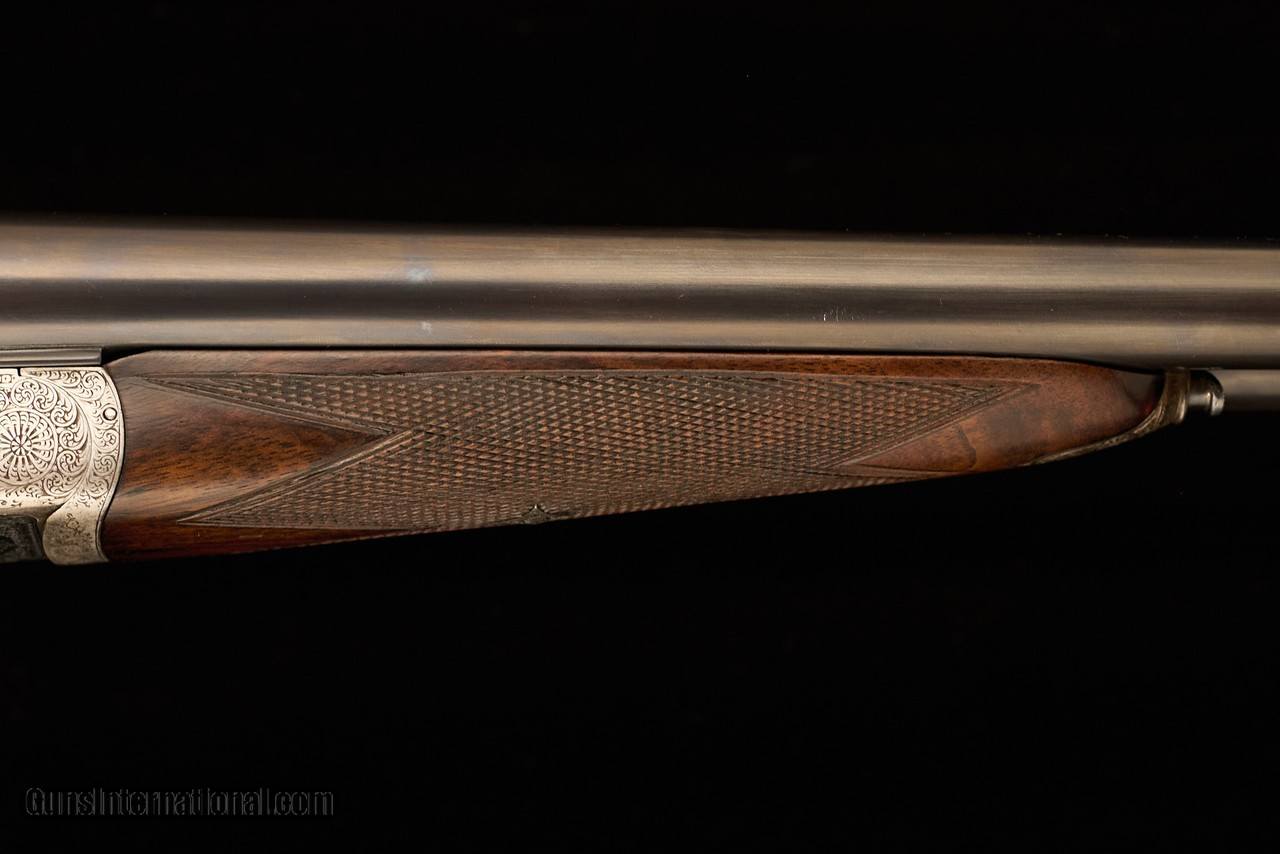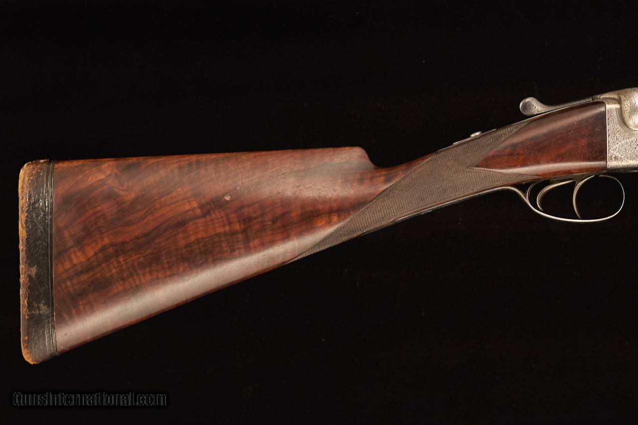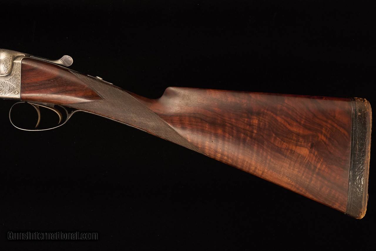 Adorned with scroll engraving with maker’s name in banners on both sides. Silvered action and blued furniture. Well figured walnut stock with some fiddleback. Excellent overall condition. Very good bores with minor frosting and excellent bluing on barrels. Some silvering under the forend and minor rub marks on the barrels. Some wear to the leather covered pad. The wood and checkering in excellent condition with minor scratches and compression marks. Top lever slightly right of center, the gun remains on face, and ejectors in time.