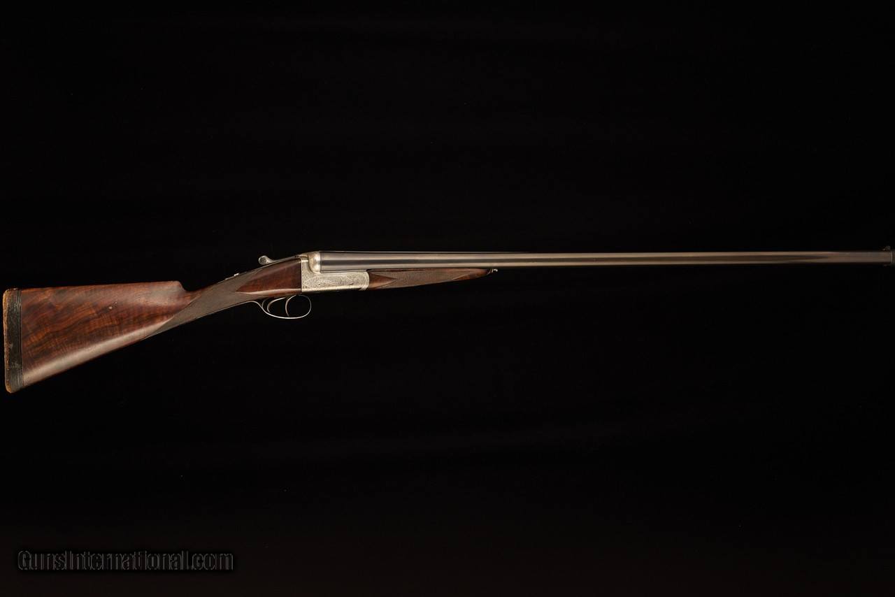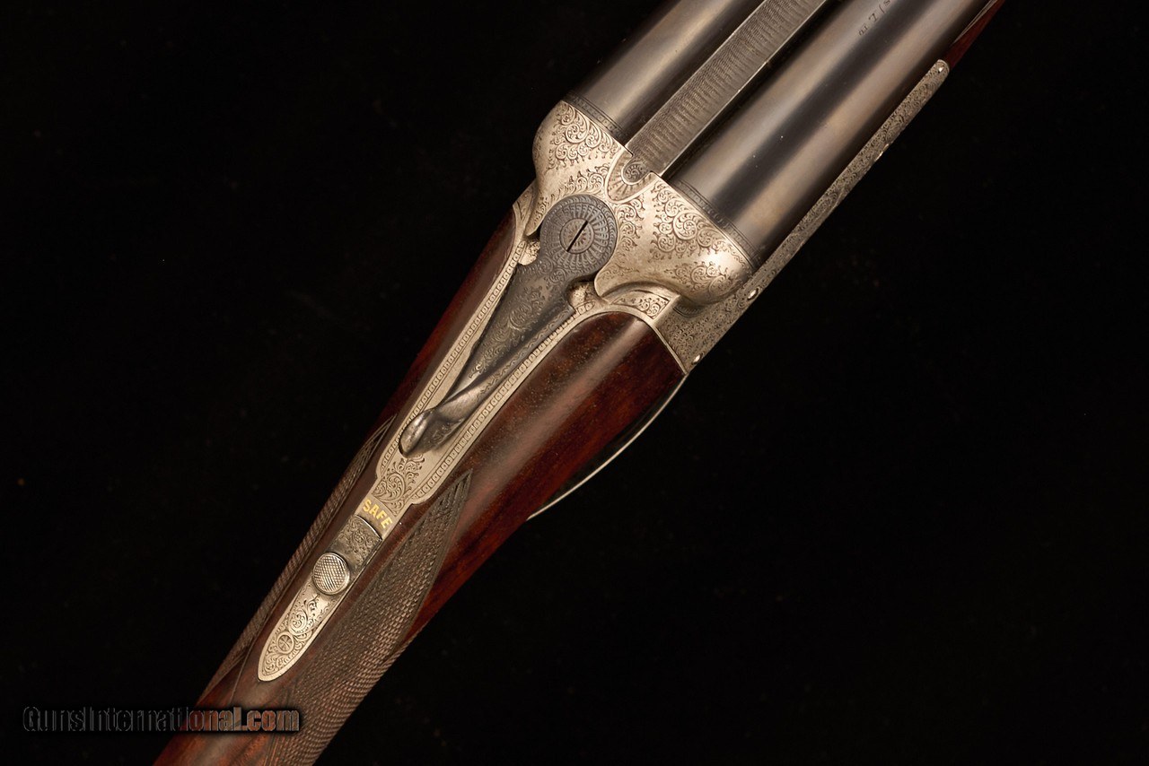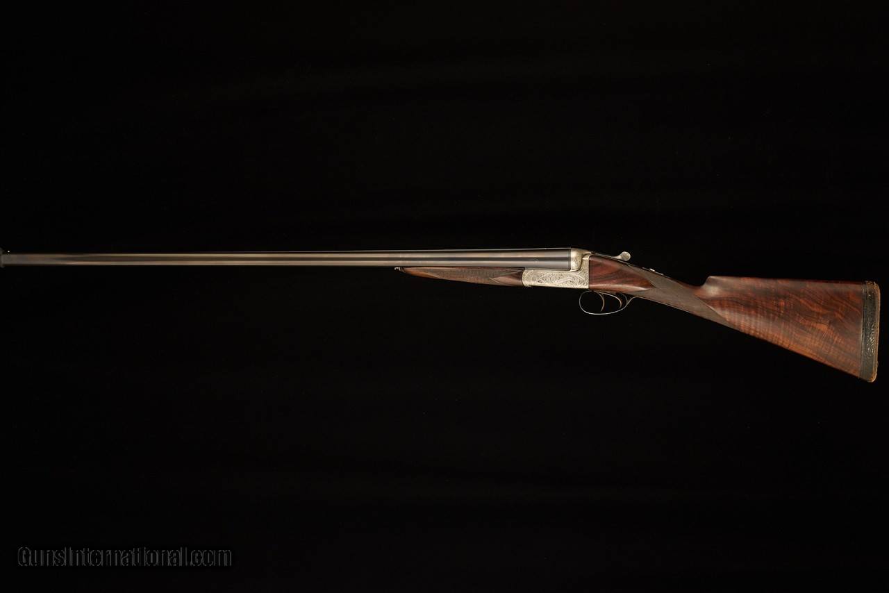 Adorned with scroll engraving with maker’s name in banners on both sides. Silvered action and blued furniture. Well figured walnut stock with some fiddleback. Excellent overall condition. Very good bores with minor frosting and excellent bluing on barrels. Some silvering under the forend and minor rub marks on the barrels. Some wear to the leather covered pad. The wood and checkering in excellent condition with minor scratches and compression marks. Top lever slightly right of center, the gun remains on face, and ejectors in time.