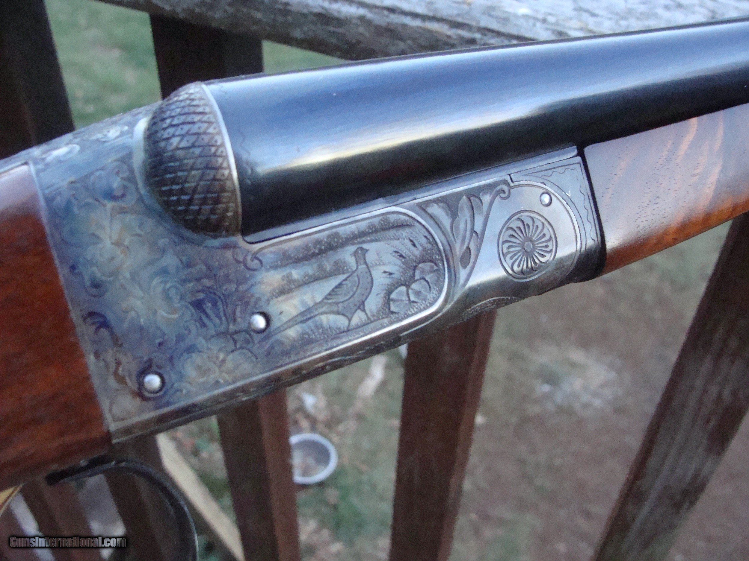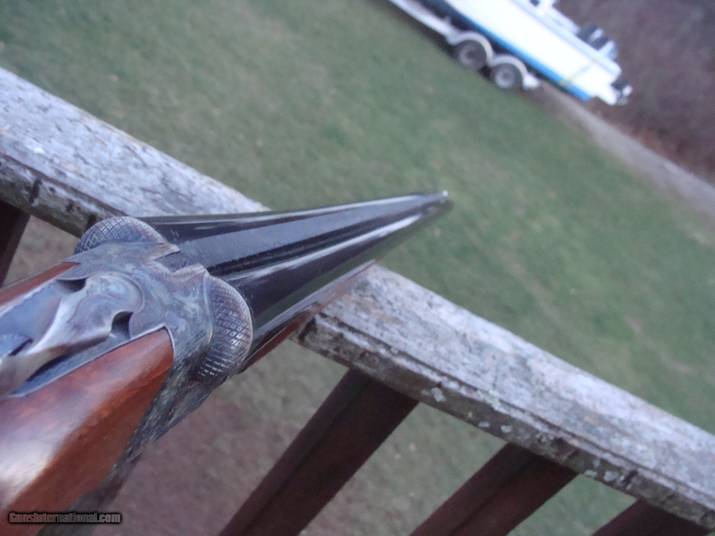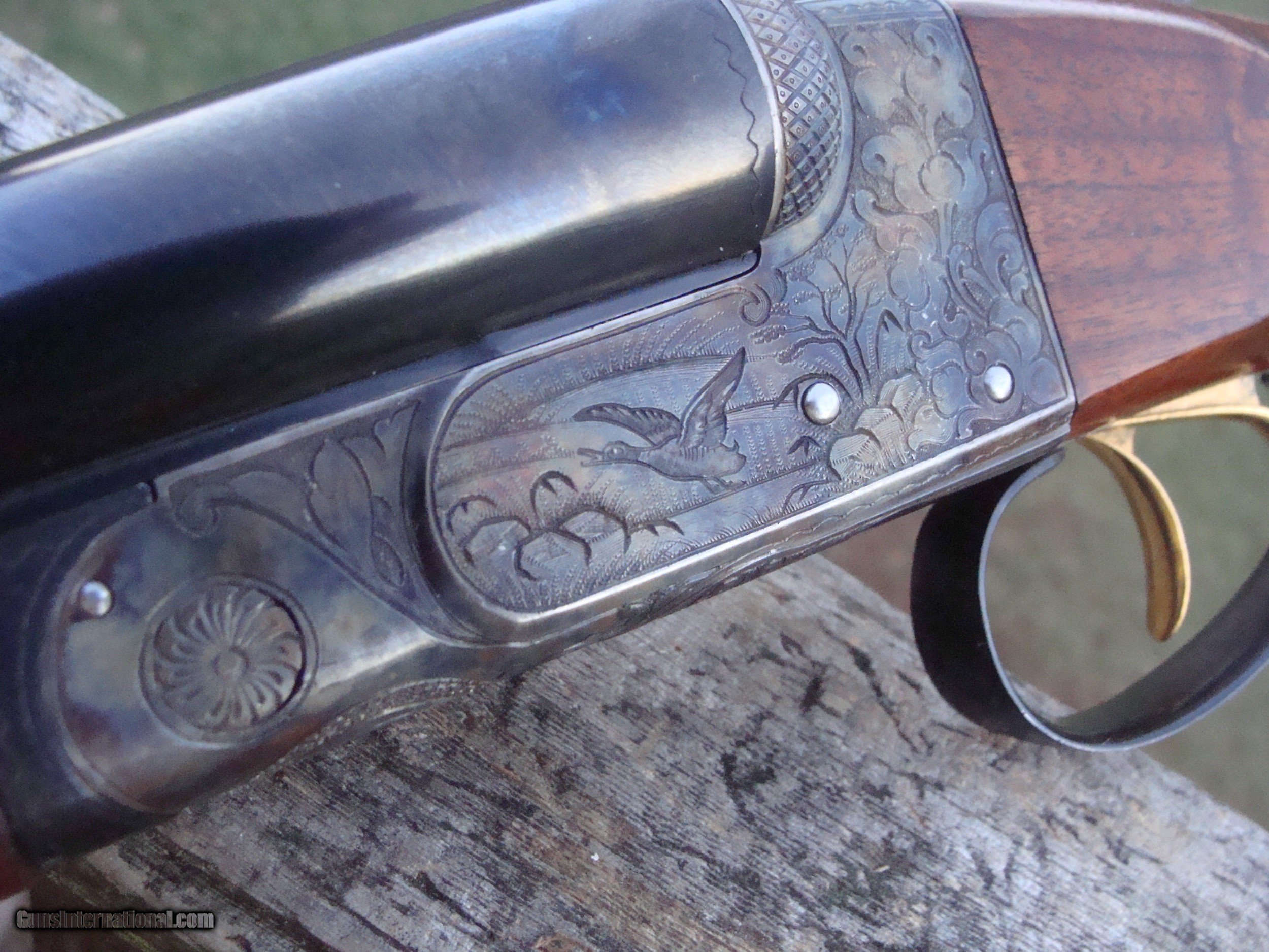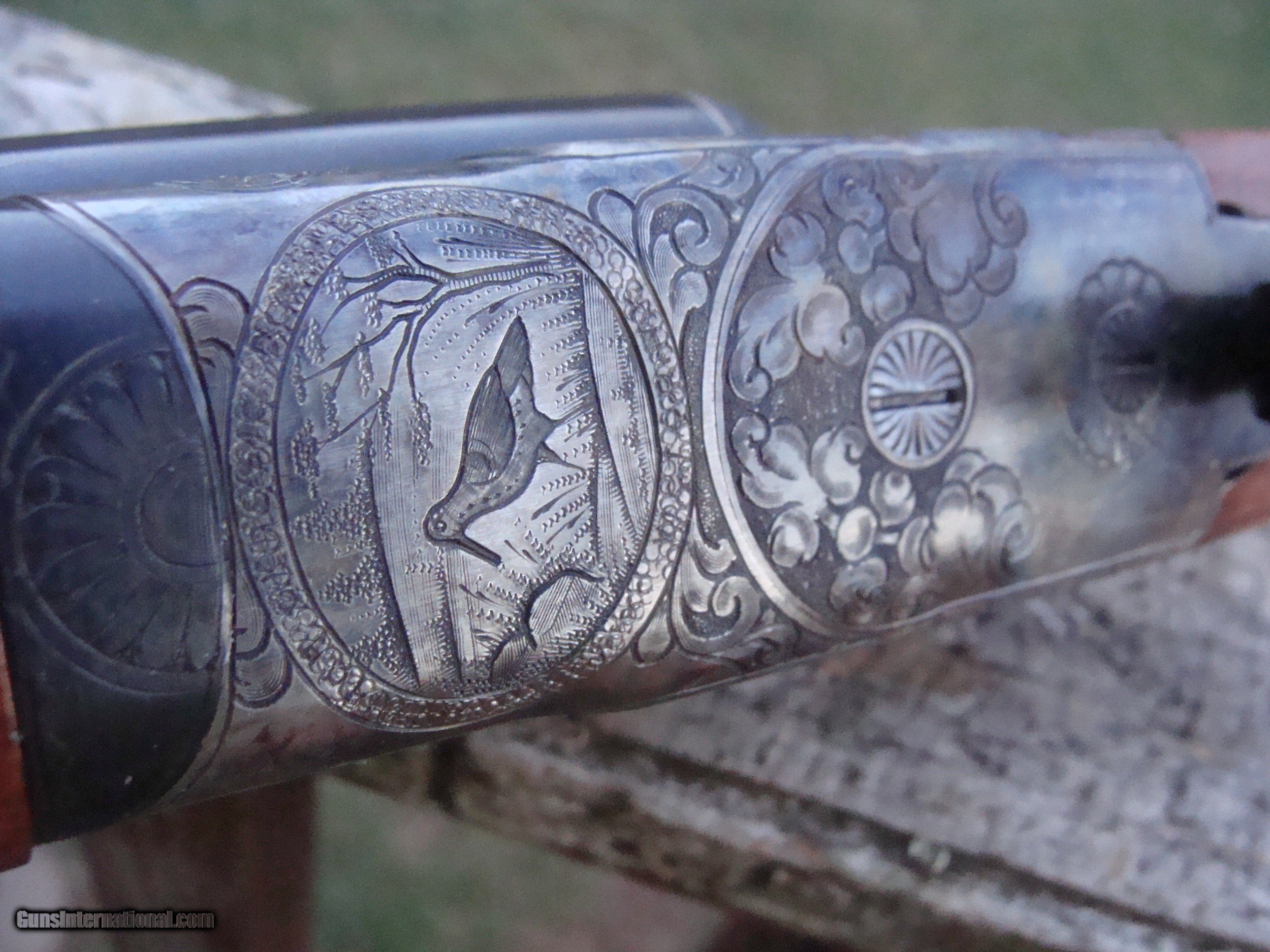 Description: Made Briefly with only approx 1000 made. Essentially a hand made gun resembling higher grade Parker Repro's. Deep Case Corlorored receiver is fully engraved with flying duck left side, snipe on the bottom and pheasant rite. It is belived that the case colors were done by Turnbull.. The rest of receiver is covered in floral . Handsome strait stock with nicely figured American Walnut, factory pad with nicely done fleur de list checkering showing no wear. LOP to end of Factory Pad is 15 and 14 1/8 approx to end of wood. Splinter forend with ebony inlet at end Solid filed solid ribe 28" barrel. Weights 6 1/2 lbs, points and swings beautiully . Would make a terrific Pheasant, quail, dove or grouse gun that anyone would be proud to own This fine US Made double is in as new cond. and is being offered for thousands less than others identical to it. WE DO NOT REPLY TO INQUIRIES THAT SAY "INTERESTED IN THIS GUN" OR "IS IT AVAILABLE" IF YOU WOULD LIKE TO BUY THIS OR ANY OF OUR GUNS WE SUGGEST YOU PHONE US; WE ARE OFTEN AVAIALABLE LONG HOURS. IF THIS OR ANY OF OUR LISTINGS DOES NOT SAY NEXT TO THE PRICE "SALE PENDING" IT IS AVAILABLE IF YOU ARE INTERSTED IN A GUN THAT IS UNDER DEPOSIT AND WOULD LIKE TO BE NOTIFIED IF A SIMILAR GUN COMES IN DROP US A LINE AND WE WILL MAKE EFFORTS TO CONTACT YOU WHEN ONE DOES COME IN. WE HAVE OVER 1500 SALES ON ALL SITES WITH AN A+ RATING ON ALL WE ALSO KEEP AN INVENTORY OF OLDER PERIOD CORRECT SCOPES; CALL WITH NEEDS WE MOSTLY PICK VERY CLEAN AND LIGHLTY USED GUNS. WE ARE HAPPY TO TAKE CONSIGNMENT GUNS AND COLLECTIONS OR WILL BUY YOURS OUTRIGHT. WE SOMETIMES ARE EMPLOYED FOR ESTATE PURPOSES AND VALUATIONS. CT RESIDENTS MUST CONTACT US TO UNDERSTAND OUR IN STATE TRANSFER POLICIES. WE CAN TAKE A CREDIT CARD HOWEVER THERE IS A 3% ADD ON BASED ON THE TOTAL FOR USE OF A CARD. IT IS ALWAYS THE BUYERS RESPONSIBILITY TO GET US A COPY OF YOUR RECEIVING FFL'S LIC AND WE REQUIRE A COPY OF YOUR PHOTO ID BEFORE THE GUN SHIPS YOU MUST CALL YOUR FFL.WE DO NOT CALL FOR YOU. LAYAWAY PURCHASES NOT COMPLETED OR ANY RETURNED ITEM UNLESS NOT AS DESCRIBED OR DAMAGED ARE SUBJECT TO A 10% RELISTING/RESTOCKING FEE AND MUST BE RETURNED WITH NO NEW MARKS OR SCRATCHES, SENT BACK INSURED, PRIORITY SIGNATURE REQUIRED SOLD |
