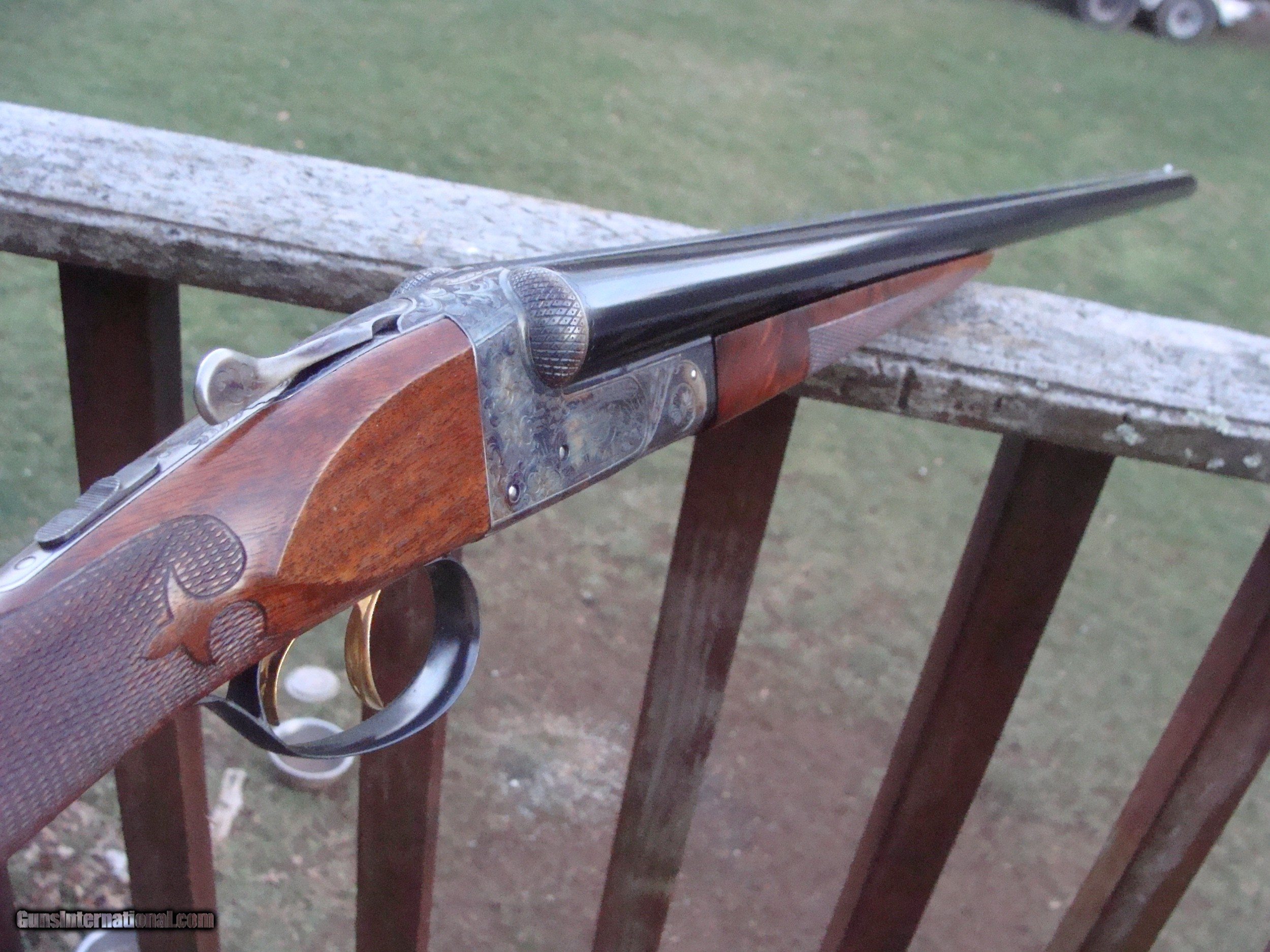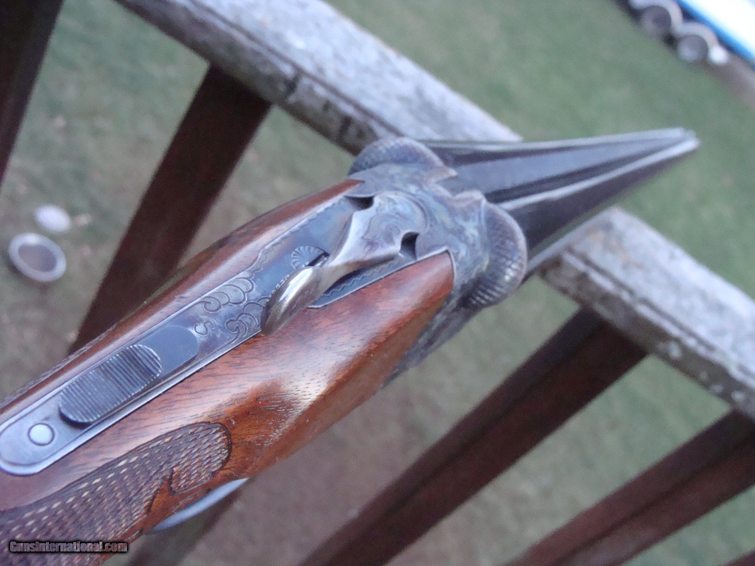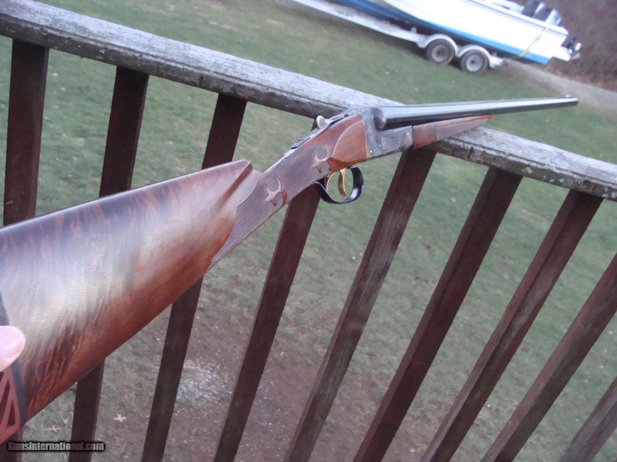 Description: Made Briefly with only approx 1000 made. Essentially a hand made gun resembling higher grade Parker Repro's. Deep Case Corlorored receiver is fully engraved with flying duck left side, snipe on the bottom and pheasant rite. It is belived that the case colors were done by Turnbull.. The rest of receiver is covered in floral . Handsome strait stock with nicely figured American Walnut, factory pad with nicely done fleur de list checkering showing no wear. LOP to end of Factory Pad is 15 and 14 1/8 approx to end of wood. Splinter forend with ebony inlet at end Solid filed solid ribe 28" barrel. Weights 6 1/2 lbs, points and swings beautiully . Would make a terrific Pheasant, quail, dove or grouse gun that anyone would be proud to own This fine US Made double is in as new cond. and is being offered for thousands less than others identical to it. WE DO NOT REPLY TO INQUIRIES THAT SAY "INTERESTED IN THIS GUN" OR "IS IT AVAILABLE" IF YOU WOULD LIKE TO BUY THIS OR ANY OF OUR GUNS WE SUGGEST YOU PHONE US; WE ARE OFTEN AVAIALABLE LONG HOURS. IF THIS OR ANY OF OUR LISTINGS DOES NOT SAY NEXT TO THE PRICE "SALE PENDING" IT IS AVAILABLE IF YOU ARE INTERSTED IN A GUN THAT IS UNDER DEPOSIT AND WOULD LIKE TO BE NOTIFIED IF A SIMILAR GUN COMES IN DROP US A LINE AND WE WILL MAKE EFFORTS TO CONTACT YOU WHEN ONE DOES COME IN. WE HAVE OVER 1500 SALES ON ALL SITES WITH AN A+ RATING ON ALL WE ALSO KEEP AN INVENTORY OF OLDER PERIOD CORRECT SCOPES; CALL WITH NEEDS WE MOSTLY PICK VERY CLEAN AND LIGHLTY USED GUNS. WE ARE HAPPY TO TAKE CONSIGNMENT GUNS AND COLLECTIONS OR WILL BUY YOURS OUTRIGHT. WE SOMETIMES ARE EMPLOYED FOR ESTATE PURPOSES AND VALUATIONS. CT RESIDENTS MUST CONTACT US TO UNDERSTAND OUR IN STATE TRANSFER POLICIES. WE CAN TAKE A CREDIT CARD HOWEVER THERE IS A 3% ADD ON BASED ON THE TOTAL FOR USE OF A CARD. IT IS ALWAYS THE BUYERS RESPONSIBILITY TO GET US A COPY OF YOUR RECEIVING FFL'S LIC AND WE REQUIRE A COPY OF YOUR PHOTO ID BEFORE THE GUN SHIPS YOU MUST CALL YOUR FFL.WE DO NOT CALL FOR YOU. LAYAWAY PURCHASES NOT COMPLETED OR ANY RETURNED ITEM UNLESS NOT AS DESCRIBED OR DAMAGED ARE SUBJECT TO A 10% RELISTING/RESTOCKING FEE AND MUST BE RETURNED WITH NO NEW MARKS OR SCRATCHES, SENT BACK INSURED, PRIORITY SIGNATURE REQUIRED SOLD |