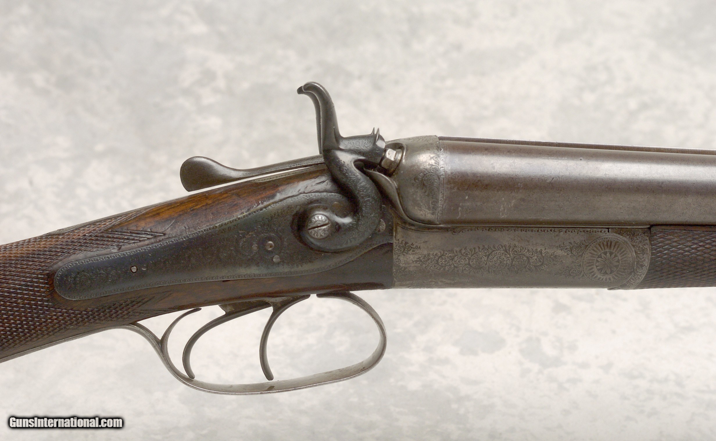 Description: Here is nicely preserved Cogswell-Harrison of London double hammer 16 ga. shotgun produced around the turn of the last century. It has 30 inch Damascus barrels with extractors. It has a bead front sight. The roll mark on the rib between the barrels is almost completely worn away. The bores are still clean and bright. The barrels and action finishes have aged to a deep gray patina. There is no rust or serious pitting but there are some small dings that are superficial and only in the finish. It has a lever operated splinter forend with checkering all around and still good sharpness. The stock is a straight English style with hand engraving in the grip area. It also still retains good texture. The stock is finely grained and finished in a semi-gloss indicating that it has been refinished in the past. It has dual triggers and wears a black hard rubber butt plate. The action appears to function correctly and the hammer strike is strong. It comes with tools and a yellow canvas fitted case. LOP is 12.5 inches to the rear trigger and 13.5 inches to the front trigger. The barrels are choked IC and modified. This is an exceptionally nice old shotgun considering it's age. It's light in weight and nicely balanced. Cogswell-Harrison is London's oldest Gunmaker, founded in 1770. Damascus barrels though, no high powered shells! SOLD Curio/Relic: Yes |