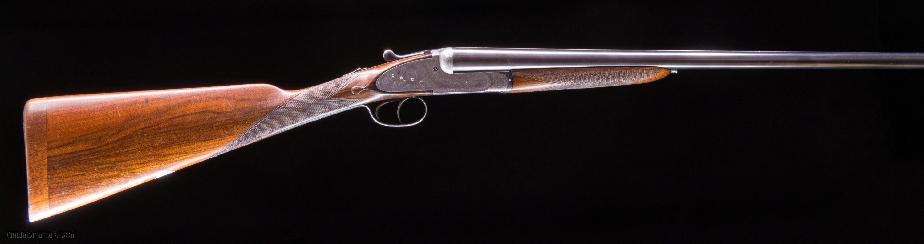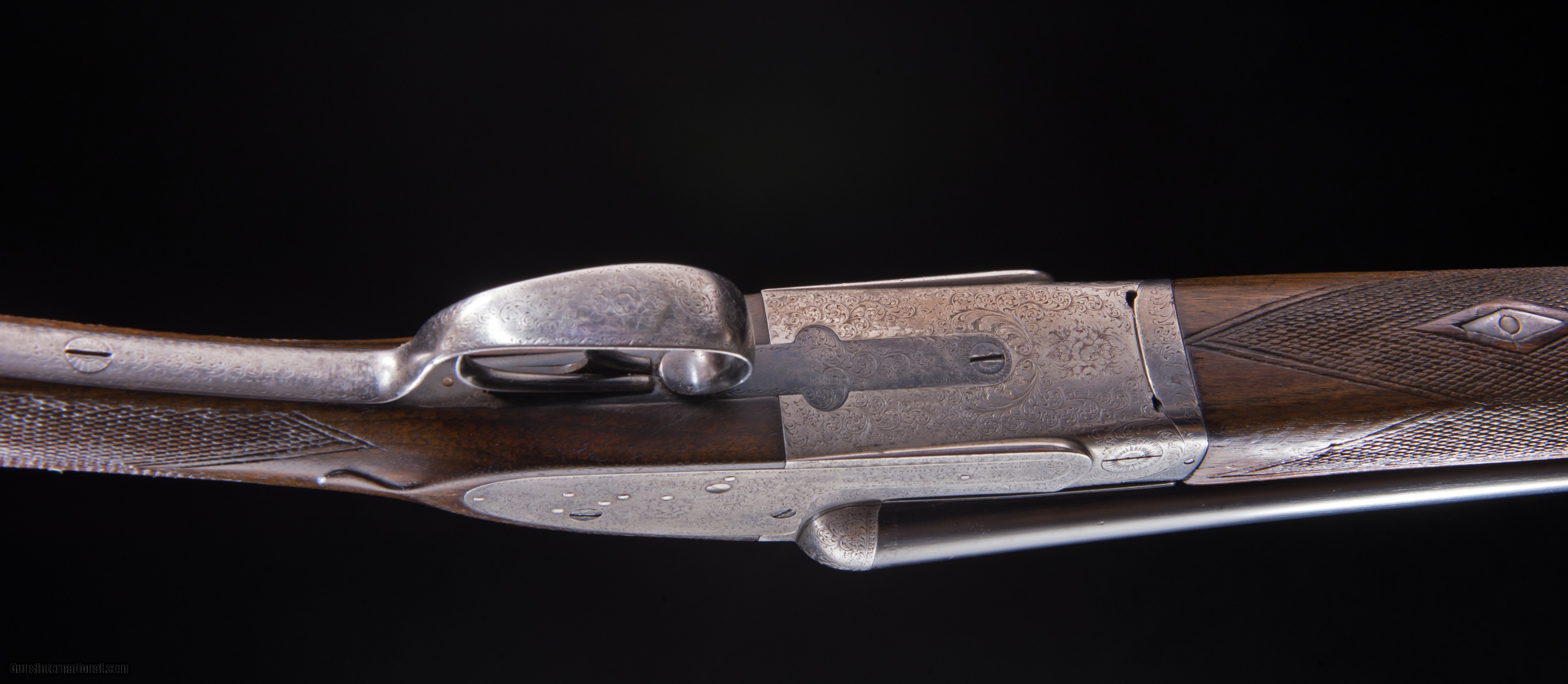 Description: Hammerless Sidelocks - A solid and tight little 16g. sidelock. She shows some handling marks as you can see in the photo\'s but I actually like her just as she is. The Balance is excellent and the gun comes up and swings very natural. For those that like a recoil pad the well matched wood extension can easily be removed and a pad of choice installed. *** Note: To see this gun with high resolution photos and a zoom-in feature, go to the vintagedoubles main site and search for the gun ID: 4162 or browse the main site to see our full gun collection. |