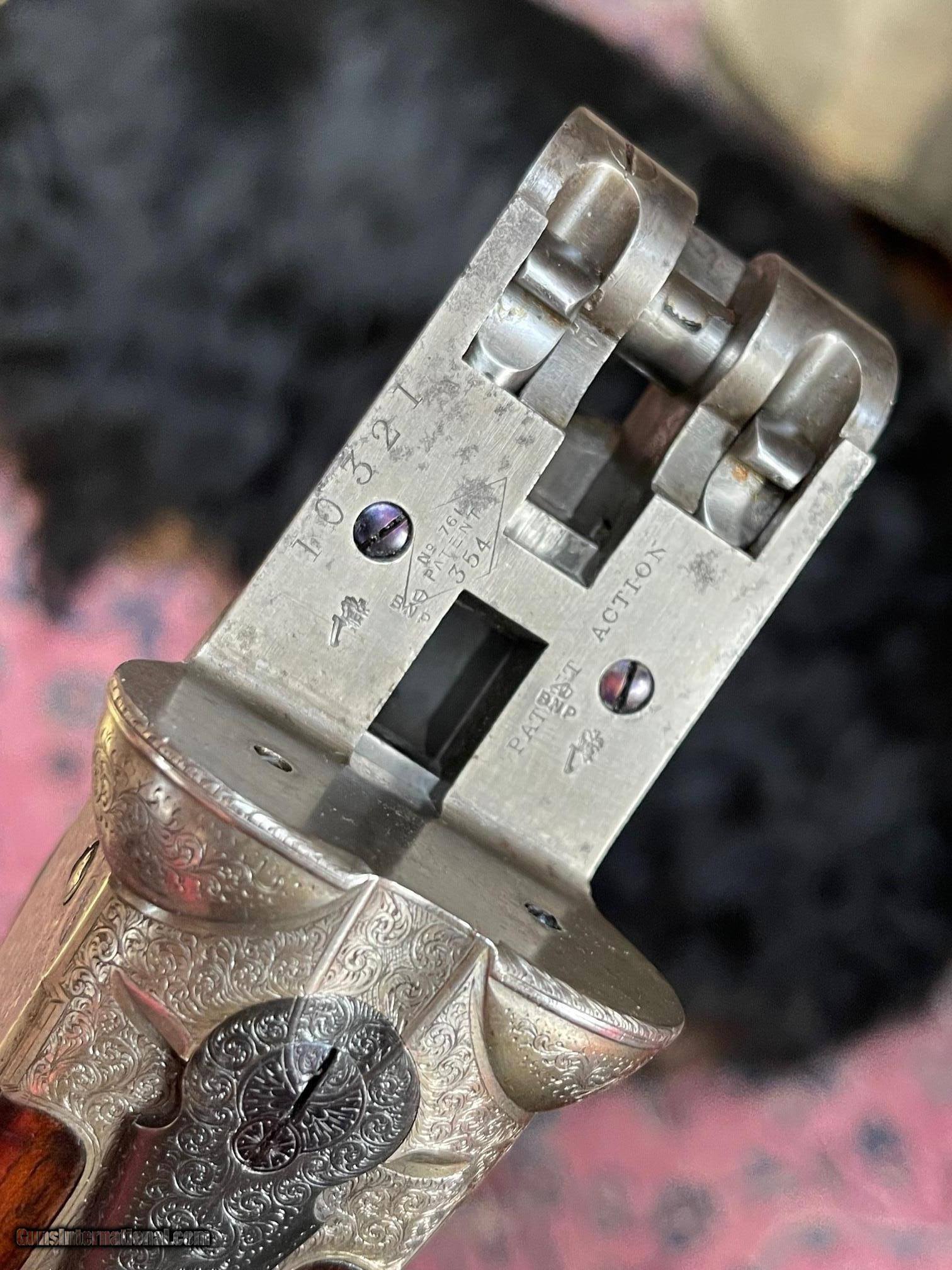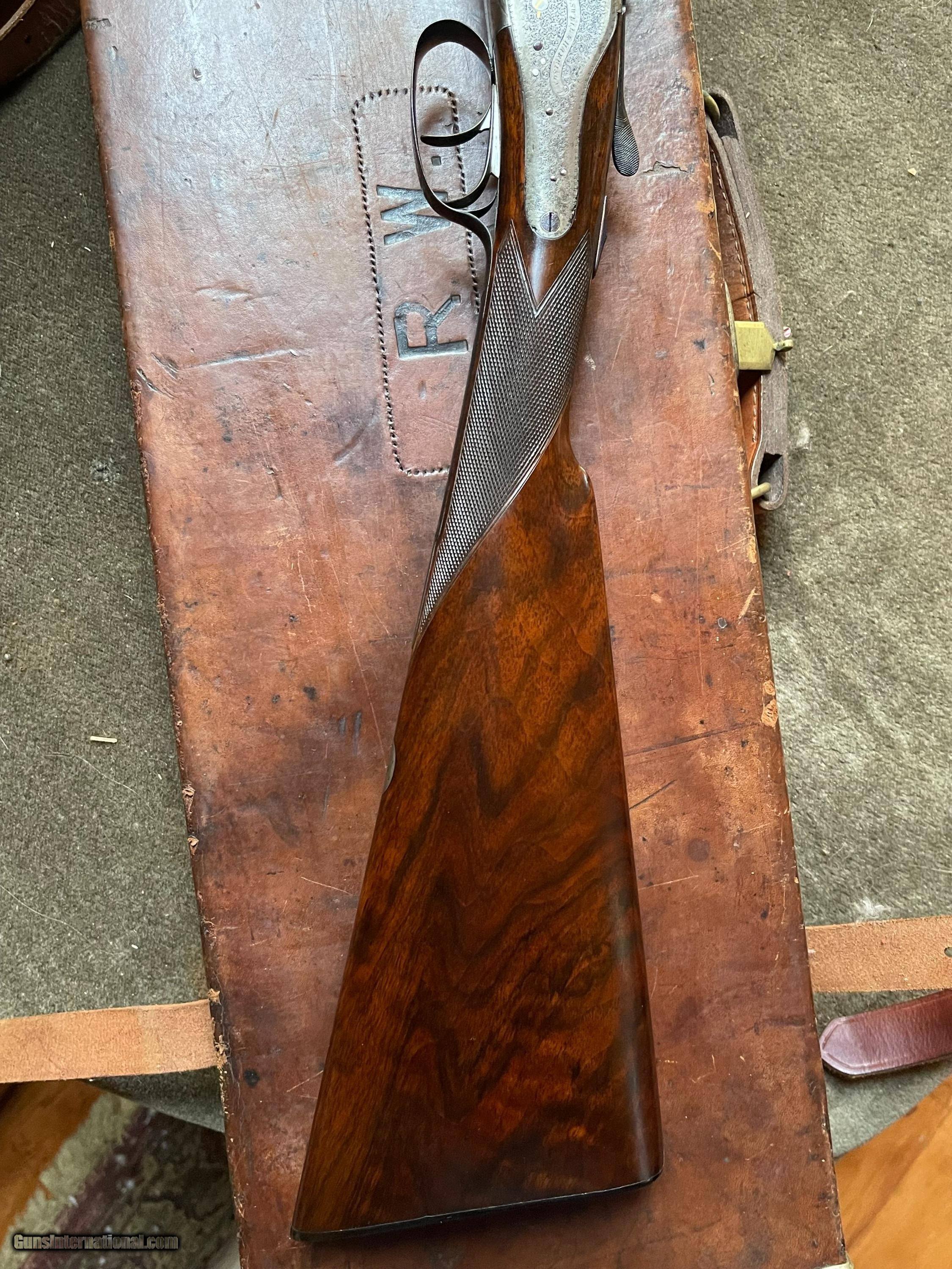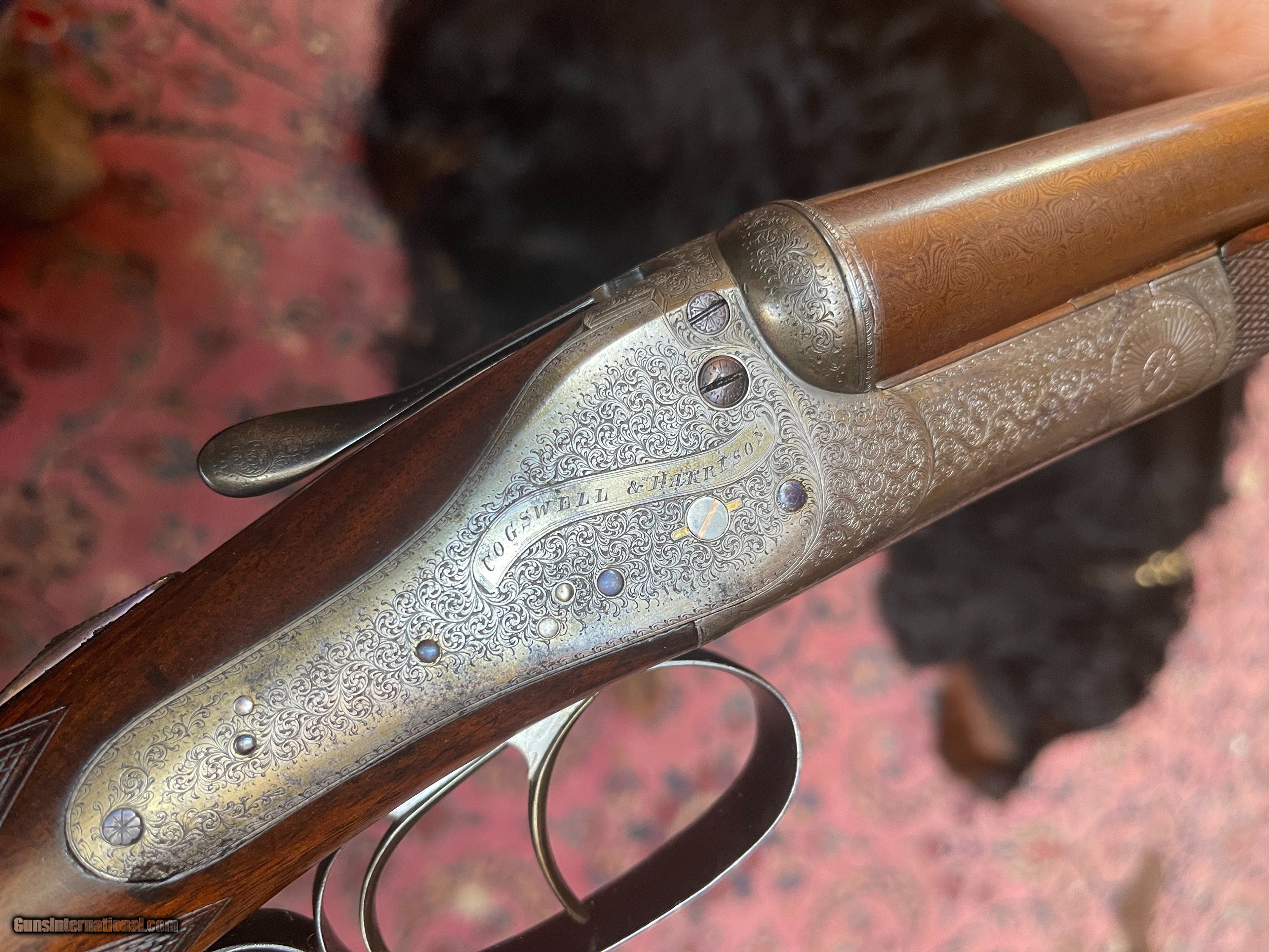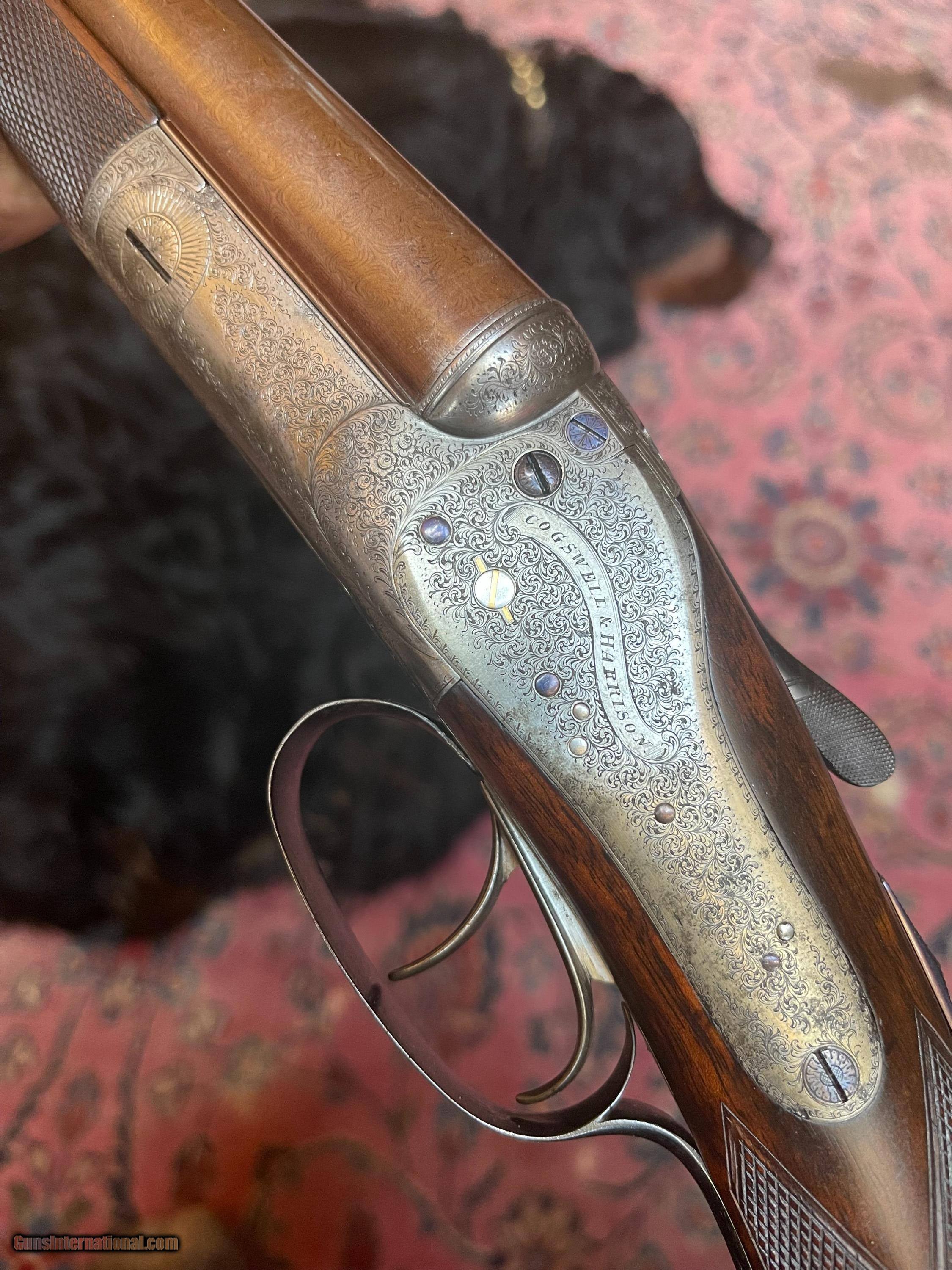 Description: COGSWELL & HARRISON, 20 b., EARLY "VICTOR" MODEL, MADE IN 1880 (Victor Models first introduced in 1879). This is a Scott patented back-action "Victor" full sidelock ; likely one of the first made in this small gauge which is rare in any English shotgun. Original Damascus barrels have updated "BNP" nitro proofs (see pix) and measure 28-1/8", have 2-1/2" chambers, and are in excellent condition inside and out. Min. barrel-wall thicknesses are at least 20 thousandths at the very IC/IC muzzle, where there is little pressure. Then graduating to 30 and much greater when measuring towards the chambers. Nevertheless, I have always shot low pressure RST cartridges in all my guns -- and since this one was built in 1880 it has been fed with black powder and obviously cleaned well, for at least a many years prior to my 20 years as owner ...it has been with me since I purchased it from Holt's in England --- this gun has been void of the black powder and babied throughout its Nitro years ! English stock has: 14-3/8" LOP, 1-1/2" DAC; 2" DAH. This gun weighs 5lb.-10 Oz. and is originally cased with label and letter. We have published many articles and photos of Cogswell & Harrison guns throughout our 32 years in publication, and you can find all those articles, photos, and mentions--plus much more new never published- reading in our hardbound Double Gun Journal Index & Readers. The one Cogswell & Harrison article that stands out for me was written by Geoffroy Boothroyd (James Bond's Armourer To The Queen). See: "Cogswell & Harrison, Ltd., London, England ", The Double Gun Journal, Volume 8-Issue 3, pp. 101-107 If you have any questions or requests, contact me through Guns International messaging service. Thank you for looking, >>THIS GUN HAS NOW BEEN SOLD, BUT WILL REMAIN FOR THE INTEREST OF ENTHUSIASTS << Daniel Philip Cote' Note to buyer: Two new pix show cocking rods shown retracted and extended for barreling. Letter indicates my first inquiries made in 2000, concerning monogram "CHC" on case -- no name found in records due to factory fire -- no proof found that this gun was made for a "Churchill ". Price removed as per buyer's request. Oh, and this gun has a 1/2" cast off. Publisher, DGJ SOLD Antique: Yes Manufacturer: Cogswell & Harrison Bore: 20 Condition: Excellent Barrel Type: DAMASCUS Manufacture Date: 1880 |