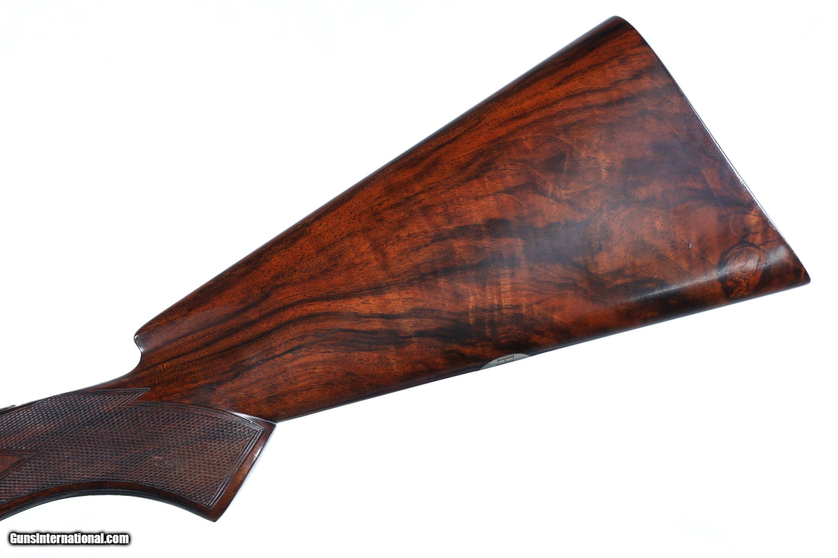 Description: Sideplated Boxlock with double triggers and ejectors. 2 3/4" chambers, choked Imp Cyl/Skeet, case colored sideplated receiver with game scenes on left and right side, with blue finished base plate and trigger guard. English oil finished checkered pistol grip stock of highly figured English walnut with beaver tail forearm. LOP 14 1/2", DAC 1 5/8", DAH 2 1/4". Housed in makers marked leather travel case with complement of cleaning tools. Gun remains in excellent condition as English refreshed. Stocks are excellent, mechanically excellent. Case is very fine. Mfg in 1954 • Free Shipping, No Credit Card Fees. • Lay-a-way available for this firearm. • 1/3 Down, a 1/3 in 30 Days 1/3 in 60 Days. SOLD Manufacturer: Cogswell & Harrison Model: Konor Serial Number: 18669 Barrel Length: 26 |
