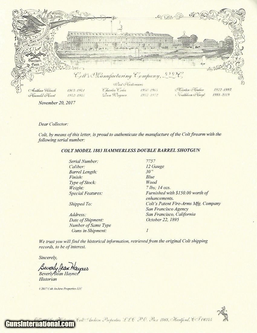 Description: Factory Letter SOLD Antique: Yes Manufacturer: Colt Model: 1883 Serial Number: 7757 Barrels: 26 inches Action: SE Triggers: Double Trigger Gauge Info: 12 Gauge Fore End: Splinter LOP: 14 1/4 inches Weight: 8 lbs. |