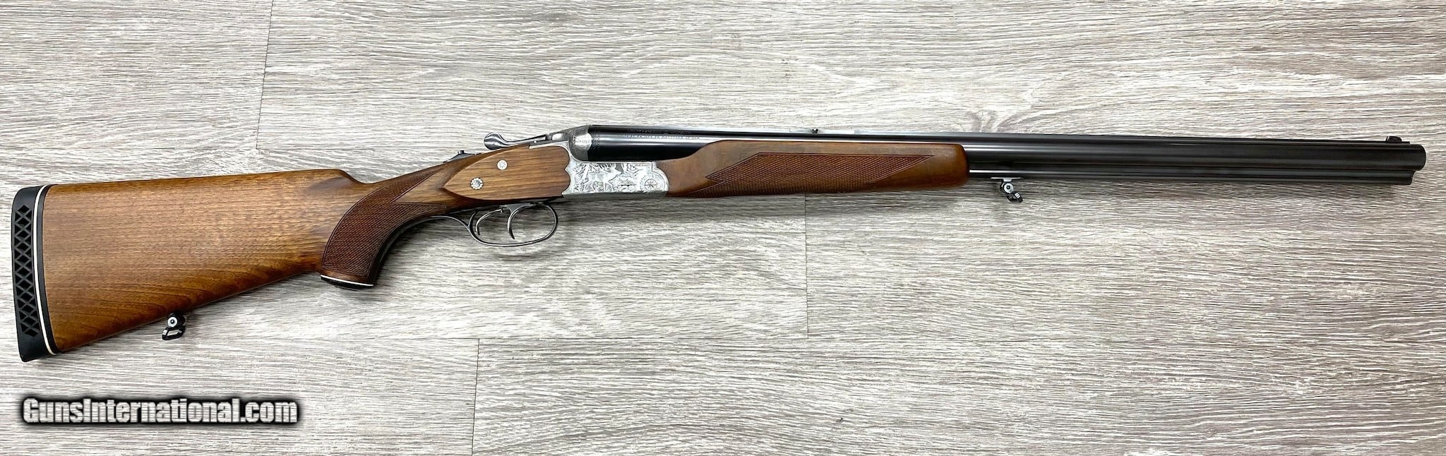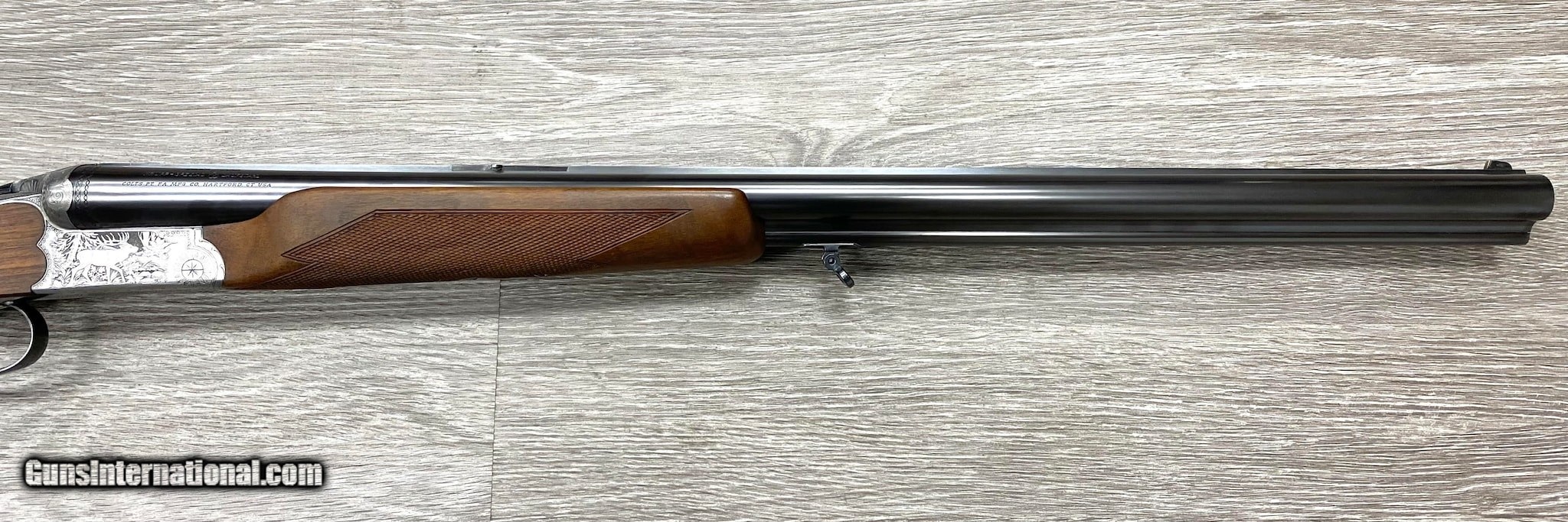 Description: Guns Listing ID: 1063194 Factory Game Scene Engraved Colt-Sauer Model 3000 Drilling Manufacturer: Sauer J P & Son Model: 3000 Type: Shotgun Gauge: 12/30-06 Barrel: 25 inch solid rib Finish: blue/coin Stock: walnut Serial Number: GG9089 Class: Modern Long Gun Manufactured in 1976. Blade front and flip-up notch rear sights on the matted solid rib, standard maker and model markings, 2 3/4 inch chambers with extractors, light engraving around the breech, and modified/full marked chokes. Coin gray receiver is engraved with forested game scenes on either side showing a running deer on the left and a standing stag on the right, and features cocking indicators, dual triggers (front is a single set), tang mounted selector switch, and Greener style safety. Checkered beavertail forend with engraved fittings and Deeley latch release and pistol grip stock with ventilated recoil pad. Length of pull is 14 7/16 inches. Weight 7 lbs. 13 oz. Excellent overall, retaining 99% original blue and coin finishes with minor handling evidence and sharp checkering on the stock and forend. Mechanically excellent. Manufacturer: Colt Sauer Model: 3000 Type: Shotgun Gauge: 12/30-06 Barrel: 25 inch solid rib Finish: blue/coin Stock: walnut Serial Number: GG9089 Class: Modern Long Gun SOLD Manufacturer: COLT Model: 3000 DRILLING Condition: Used - Non-Certified Barrels: 25.5 BARREL Gauge Info: 12 GA Finish: BLUED W/ ENGRAVING |