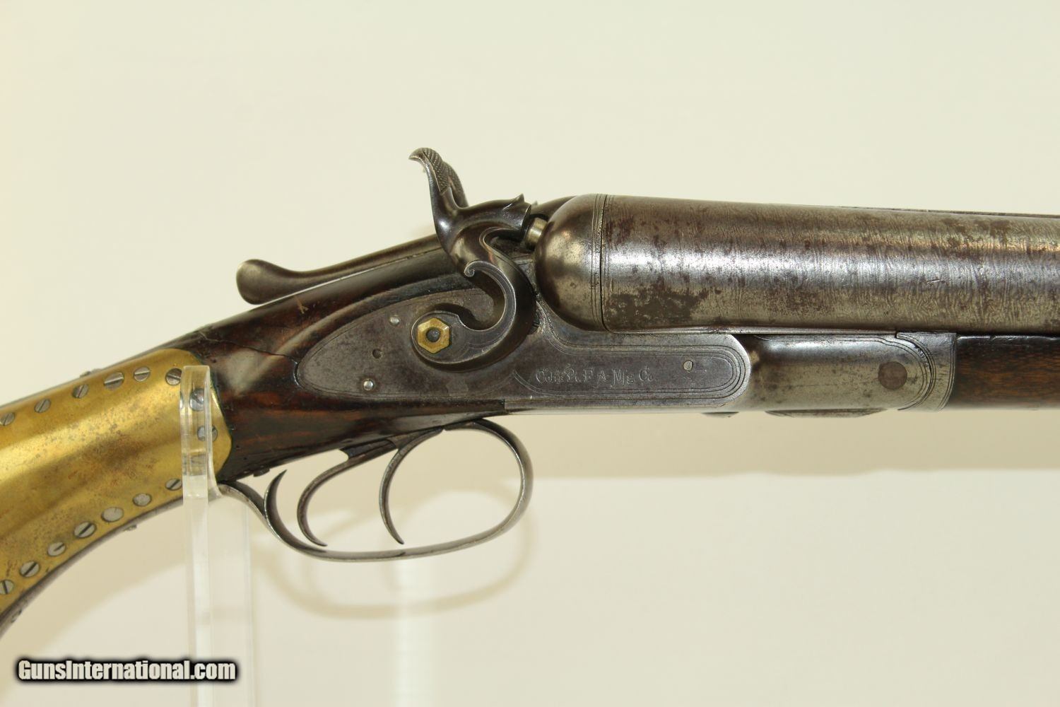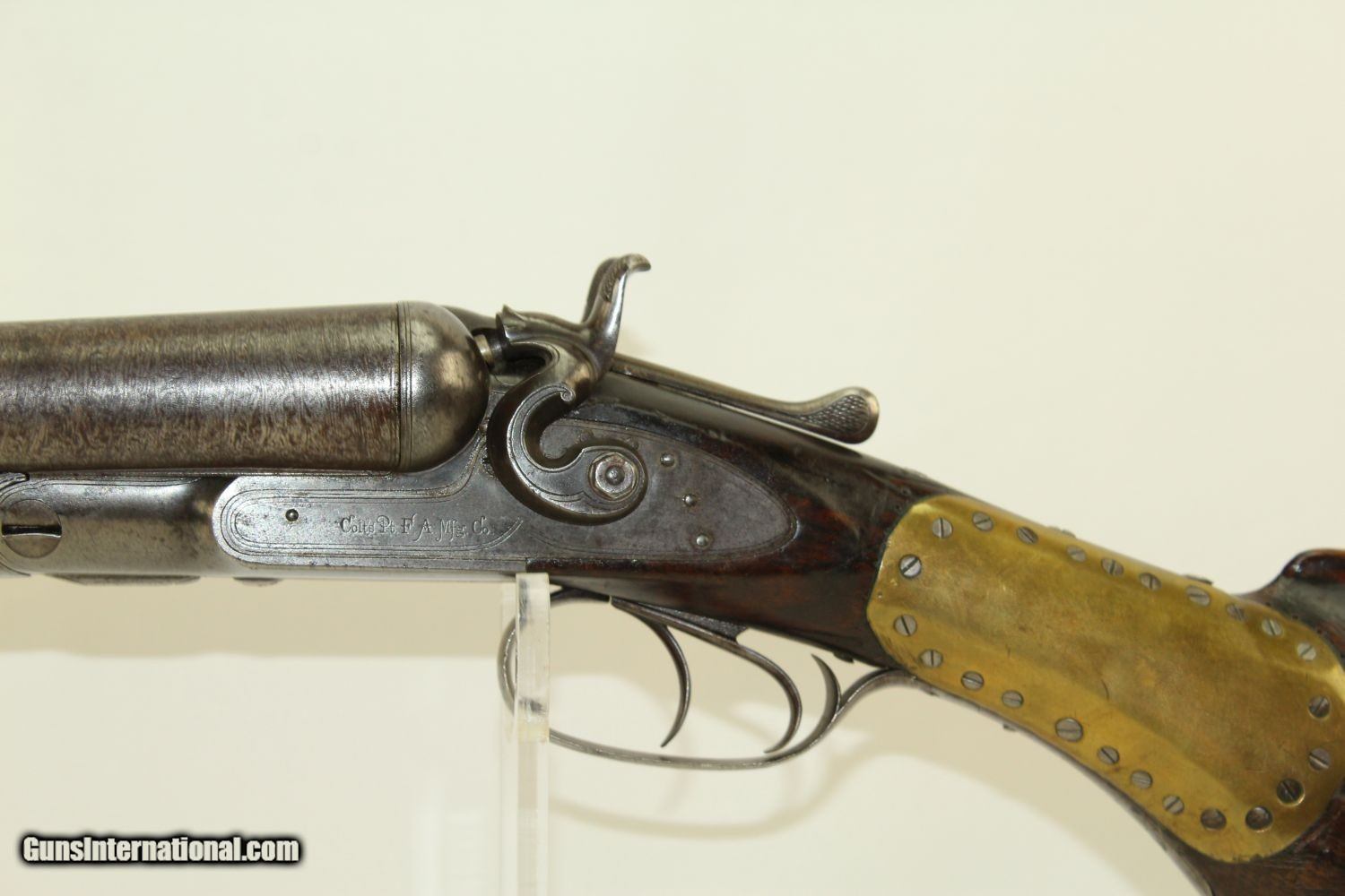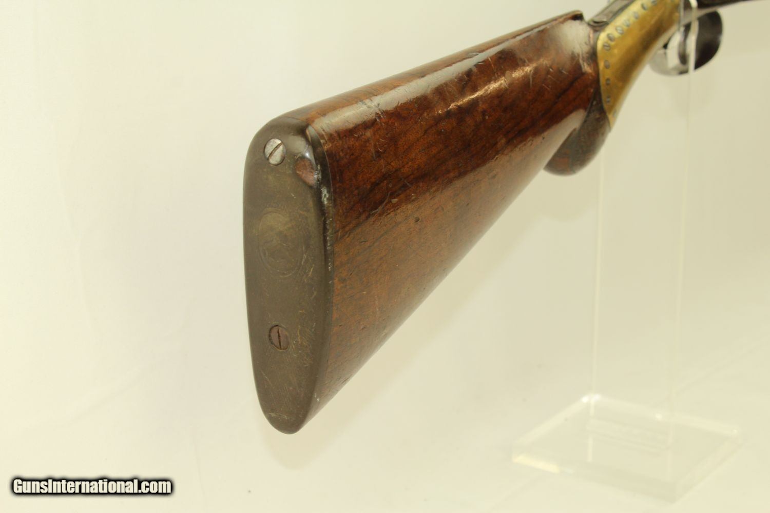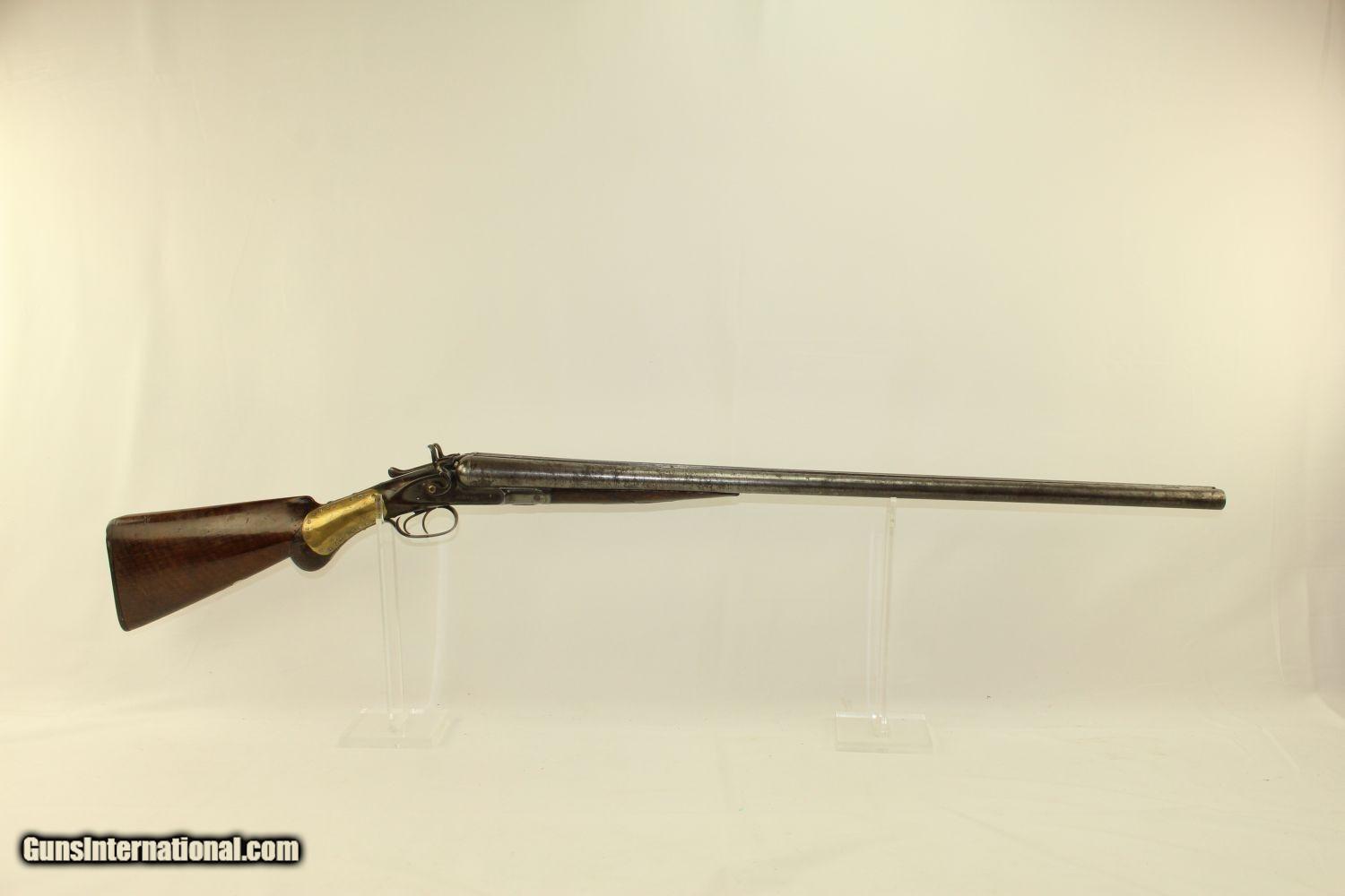 Description: Scarce Antique COLT Model 1878 SxS Hammer SHOTGUN Double Barrel Made in 1882 with Damascus Barrels Here we present an antique Colt Model 1878 Double Barrel Hammer Shotgun in 10 Gauge, manufactured in Hartford, Connecticut in 1882. The Model 1878 was made from 1878 to 1889, with approximately 22,683 guns manufactured. These double barrel shotguns were an exposed hammer double gun that competed closely with high-end Parkers. The Colt Model 1878 Double-Barrel Hammer Shotgun is considered to be, if not the finest, one of the finest American double-barrel shotguns ever made. The Model 1878 Shotgun was the highest priced item in the Colt line and was available in almost any grade as a special order item. According to one source, “The Model 1878 Hammer Gun ranks among the best grade doubles produced in the entire American arms trade. The limited number completed and the great pains devoted to handling specific orders from often fussy shooters means that a considerable degree of quality and variety is evident in the Model 1878 series.” This one was obviously used and kept running with that neat old repair along the wrist. The repair consists of two thick brass sheets screwed the entire way round. Brass was chosen for its malleability so that it would conform to the stock but also be strong enough to make the repair hold. The iron parts have a gray patina. The markings are clear. The numbers match. The bores are in very good condition, smooth and semi-bright. The actions remain strong. Here is a fantastic 10 gauge shotgun that would have taken many a duck or goose in the marsh, fantastic for mounting on the wall above the fireplace! Own the original! This is a legitimate antique and not a reproduction. Barrels are 32 inches. Caliber: 10 Gauge Chambers: 3 inches LOP: 14-1/4 inches Chokes: Cylinder/Cylinder Overall condition as seen in photos. Very Fast. Very Safe. FREE SHIPPING WORLDWIDE. Delivered directly to your door by express mail! Guaranteed AUTHENTIC & Includes CERTIFICATE OF AUTHENTICITY. ancestryguns $1400 #191025 SOLD Antique: Yes |