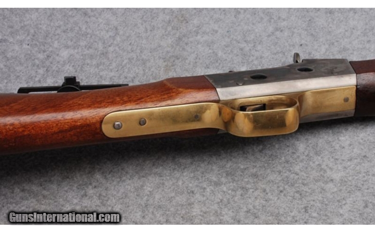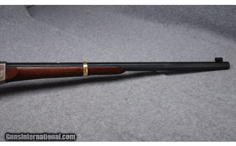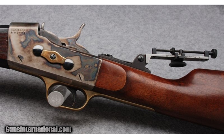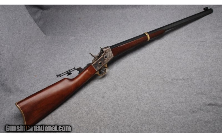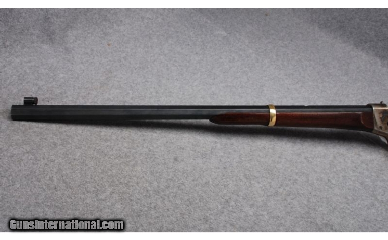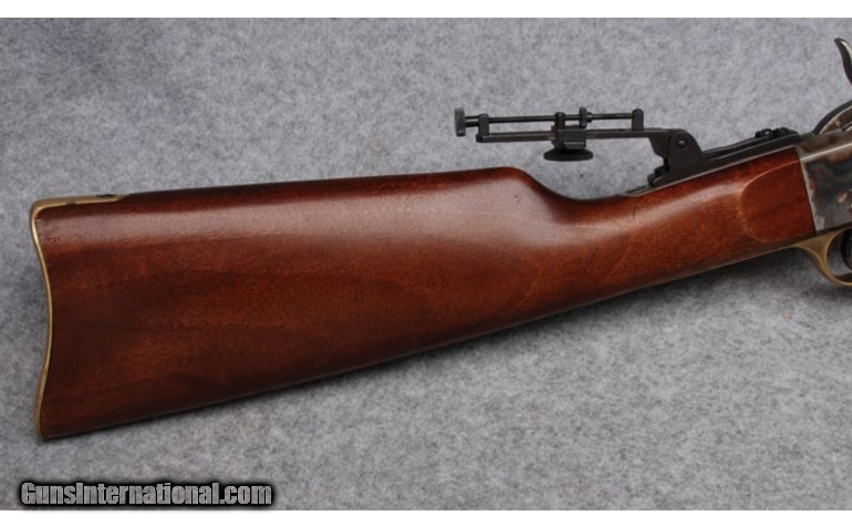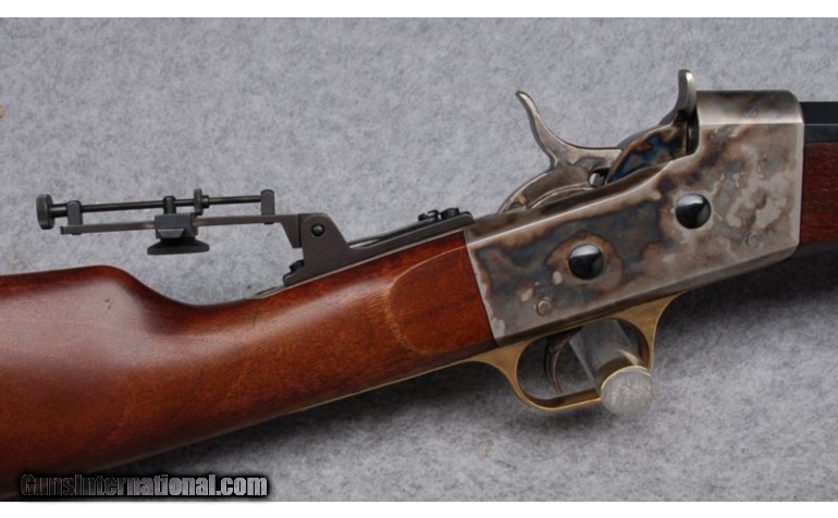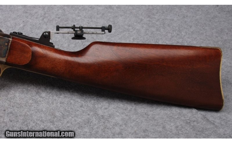 Description: This is a Pedersoli 1874 rifle in .45-70. The action is in Very Good condition with strong case coloring and little wear. The 30 inch heavy octagon barrel is in Very Good condition. The rear sight on the barrel has been removed. The dovetail is blank. This rifle has a tang rear sight and globe front sight with a bead. The wood stock is in Good to Very Good condition. The fore end has a slight crack on the left side at its front , and the brass barrel band is loose. SOLD Caliber Info: .45-70 Metal Condition: Very Good with light handling marks Wood Condition: Good to Very Good with light handling marks Bore Condition: Bright and shiny Barrels: 30" Heavy Octagon Barrel Triggers: Single Stock: Wood Stock Dimensions: LOP: 14 1/2 Fore End: Wood Butt Pad: Brass Crescent Sights: Tang rear sight and Globe front sight with bead Item Location: Reno, NV |