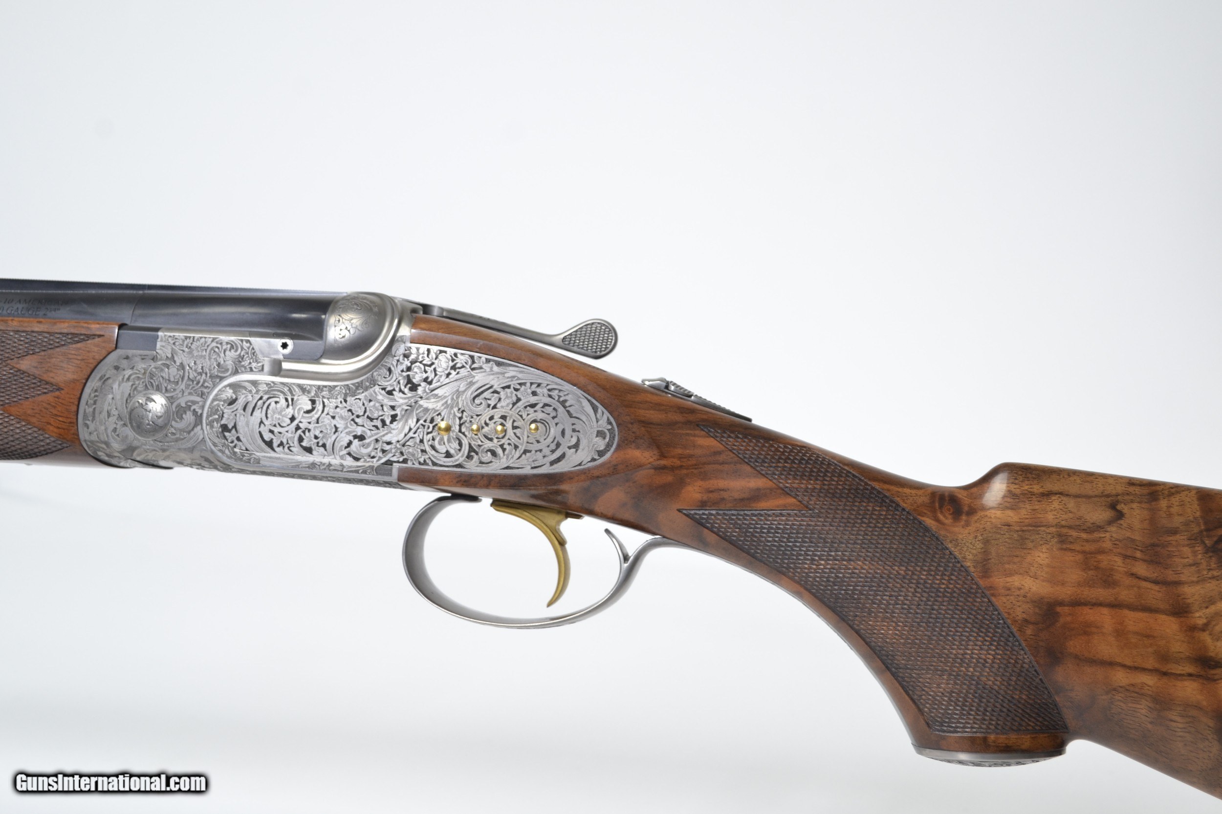 Description: A10 - Platinum Ornamental, 20ga. 28” Barrels. Beautiful Exhibition Turkish Walnut, Field Forend, Pistol Grip, TruLock Chokes, Adjustable Single Selective Trigger, Vent Rib, Automatic Ejectors, Automatic Safety, includes makers’ case with cover. Base Price - $22,000.00, Exhibition Turkish Walnut - $2,500.00, Leather Pad - $550.00, Long Tang - $700.00 Inv# 31097 6 lbs. 2.9 oz. 14 ¼” - 14 ¾” x 1 ½” x 2 1/8” $25,800.00 SOLD |