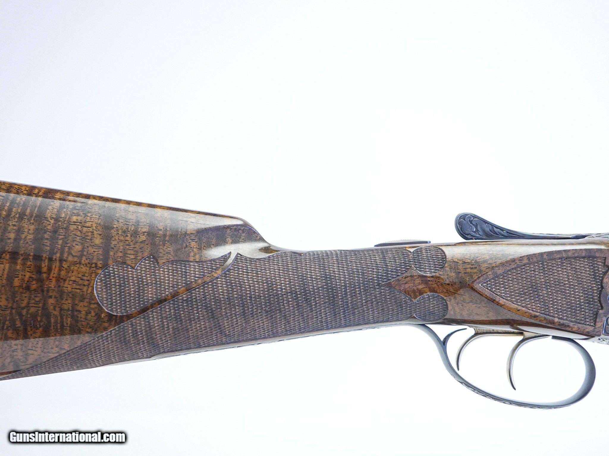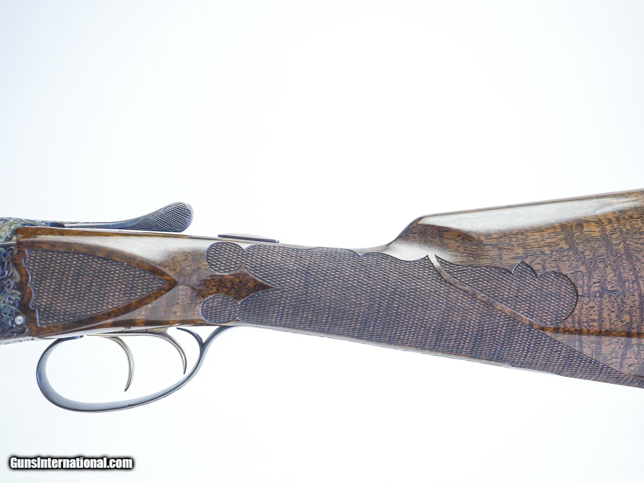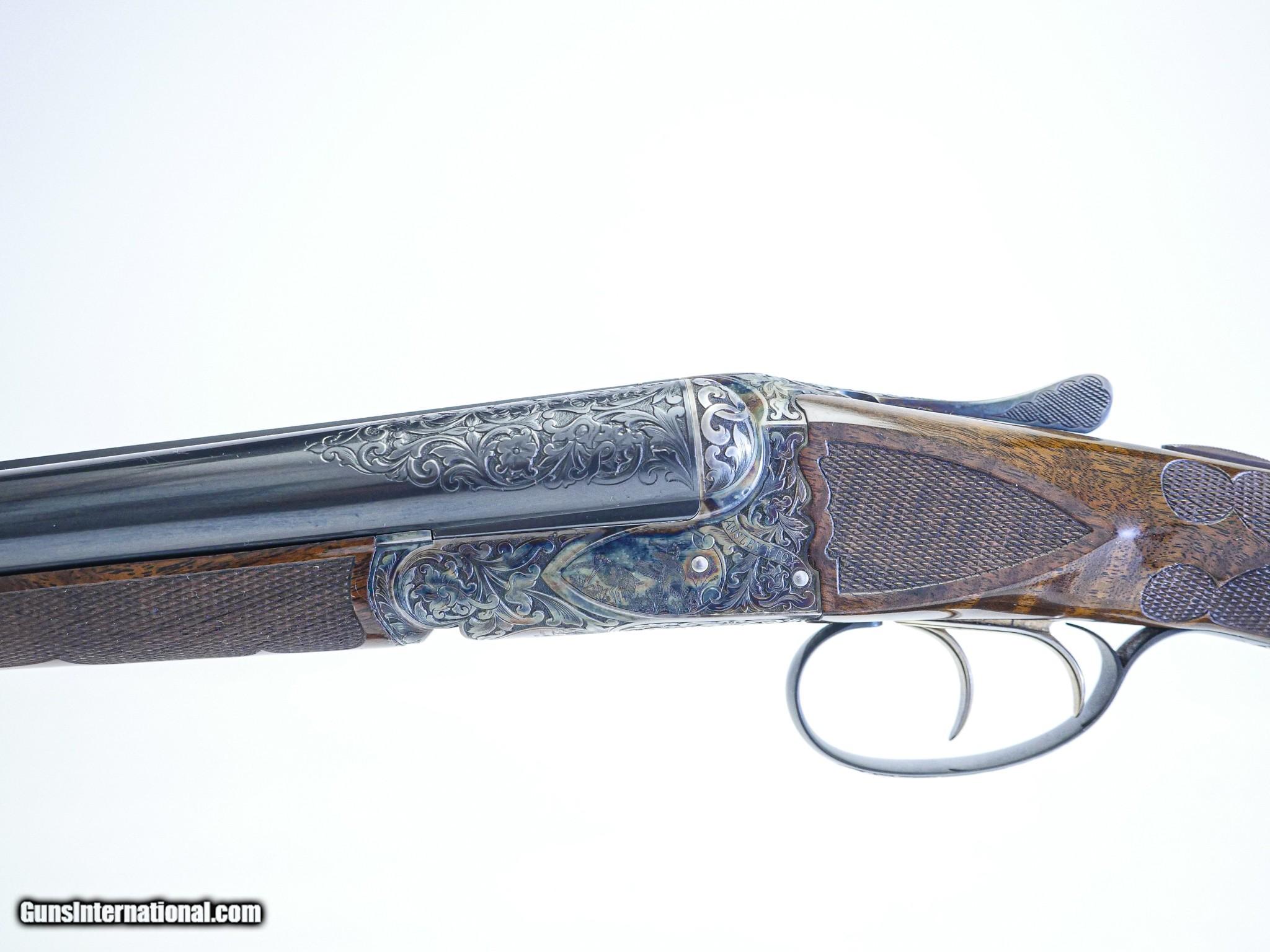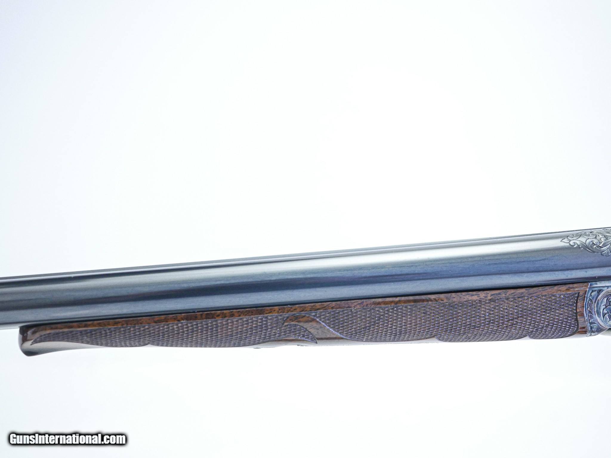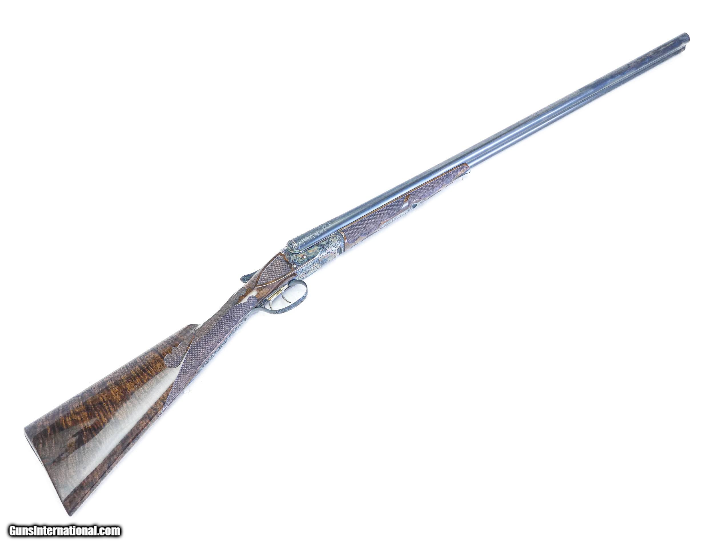 Description: CSMC - A.H. Fox, DE Grade, 16ga. 29" Barrels Choked IC/M. Highly figured American black walnut straight hand stock, checkered butt, Schnabel forend with a horn insert, automatic safety, automatic ejectors, double triggers, Chromox steel barrels, solid rib, game vignettes of quail, grouse, and woodcock surrounded by full coverage deep scroll engraving on receiver with matching deep scroll wedges on barrels, beautiful bone and charcoal hardening receiver, 99% condition throughout, includes makers’ case, available for immediate delivery. Inv: 48887 5 lbs. 12 oz. 14 3/8” x 1 1/2” x 2 1/8” $21,995.00 SOLD |