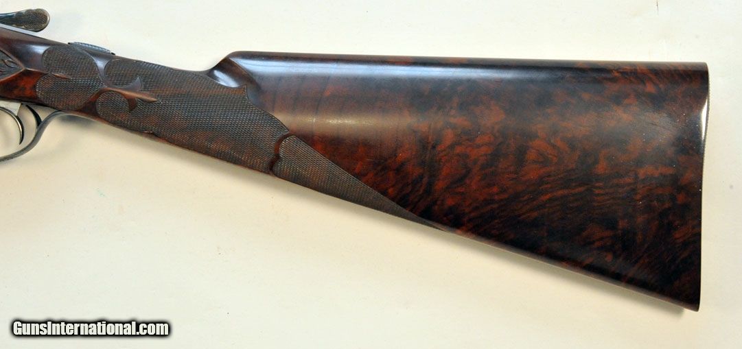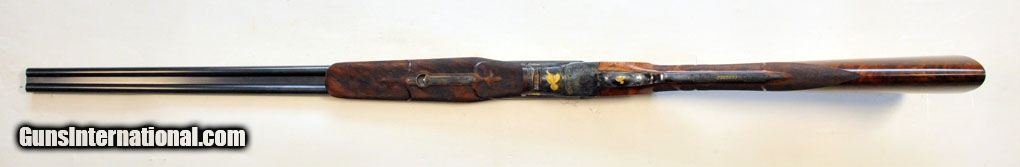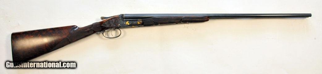 Description: CSMC A. H. Fox FE Special Ser. No. F205653. .410 3"- 26" barrels choked F/F. DT, EJ, BTF and checkered butt. 14 1/2"X 1 1/2"X 2 1/4". Engraved by Demunck and a super smallbore bird gun. Cased with leather case. SOLD |
