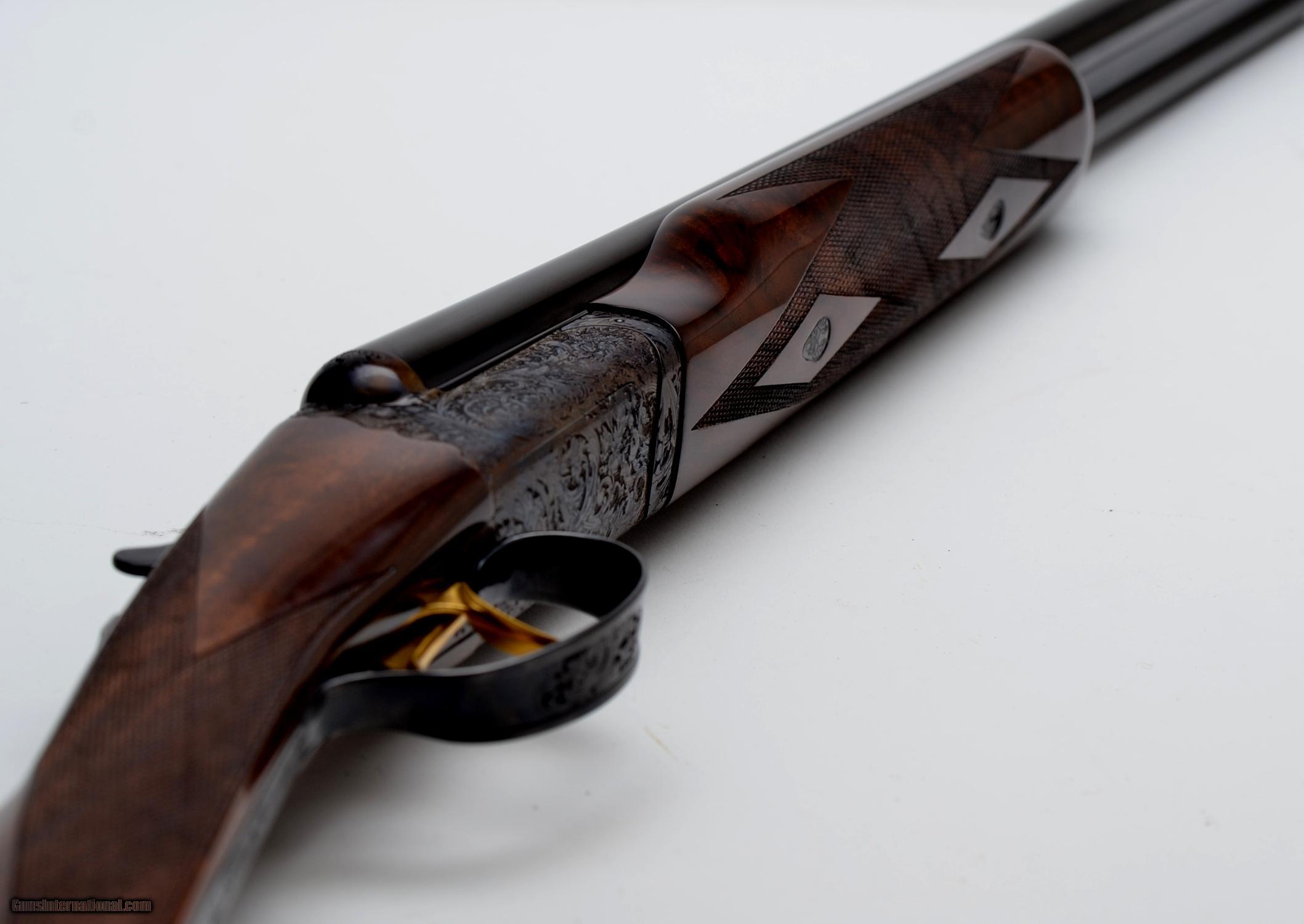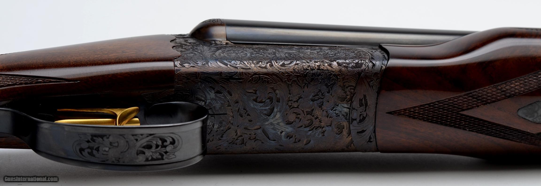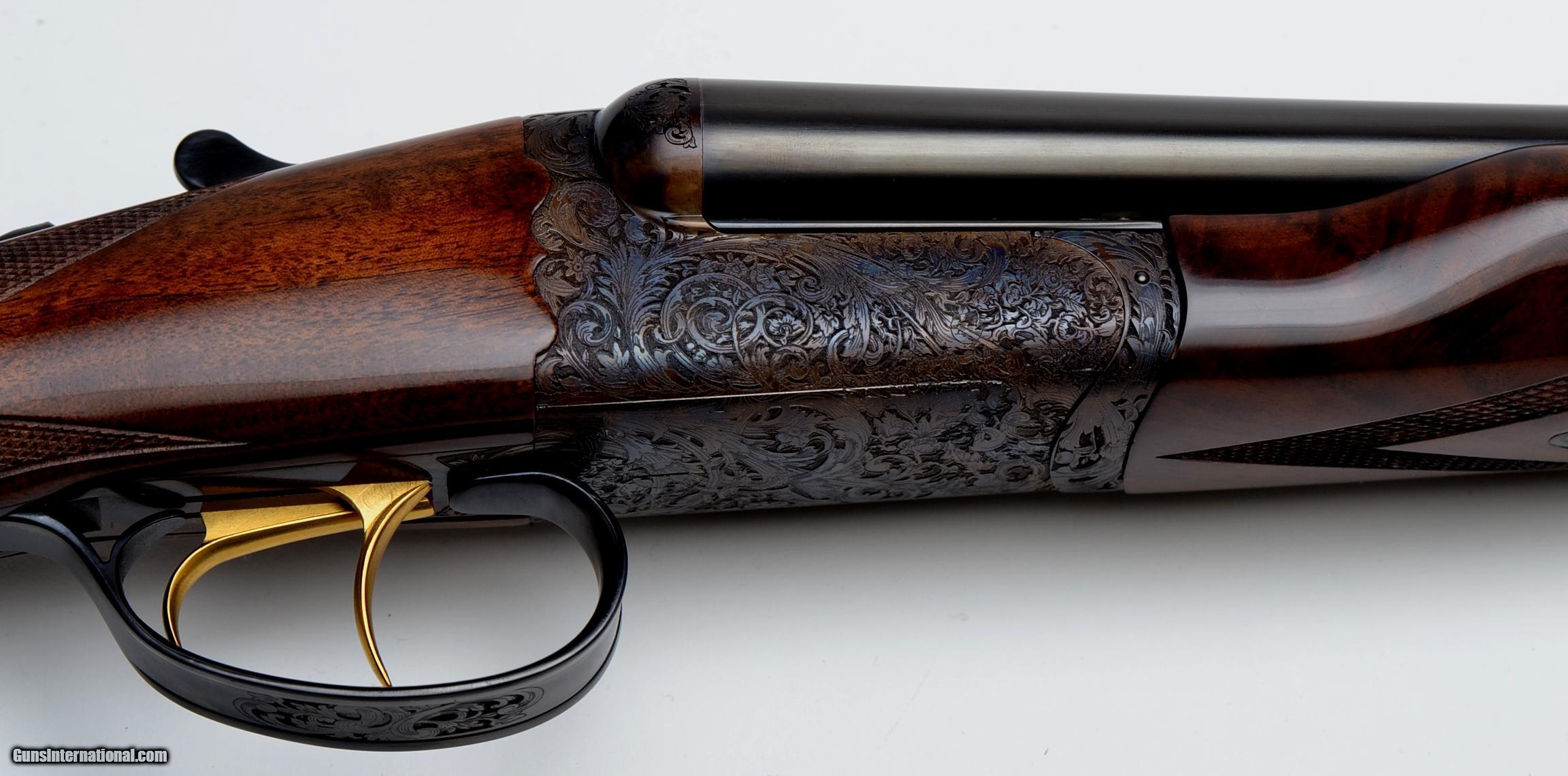 Description: CSMC Christian Hunter, 20ga., 30” barrel with TruLock choke tubes, a detachable floor plate, straight grip exhibition wood to a checkered butt, magnificently executed miniature Rose & Scroll engraving that has bulino details that is just at the highest level of very intricate Rose & Scroll pattern. Mind blowing piece of fully engulfed old growth black American walnut, feather crotch. Double Trigger, Auto Ejector, 3” chamber. This gun comes with a lifetime warranty designed and built by CT shotgun. Based on the true Anson & deeley system without any modern methods. This is a true high grade, handmade shotgun. Inventory # 37230 14 3/4" x 1 1/2" x 2 3/8" 6lbs., 4 oz $14,850.00 SOLD |
