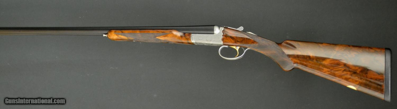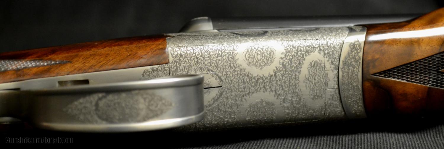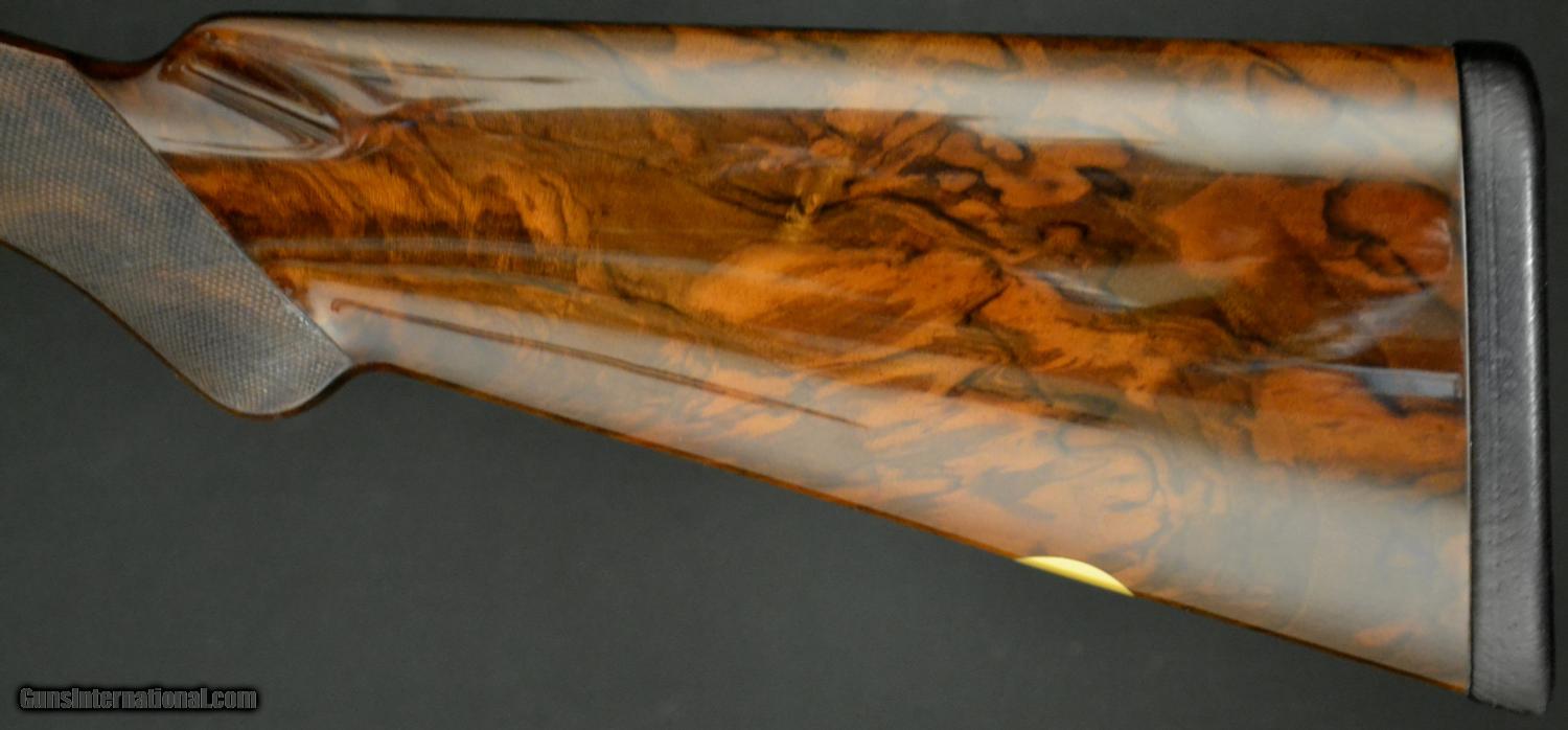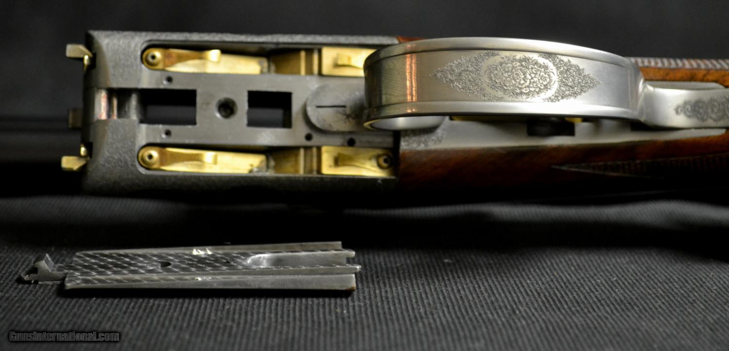 Description: CSMC Christian Hunter 20ga., 30” barrels with Choke Tubes and a detachable floor plate. Semi-pistol grip, rolled edge trigger guard, gold oval beavertail forend, coin finish. Magnificently executed miniature Rose & Scroll engraving that has bulino details that puts it at the highest level of our intricate Rose & Scroll pattern. Mind blowing piece of Exhibition Turkish Walnut. Single Selective Trigger, Auto Ejector, 2 ¾” chamber. This gun comes with a lifetime warranty designed and built by CT Shotgun. Based on the true Anson & Deeley system without any modern methods. This is a true high grade, handmade shotgun. Inv# 51000 14 ¼” X 1 5/8” X 2 3/8” Price: $13,995.00 SOLD |