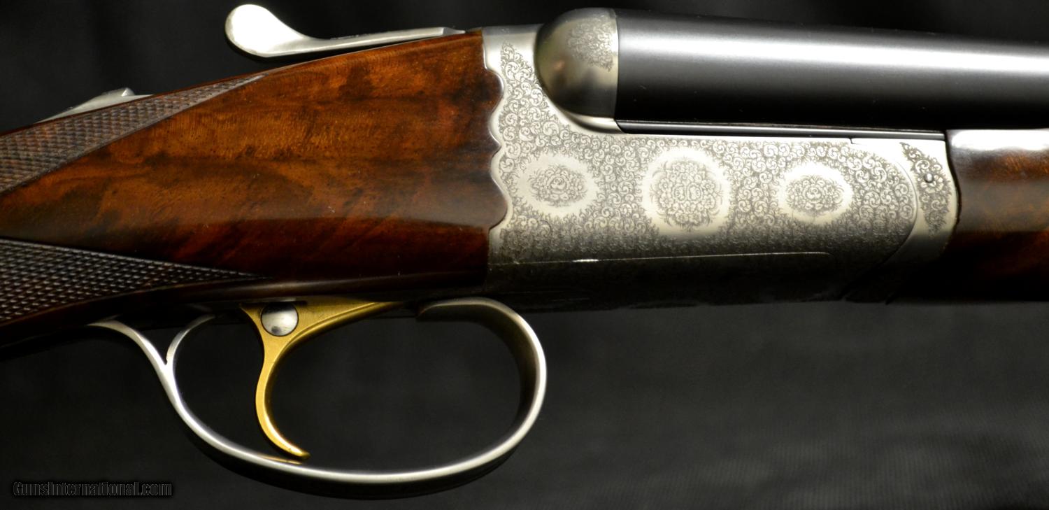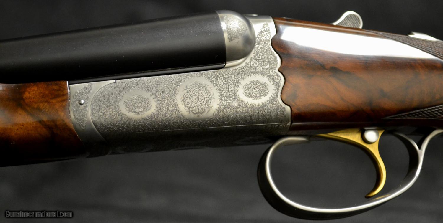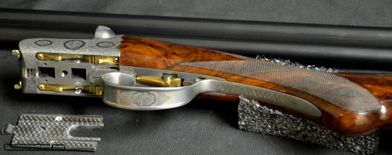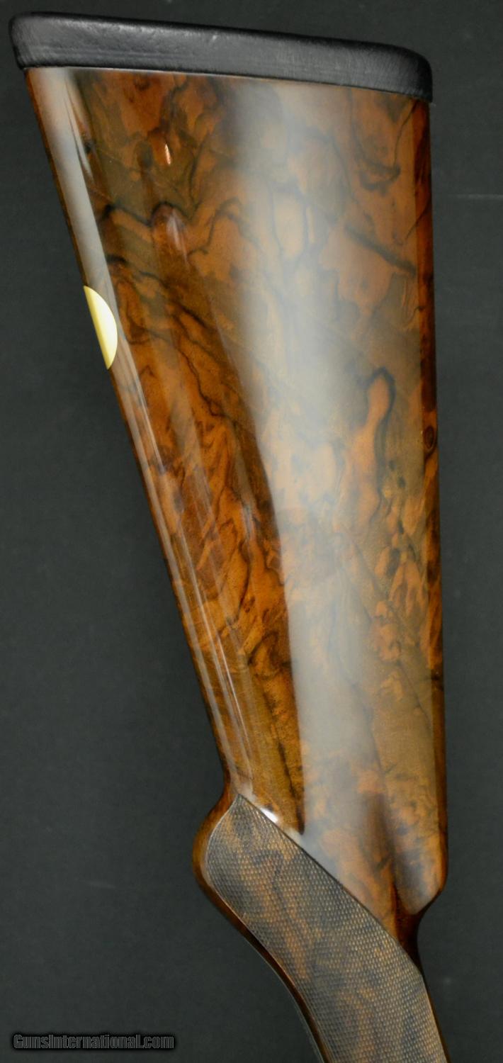 Description: CSMC Christian Hunter 20ga., 30” barrels with Choke Tubes and a detachable floor plate. Semi-pistol grip, rolled edge trigger guard, gold oval beavertail forend, coin finish. Magnificently executed miniature Rose & Scroll engraving that has bulino details that puts it at the highest level of our intricate Rose & Scroll pattern. Mind blowing piece of Exhibition Turkish Walnut. Single Selective Trigger, Auto Ejector, 2 ¾” chamber. This gun comes with a lifetime warranty designed and built by CT Shotgun. Based on the true Anson & Deeley system without any modern methods. This is a true high grade, handmade shotgun. Inv# 51000 14 ¼” X 1 5/8” X 2 3/8” Price: $13,995.00 SOLD |