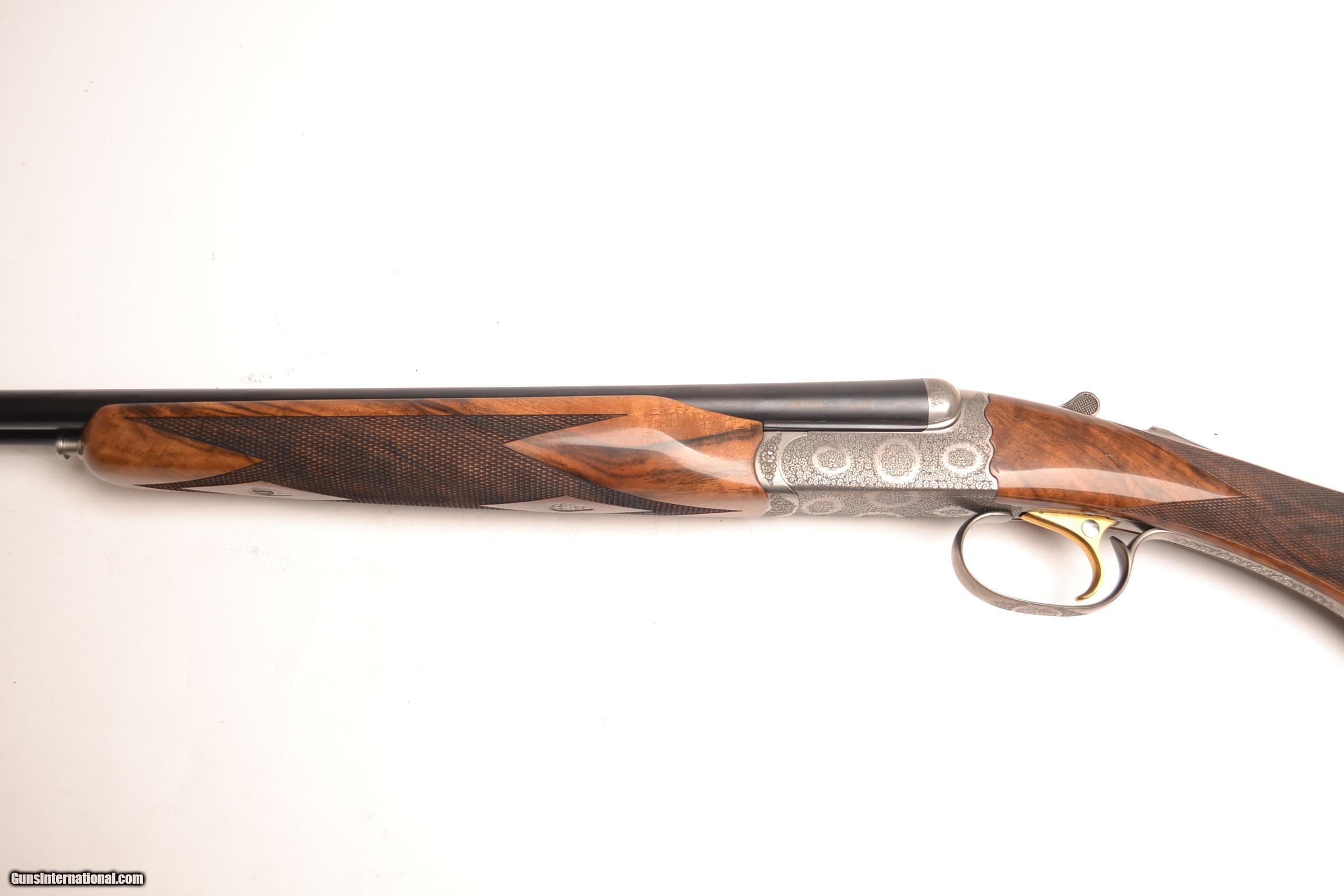 Description: CSMC - Christian Hunter .410ga., 28” barrels, detachable floor plate. pistol grip, gold oval, beavertail forend, coin finish. Magnificently executed miniature Rose & Scroll engraving that has bulino details that puts it at the highest level of our intricate Rose & Scroll pattern. Mind blowing piece of Exhibition Turkish Walnut. Single Selective Trigger, Auto Ejector, 2 ¾” chamber. This gun comes with a lifetime warranty designed and built by CT Shotgun. Based on the true Anson & Deeley system without any modern methods. This is a true high grade, handmade shotgun. Inv# 36484 14 3/4” X 1 1/2” X 2 1/4” Price: $17,945.00 SOLD |
