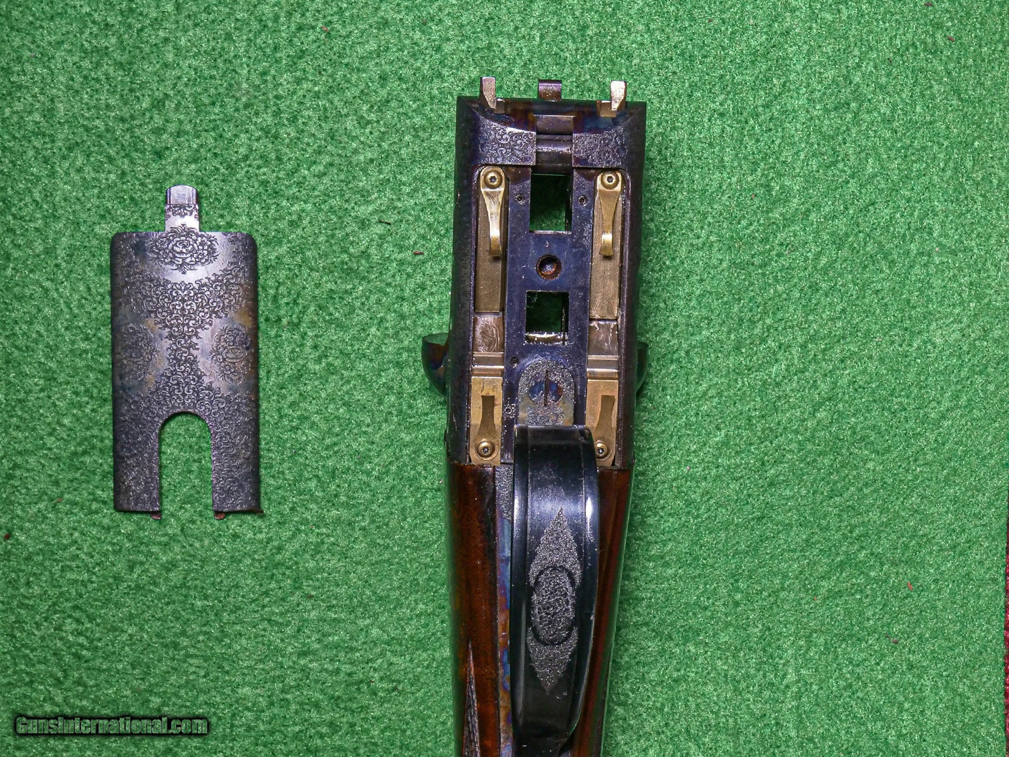 With a detachable floor plate. straight grip, beavertail forend. Magnificently executed miniature Scroll engraving that has bulino details that puts it at the highest level of our intricate Rose & Scroll pattern. Mind blowing piece of Exhibition American Walnut. single trigger, Auto Ejector, 2 ¾" chamber. This gun comes with a lifetime warranty.