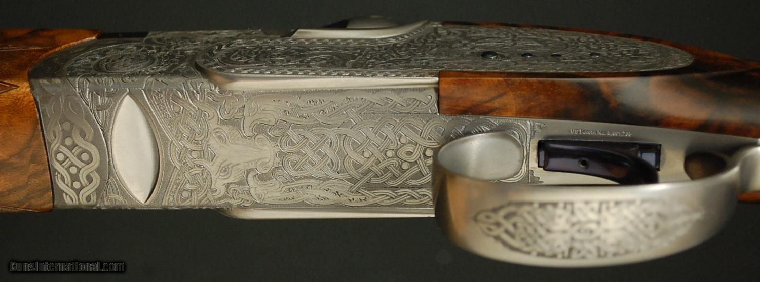 Description: CSMC- Christian Hunter- New Celtic engraved model 20 ga. 28” barrels with screw in choke tubes, beautiful exhibition Turkish Circassian walnut, Woodward style metal capped long tang grip, drop-point stock, flat-top checkering, checkered butt, target forend, gold oval, ventilated rib, automatic ejectors, automatic safety, London style oil finish, fire blued single selective trigger and pins, and many other unique features which are found only on our new Christian Hunter guns, full side lock shotgun featuring cut lock plates, new stunning full coverage Celtic engraving pattern over a French grayed and plasma hardened receiver, a breathtaking gun that is available for immediate delivery, Base Price- $21,000.00, Exhibition Turkish Walnut- $2,500.00, Custom Shop- $1,000.00, Flat Top Checkering- $1,500.00, Cut Lock Plates - $900, Long Tang- $700.00, Checkered butt- $350.00, Gold Oval- $350.00, S&H- $50.00. Inv# 29635 14 5/8” x 1 ½” x 2 ¼” 7lbs. 6oz. $28,350.00 SOLD |