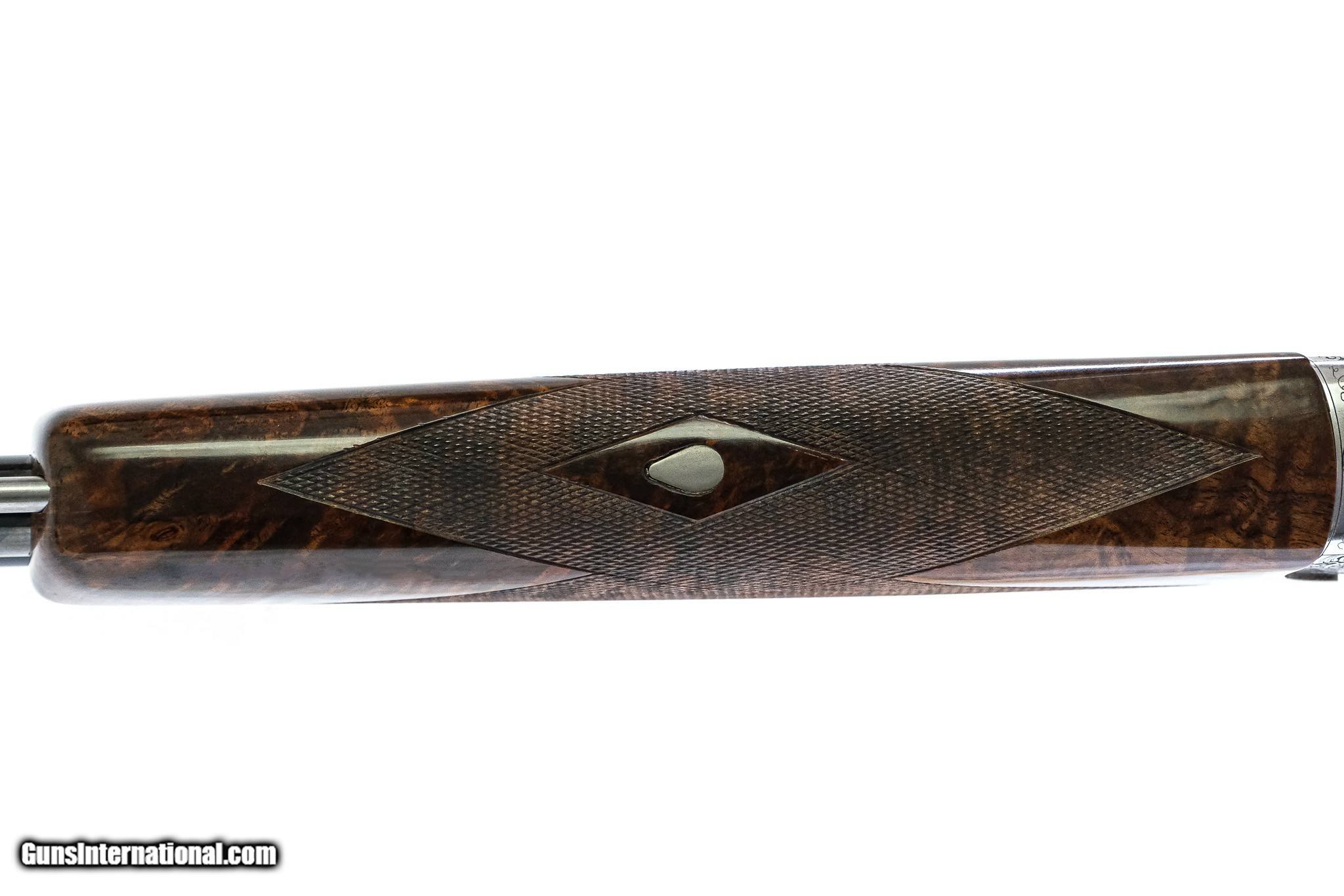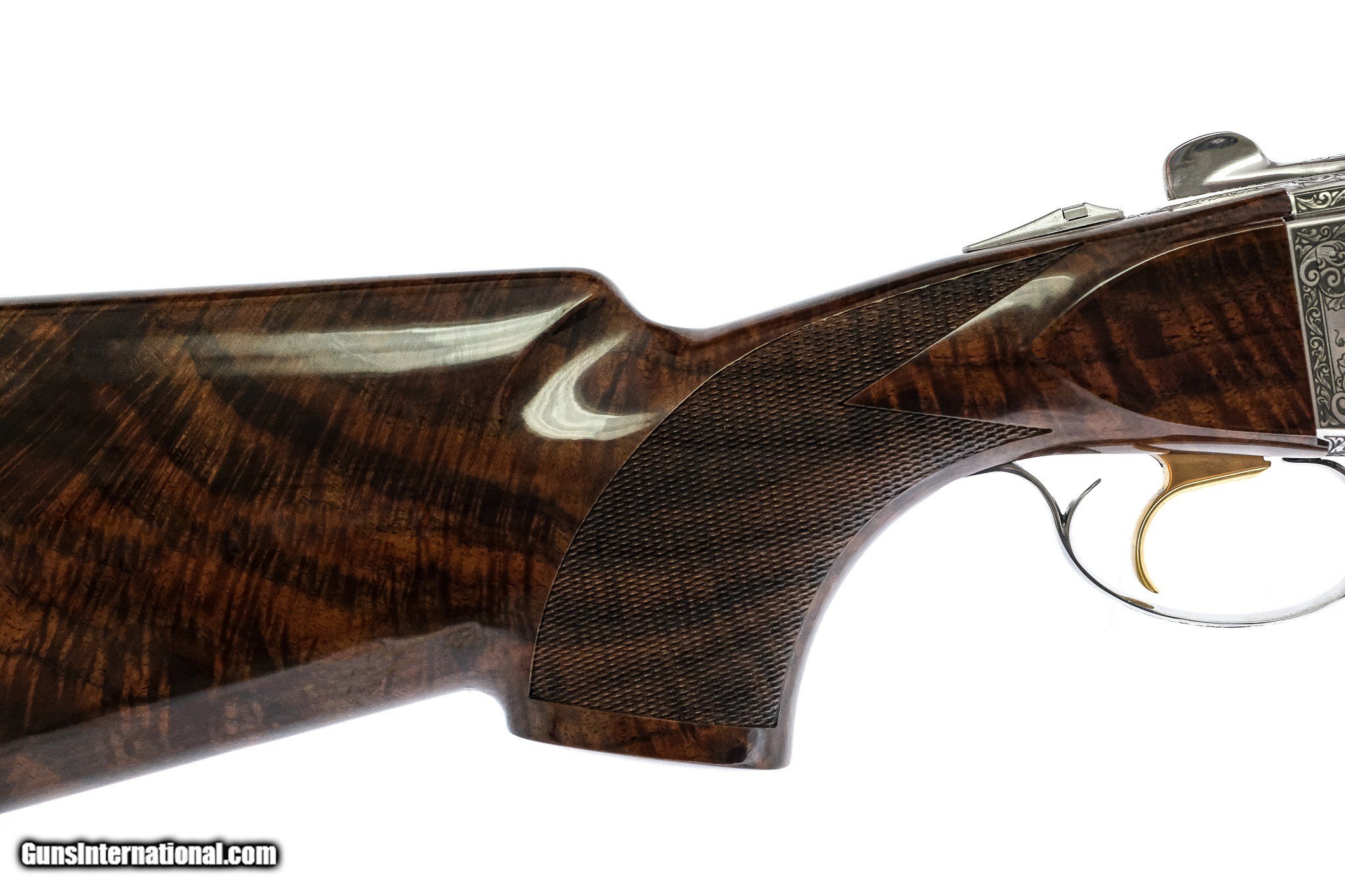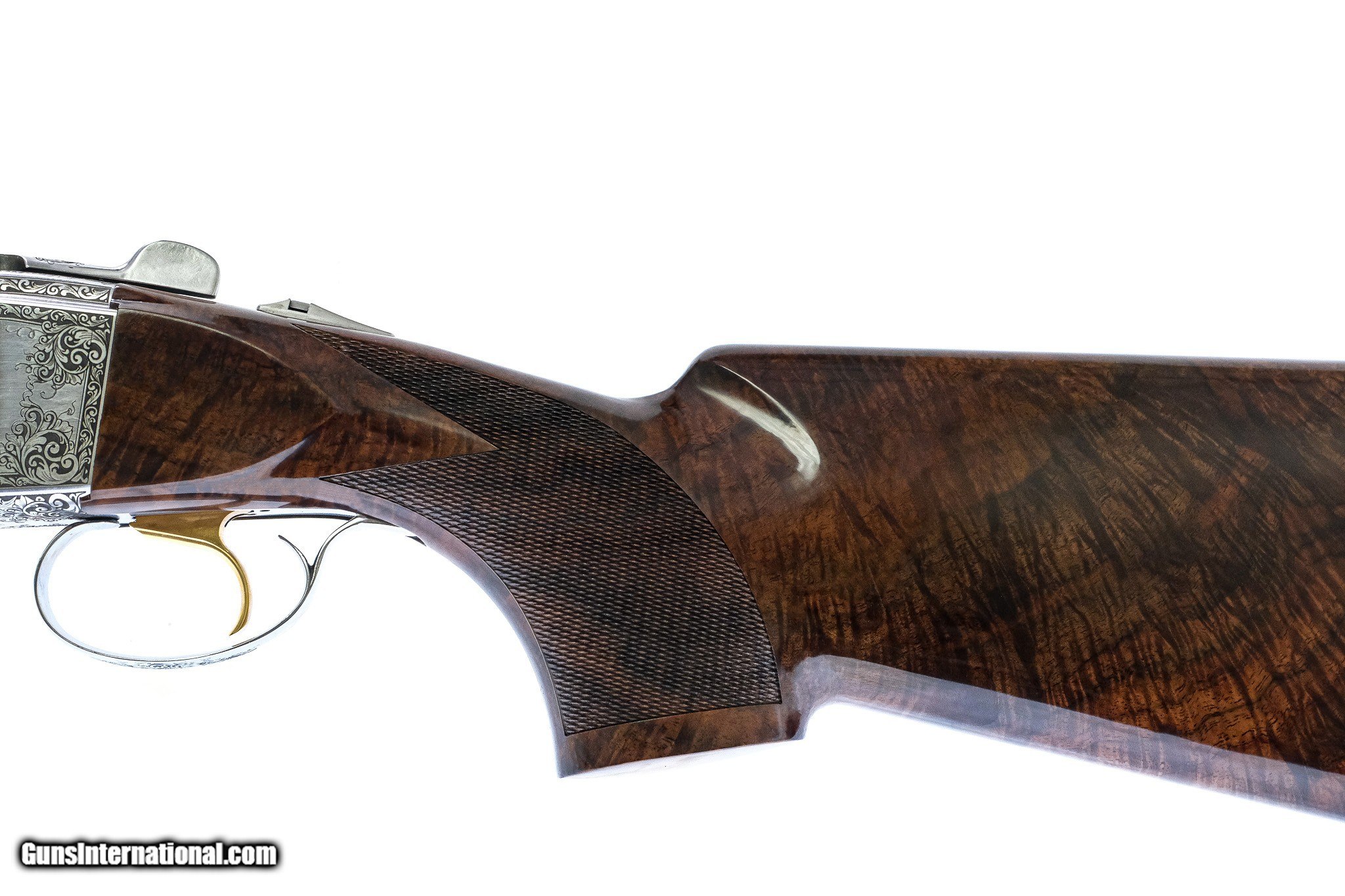 Description: CSMC - G1 Deluxe Scroll, 12ga. 32" Barrels with Screw-in Choke Tubes. Comes with a full set of choke tubes and wrench, Target pistol grip, Exhibition highly marblecaked Turkish Circassian walnut, exquisite Deluxe pattern featuring 75% coverage classic American auto ejector, vent rib. Ventilated top ribs are tapered from 10mm to 8mm with center channel for instant sight picture alignment, installed using bronze brazing and laser welding with high point of impact for constant target visibility. Receiver machined from a solid billet of 416 aircraft grade stainless teel. During the machine process they are stress relieved and then finish hardened for 24 hours using the plasma nitrate method which is used in aircraft manufacturing. This specialized hardening adds durability and longevity that is unheard of in the gun industry. Barrels are machined from 4140 steel, and over-bored to .736 bore diameter. Precision honed on machines for the G1 to achieve precise concentric bore. 2 3/4" chambers with extended long forcing cones for reduced recoil. Extended long receiver for added strength, unique enclosed and raised breech face for zero head space issues and added strength, adjustable muzzle loop for customizing point of impact. Available with special under forend barrel weight fixture to adjust handling balance. Unique inspection and lubrication windows on each side of frame, Standard Galazan recoil pad with catch proof hard top specially made for the gun, beautifully checkered by hand, finished with several coats of oil, large ergonomic paddle top lever. Made entirely in the USA by Connecticut Shotgun Manufacturing Company. Base Price - $7,500.00, Options Include: Exhibition Full Feathercrotch American Black Walnut - $900.00, S & H - $50.00. Inv: 69537 8 lbs. 8 oz. 14 ¼" x 1 ½" x 2 ¼" $7,500.00 SPECIAL PRICE ($8450 ORIGINAL MSRP) SOLD |