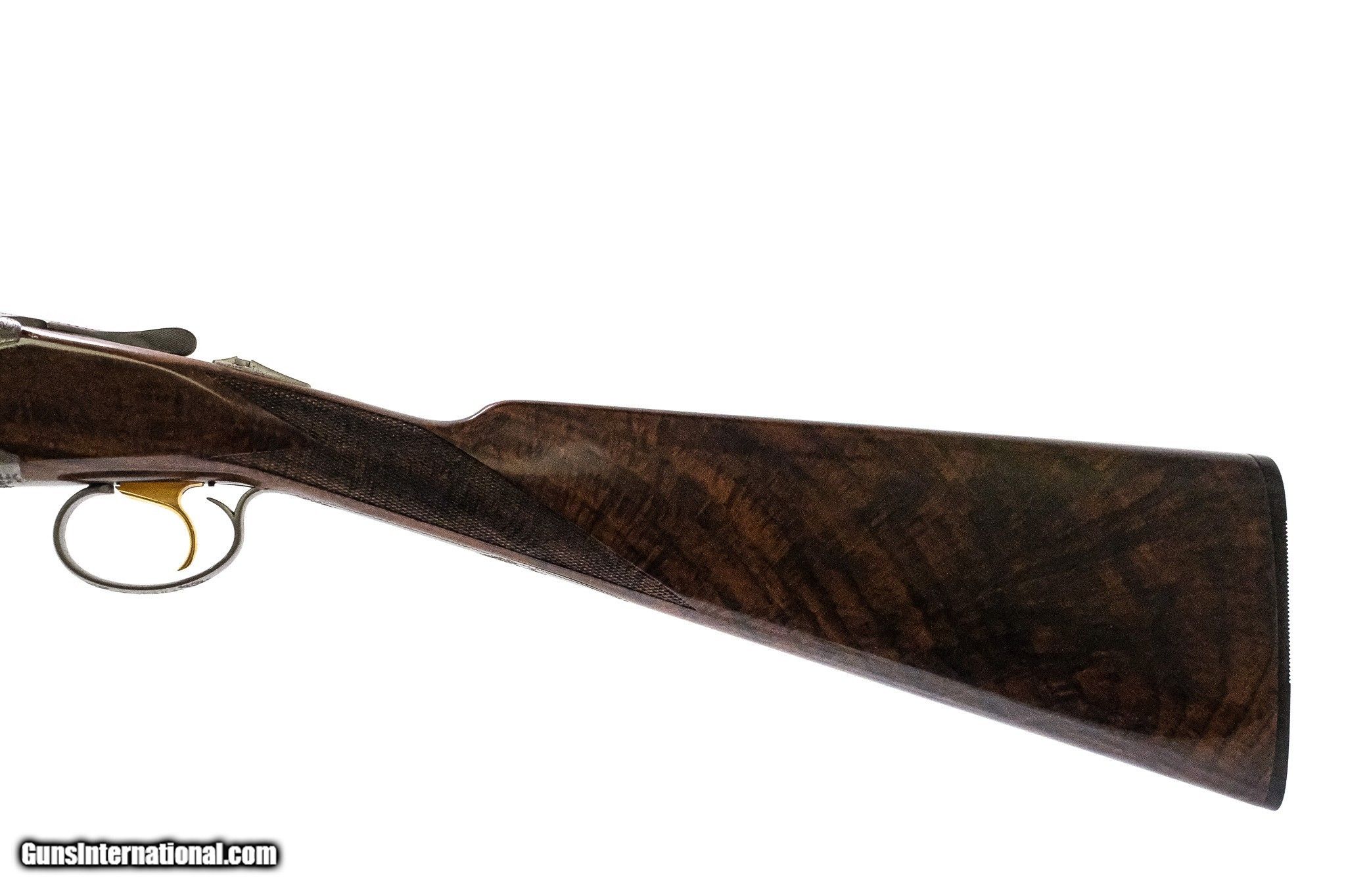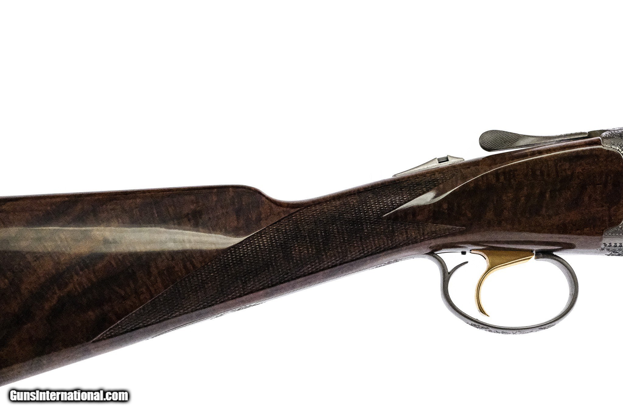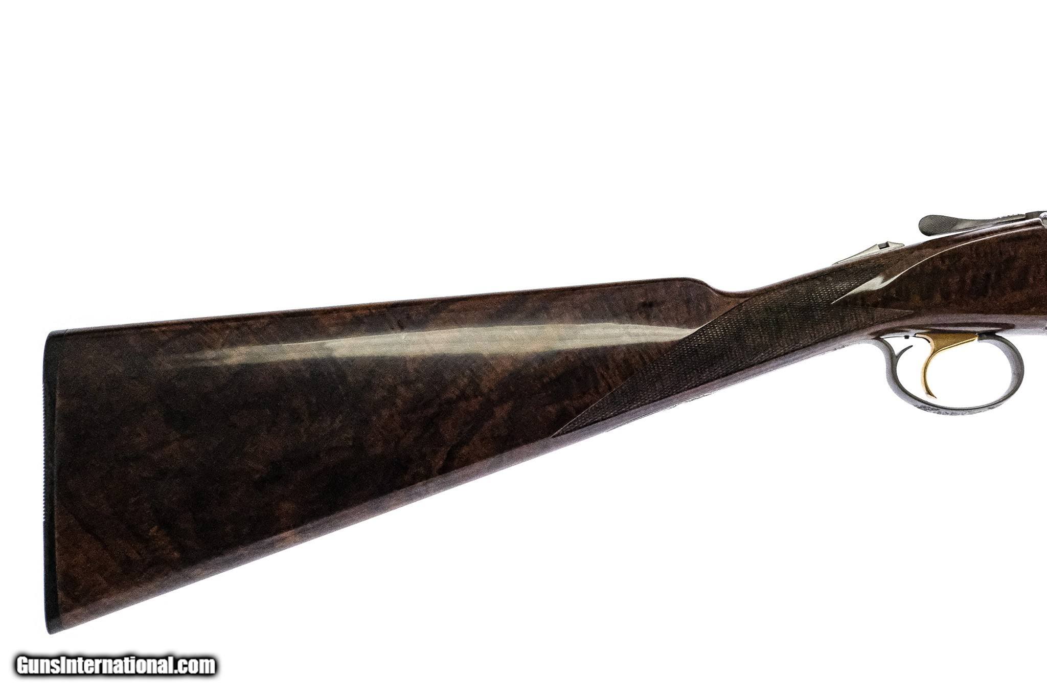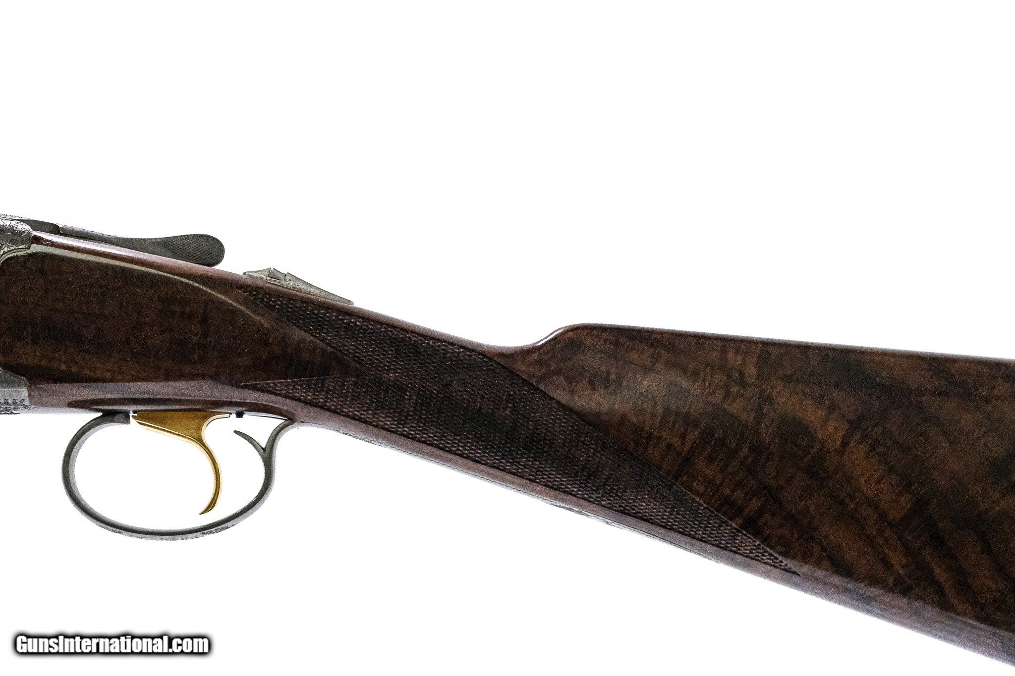 Description: CSMC - Pointer Superlight, O/U, 20ga. 28" Barrels with Factory Hidden Screw-in Choke Tubes. Incredible Exhibition full feathercrotch American black walnut straight grip stock, round frame, schable forend, gold single selective trigger, automatic ejectors, factory serrated butt plate, TruOil finish, long tang trigger guard, ventilated rib, French gray receiver with magnificent pointer game scenes on each side of the receiver, quail on the bottom, and pheasant on trigger guard bow, the latest offering from the master gunsmiths at Connecticut Shotgun Mfg Co., 100% new and unfired, available for immediate delivery. Base Price - $4,995.00, Options Include: Exhibition American Black Walnut - $900.00, TruOil Finish - $500.00, S & H - $50.00. Inv: 74238 6 lbs. 0 oz. 15” x 1 3/8” x 2 1/8” $5,945.00 SOLD |