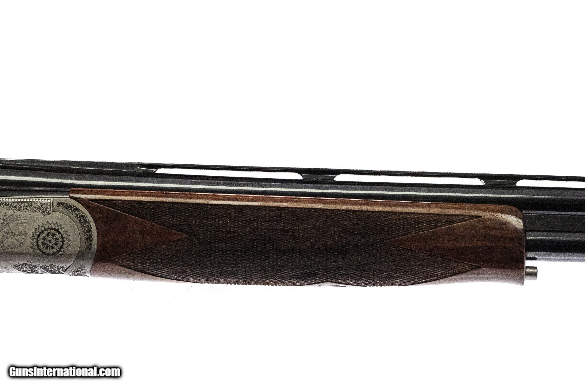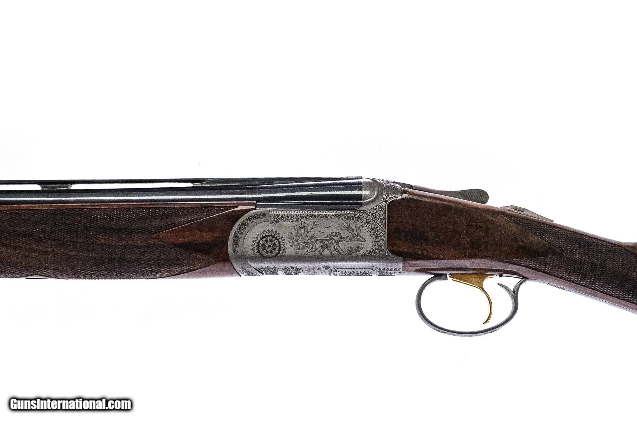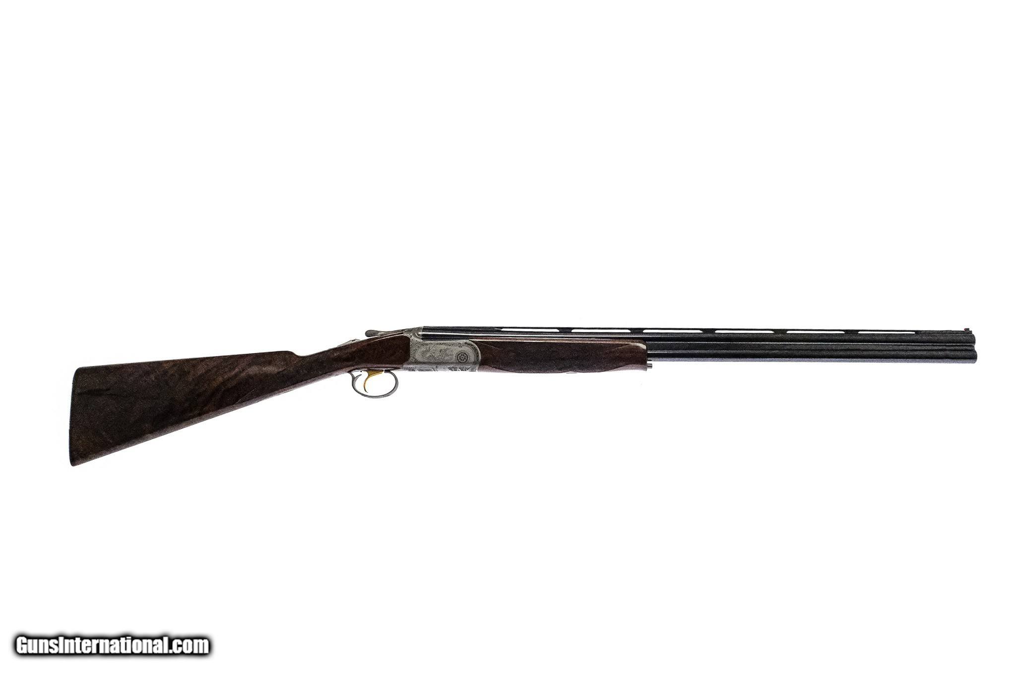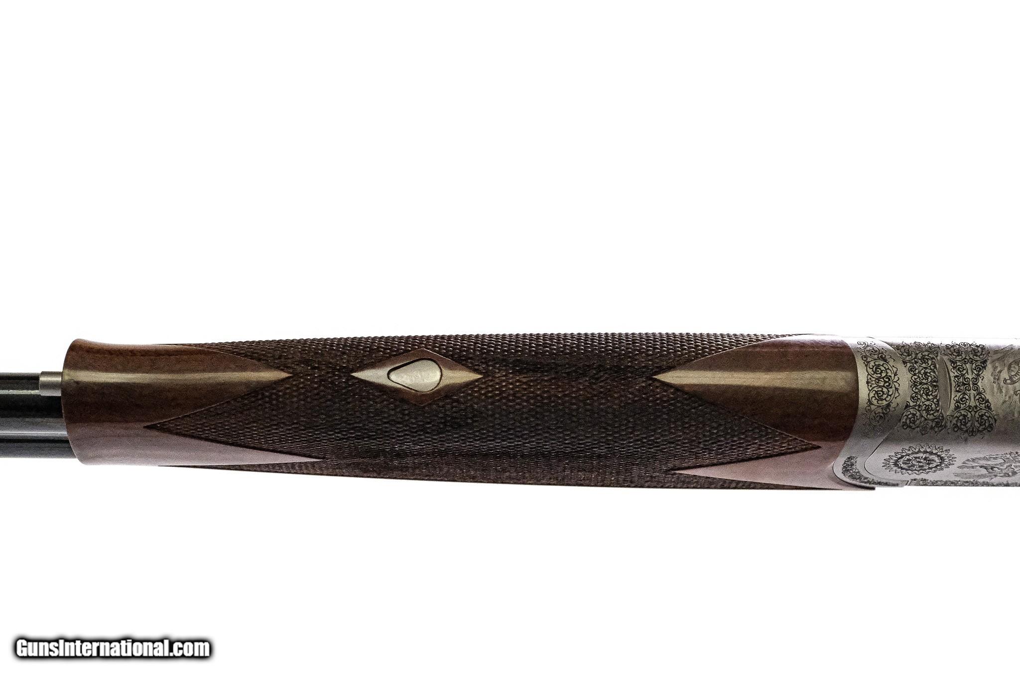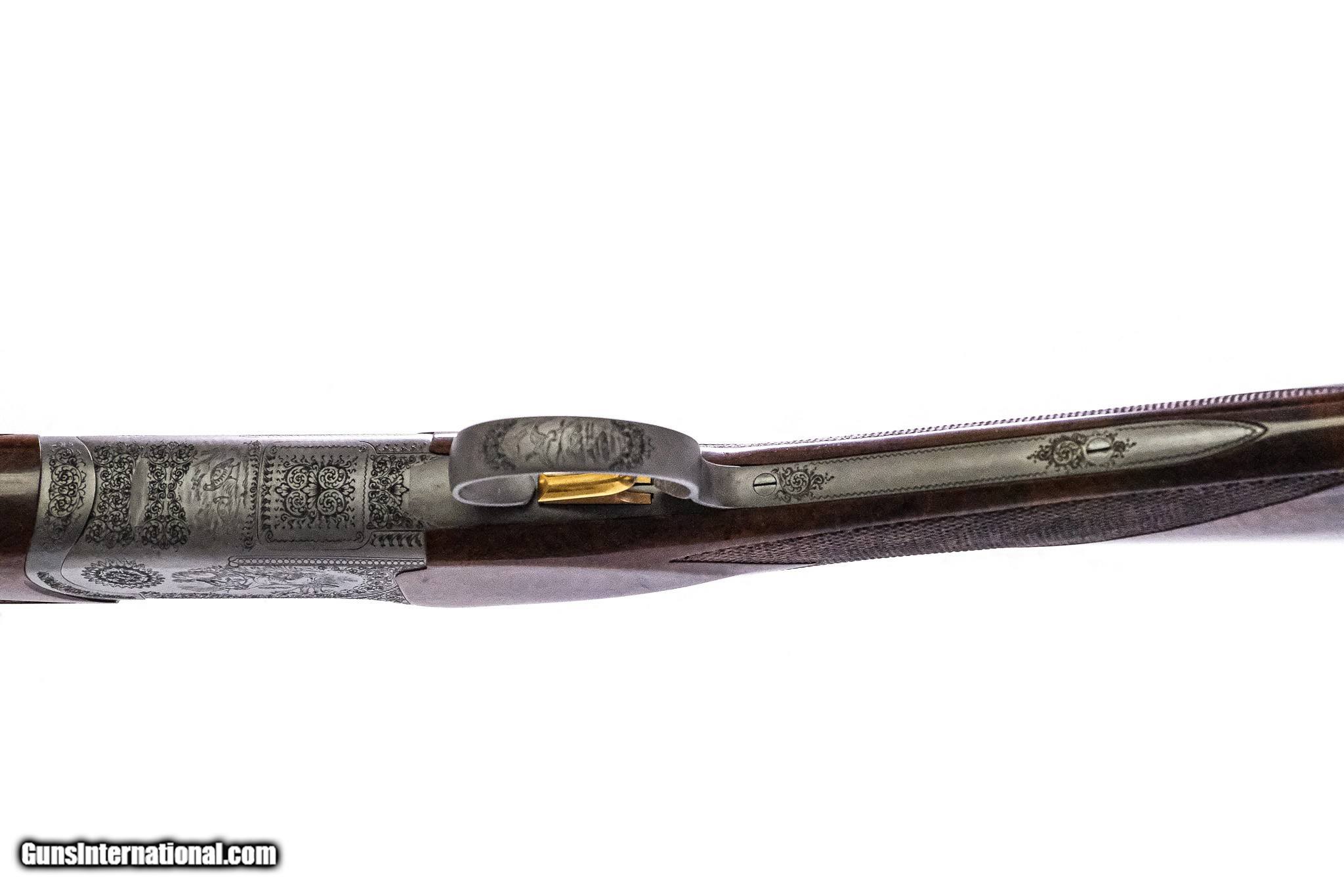 Description: CSMC - Pointer Superlight, O/U, 20ga. 28" Barrels with Factory Hidden Screw-in Choke Tubes. Incredible Exhibition full feathercrotch American black walnut straight grip stock, round frame, schable forend, gold single selective trigger, automatic ejectors, factory serrated butt plate, TruOil finish, long tang trigger guard, ventilated rib, French gray receiver with magnificent pointer game scenes on each side of the receiver, quail on the bottom, and pheasant on trigger guard bow, the latest offering from the master gunsmiths at Connecticut Shotgun Mfg Co., 100% new and unfired, available for immediate delivery. Base Price - $4,995.00, Options Include: Exhibition American Black Walnut - $900.00, TruOil Finish - $500.00, S & H - $50.00. Inv: 74238 6 lbs. 0 oz. 15” x 1 3/8” x 2 1/8” $5,945.00 SOLD |