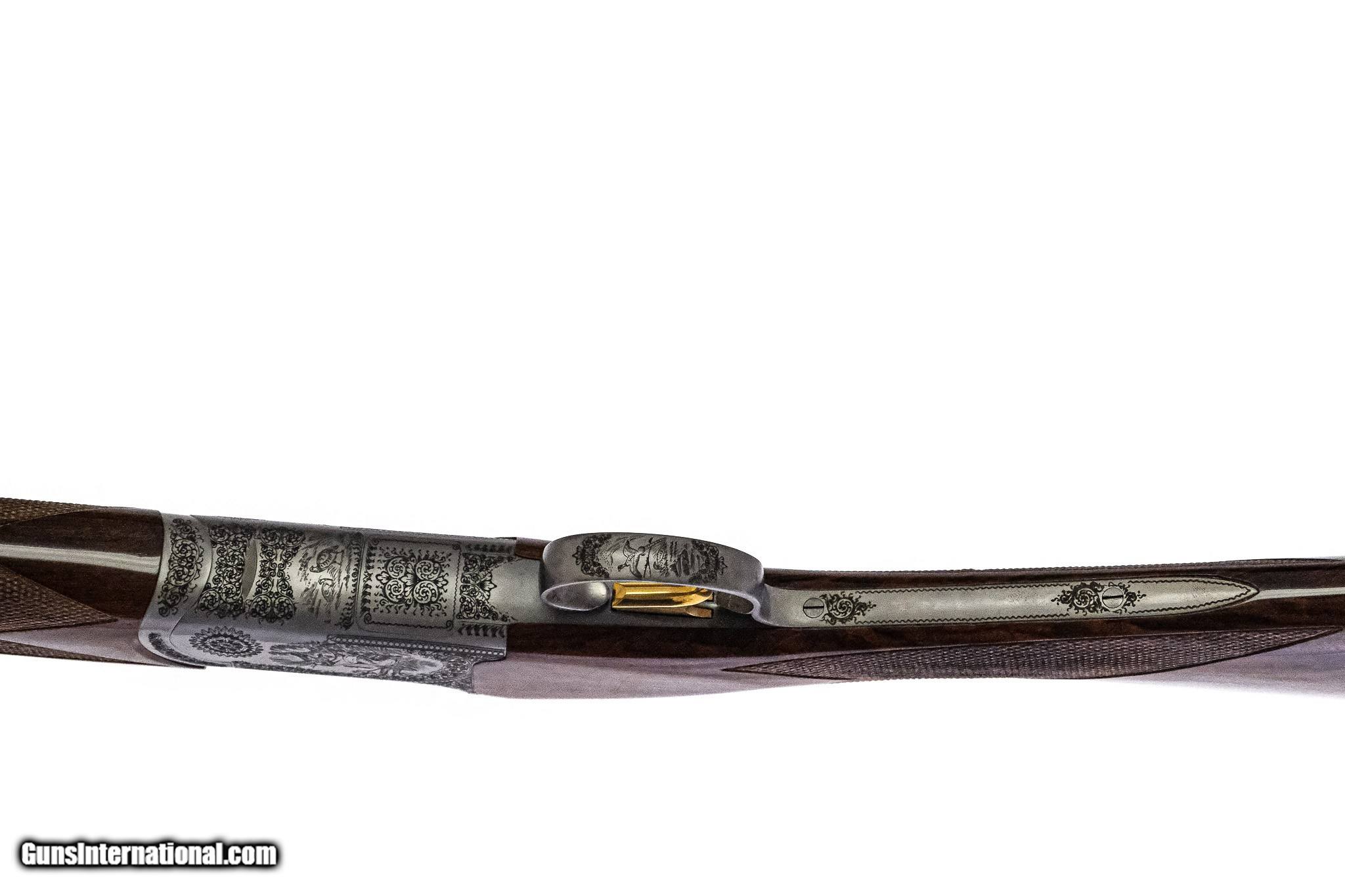 Description: CSMC - Pointer Superlight, O/U, 20ga. 28" Barrels with Factory Hidden Screw-in Choke Tubes. Incredible Exhibition full feathercrotch American black walnut straight grip stock, round frame, schable forend, gold single selective trigger, automatic ejectors, factory serrated butt plate, TruOil finish, long tang trigger guard, ventilated rib, French gray receiver with magnificent pointer game scenes on each side of the receiver, quail on the bottom, and pheasant on trigger guard bow, the latest offering from the master gunsmiths at Connecticut Shotgun Mfg Co., 100% new and unfired, available for immediate delivery. Base Price - $4,995.00, Options Include: Exhibition American Black Walnut - $900.00, TruOil Finish - $500.00, S & H - $50.00. Inv: 74625 5 lbs. 14 oz. 14 ½” x 1 3/8” x 2 ¼” $5,945.00 SOLD |