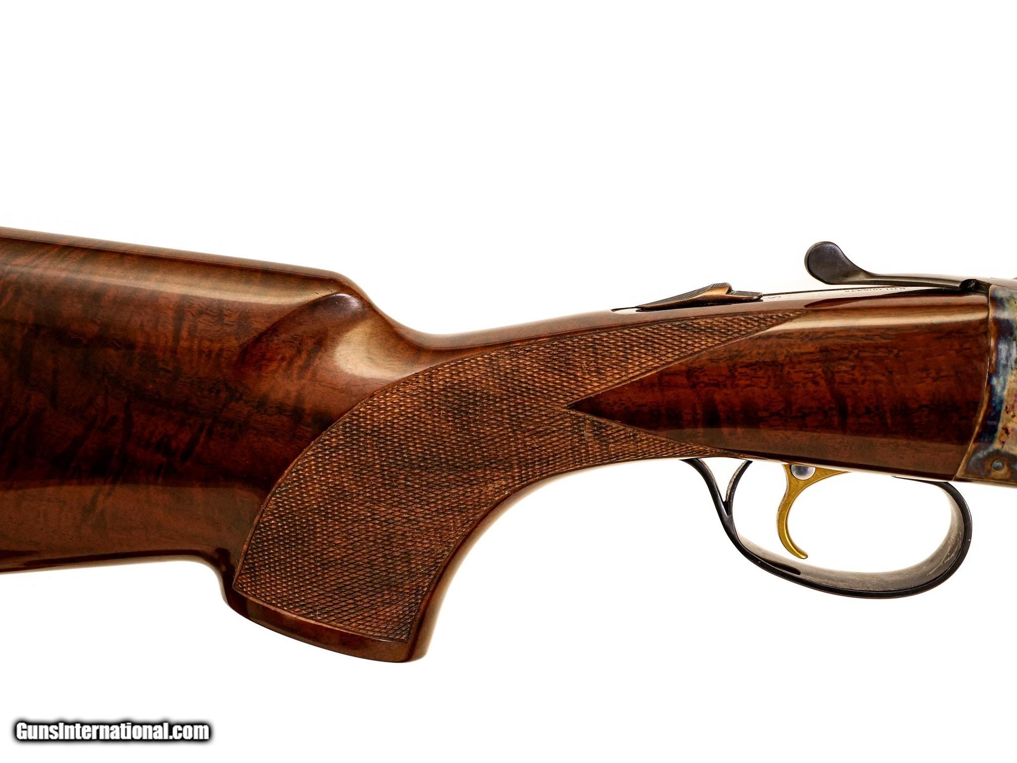 Description: CSMC - Superbird, SxS Competition Shotgun, 12ga. 32" Barrels with 5 Screw-in Choke Tubes (SK,IC,M,IM,F). Ventilated rib, full feathercrotch exhibition American black walnut target pistol grip stock, TruOil finish, beavertail forend, single selective trigger, automatic ejectors, factory ¾” recoil pad, vent rib, 3” chambers, spectacular bone & charcoal case coloring, excellent configuration. 100% brand new & unfired, each gun is completely handmade in the USA by the finest gunsmiths in the world, available for immediate delivery. Base Price - $4,995, Options Include: Exhibition Wood - $900.00, TruOil Finish - $500.00, S & H - $50.00. Inv: 55172 8 lbs. 12 oz. 14 ¾” x 1 ½” x 2” $6,445.00 SOLD |