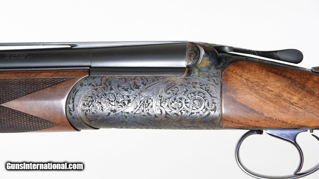 Description: Inverness - Special, Round Body, O/U, 20ga., 28” barrels, a round elegant, classic timeless design that is more than just the sum total of its parts, beautifully sculptured and elongated top and bottom tang, side ribs over the forearm, trigger plate action, file cut rib, TruLock chokes, gorgeous 4X American Walnut, gold oval stock inlay, capped pistol grip stock, hunting forend, TruOil finish, Galazan thin red recoil pad, single selective trigger, Long tang trigger guard, automatic ejectors, automatic safety, vent rib, spectacular highly detailed extensive ornamental engraving covering the receiver, the frame is color case hardened. Available for immediate delivery. Base price - $8,995.00, options include: 4X wood-$600, gold oval inlay-$350, TruOil finish - $500, Long Tang - $700, S&H - $50.00