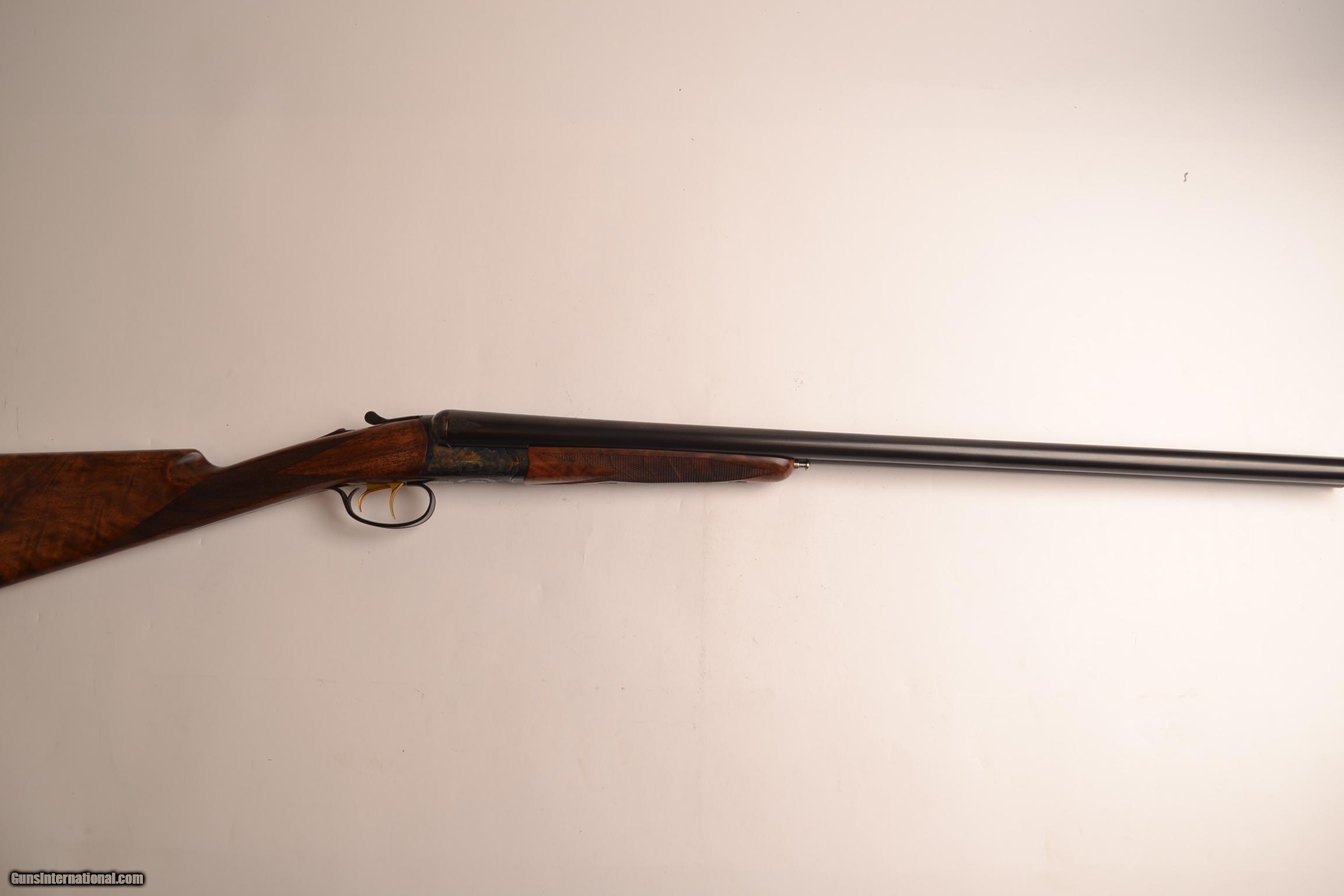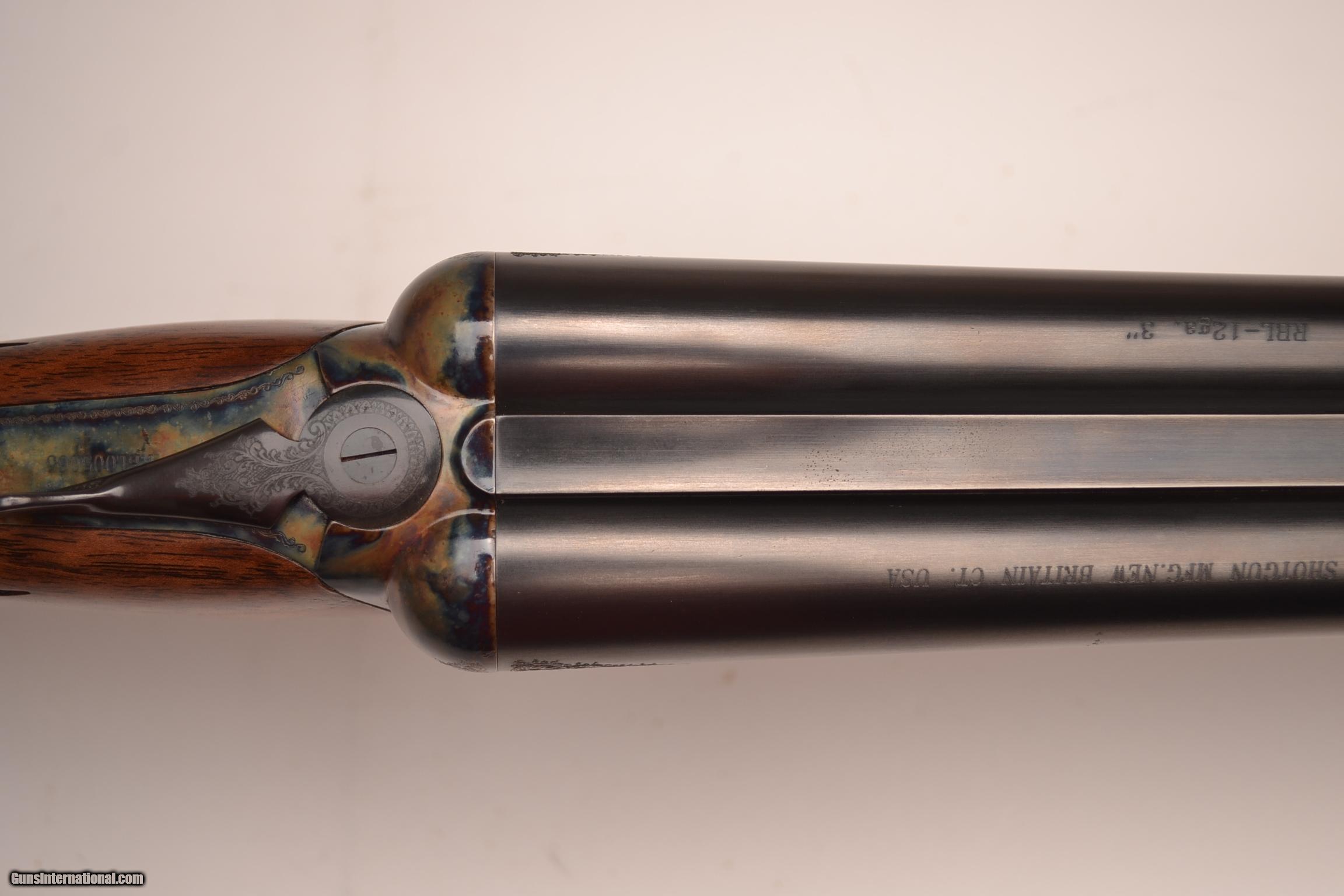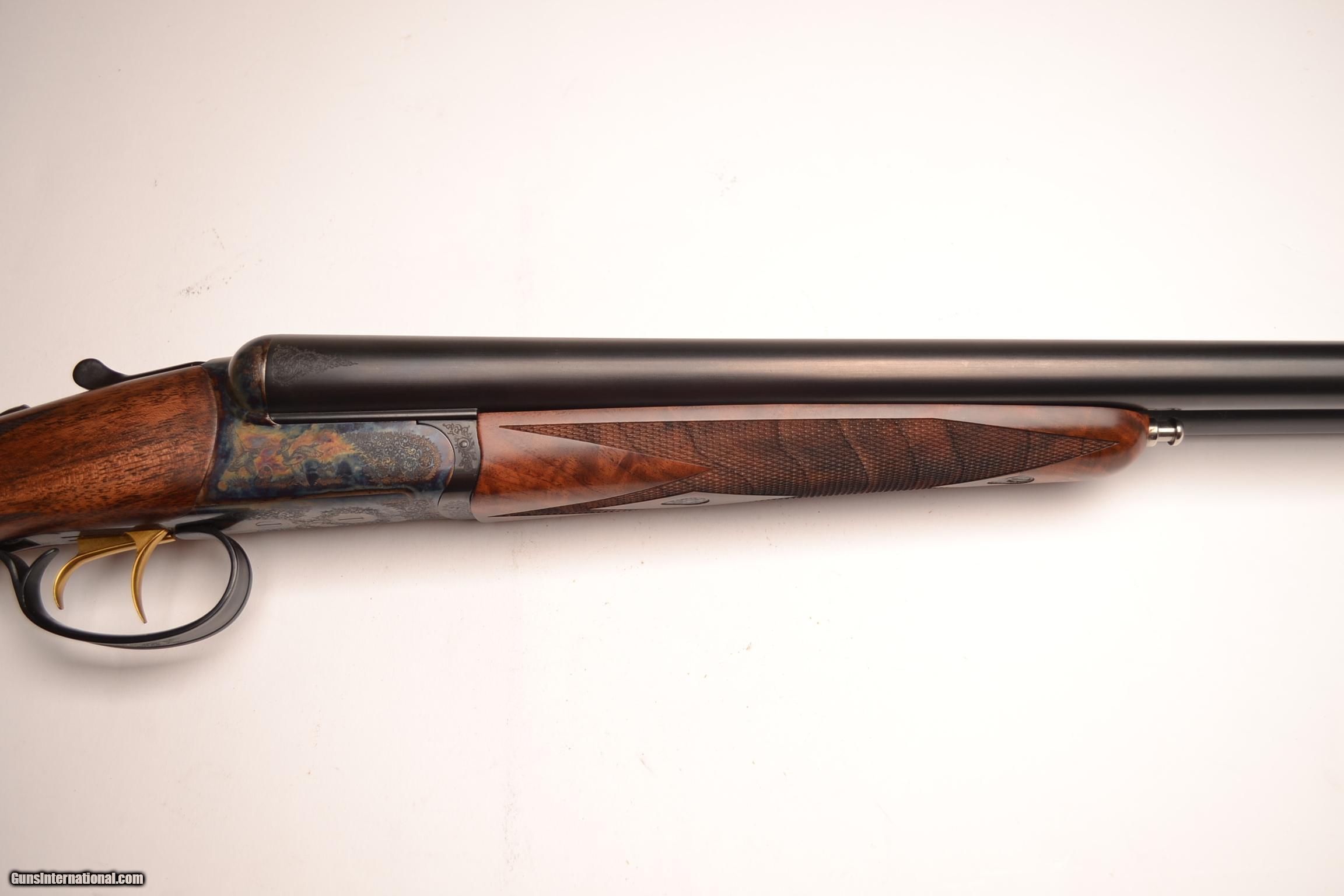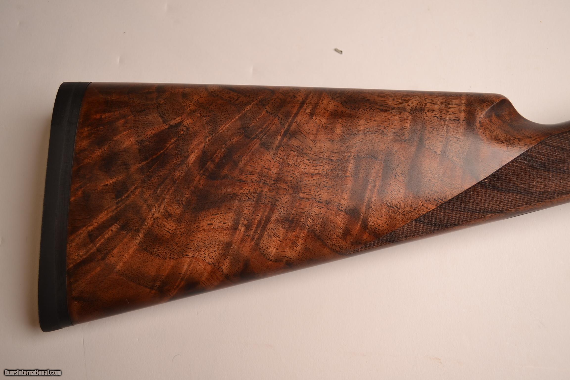 Description: RBL 12 - 12ga., 28” barrels, Trulock chokes, beautifully figured feathercrotch American black walnut long tang straight grip stock, London oil finish, splinter forend, factory ½” recoil pad, gold double triggers, automatic ejectors, automatic safety, solid rib, 3” chambers, rooster pheasant & ducks in flight surrounded full coverage scroll engraving over spectacular bone & charcoal case coloring, excellent configuration, 100% brand new & unfired, available for immediate delivery, includes case and accessories. Base price - $3,795.00, options include: 4x wood - $600, S&H - $50.00. Inv# 19085 7 lbs. 4 oz. 14 ¾” X 1 1/2” X 2 ¼” $4,445.00 SOLD |