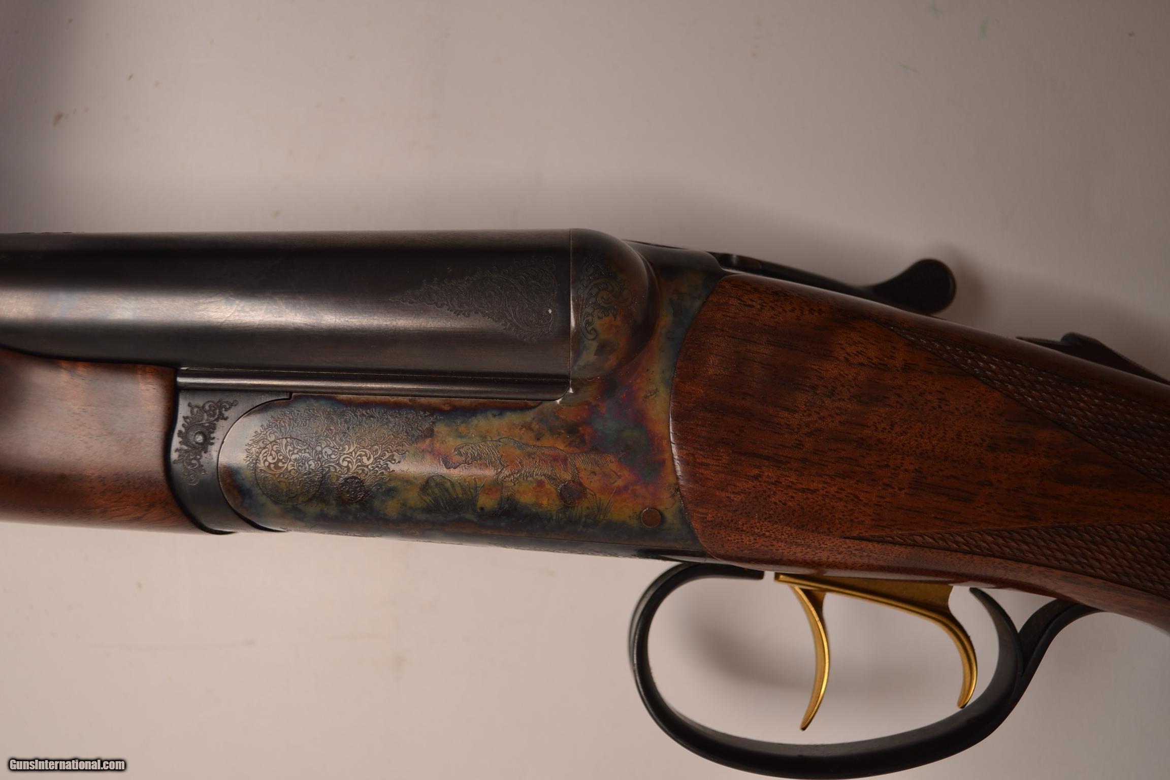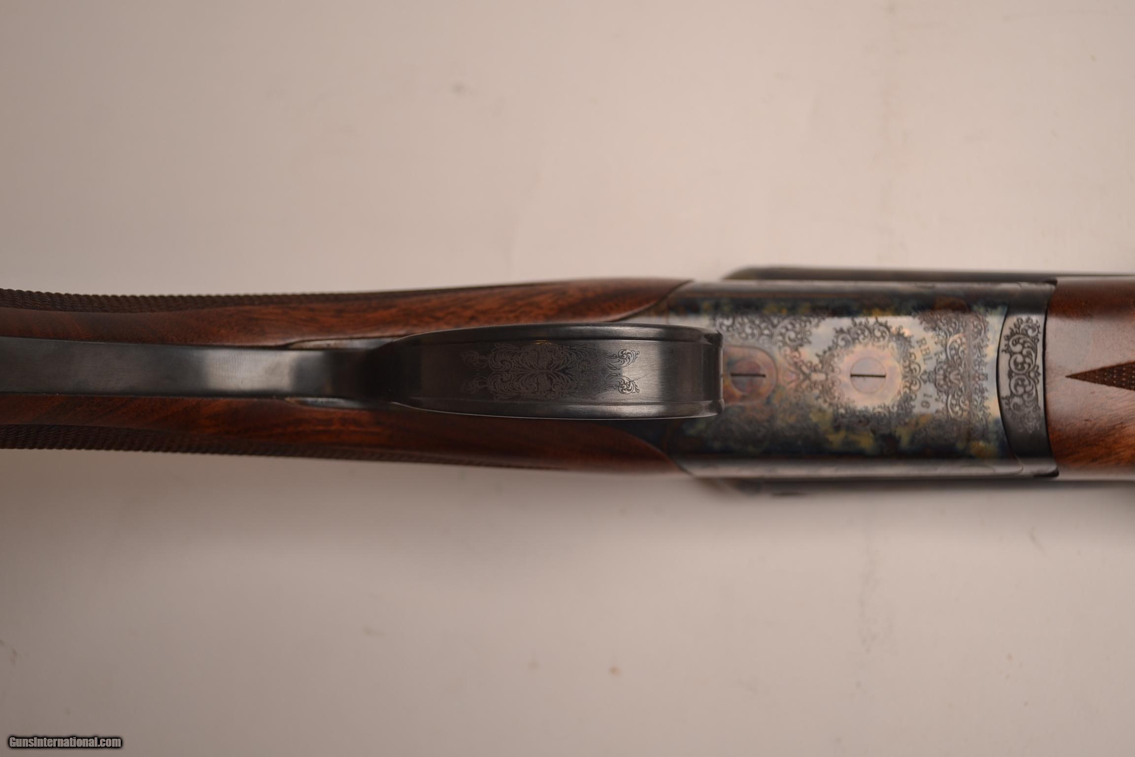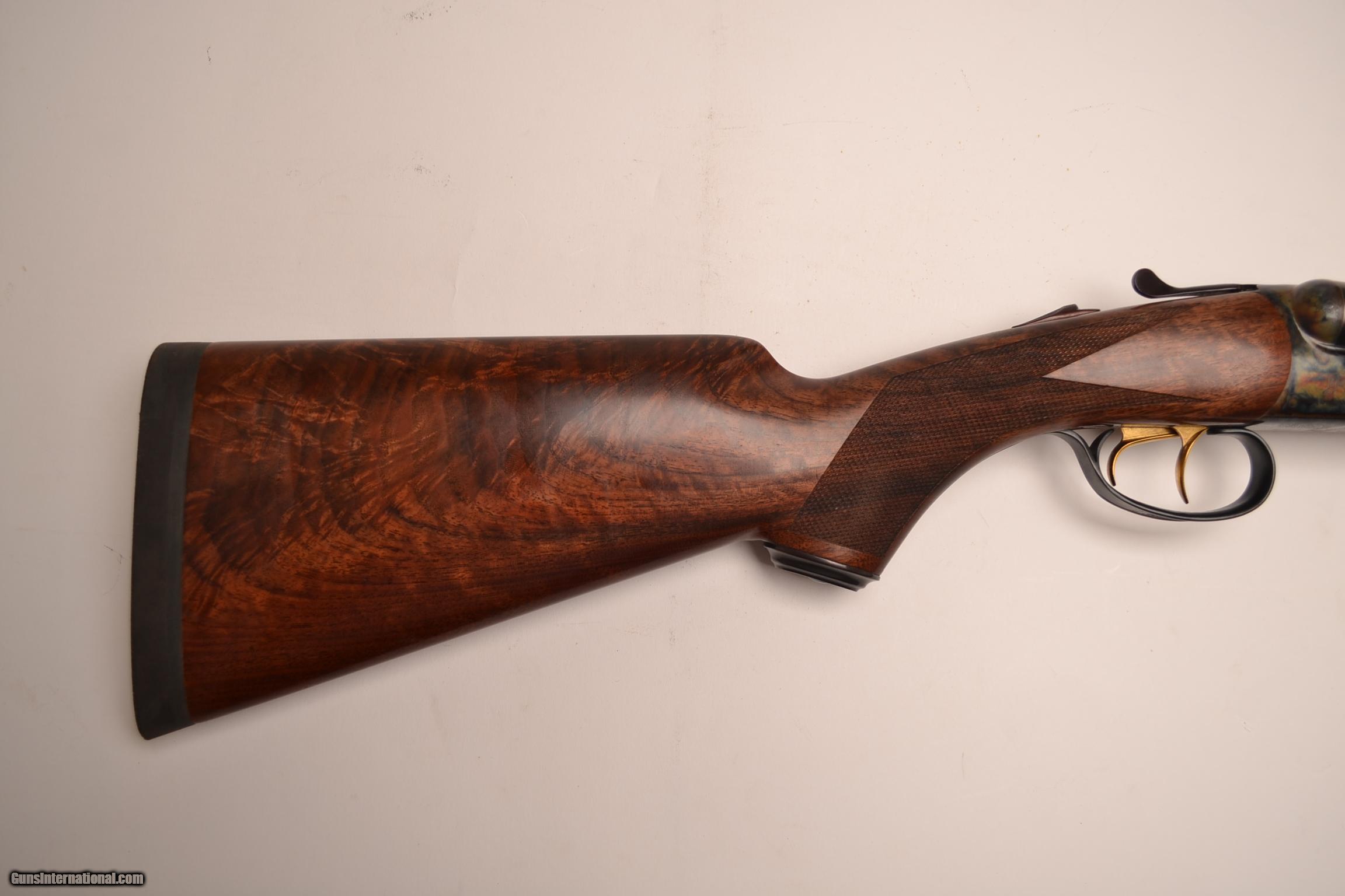 Description: RBL 16, 16ga, 29” Fixed chokes M/F, which can be opened to customer specifications, 4x feathercrotch American black walnut, long tang metal capped pistol grip stock, beavertail forend, London oil finish, gold double triggers, ¾” factory recoil pad, automatic ejectors, solid game rib, dogs on point surrounded full coverage scroll engraving over magnificent case coloring, Base price-$3,795.00, options include: 4x wood-$600, Beavertail forend-$175, S&H-$50.00, 100% new and unfired available for immediate delivery, includes makers case and accessories. Inv.# 30735 14 3/8” x 1 ½” x 2 ¼” 7 lbs. 0 oz. $4,620.00 SOLD |