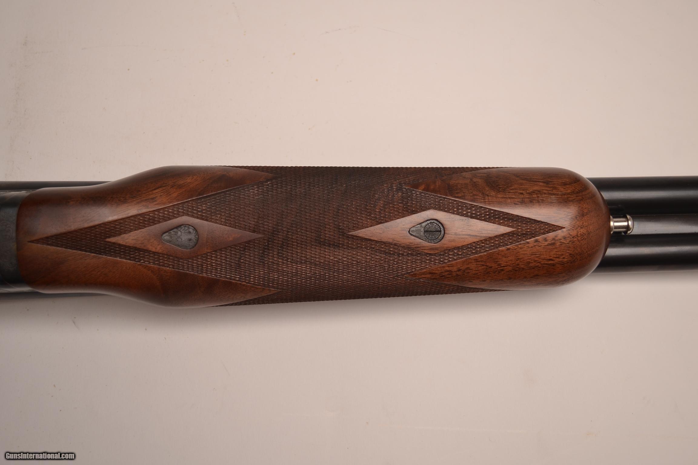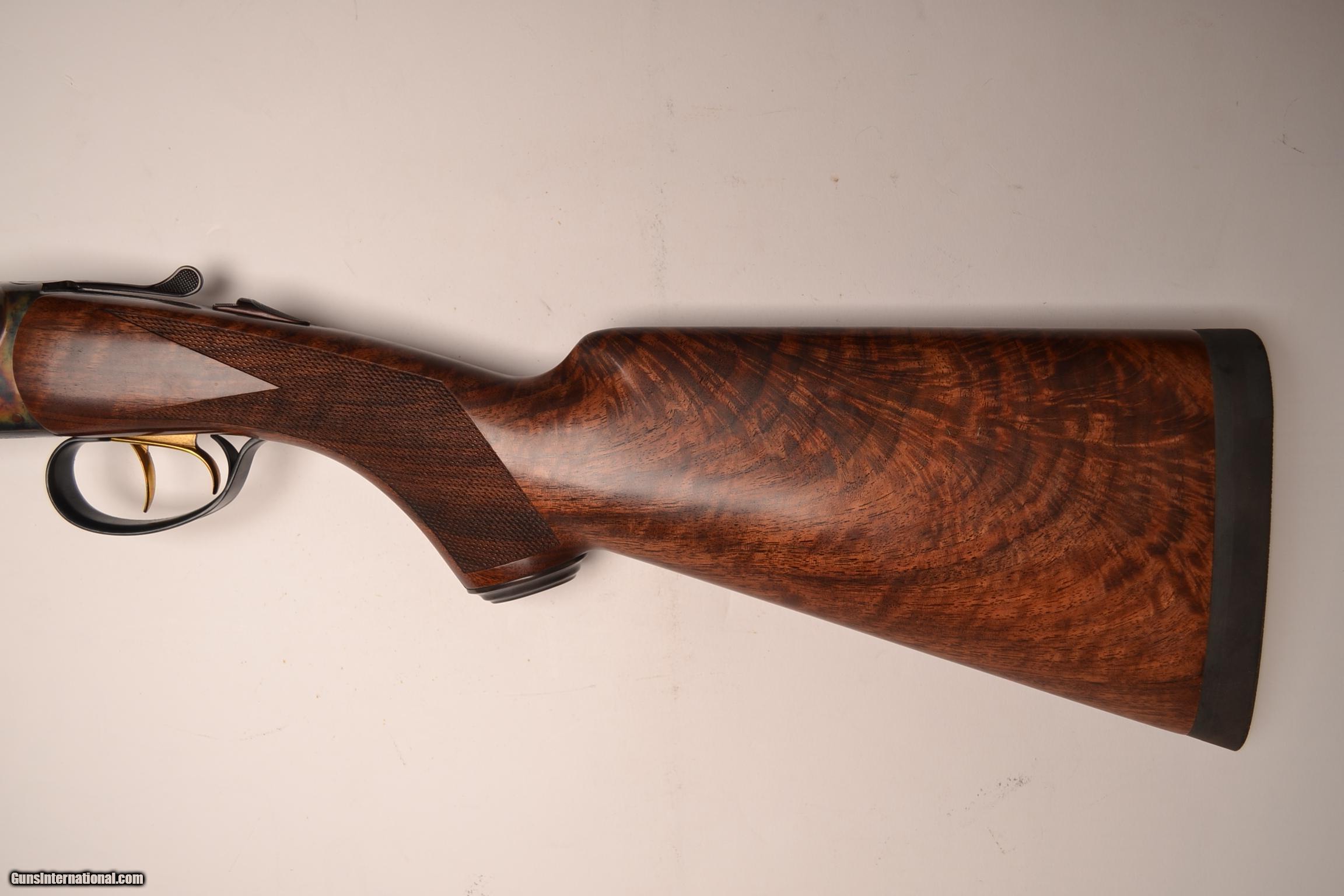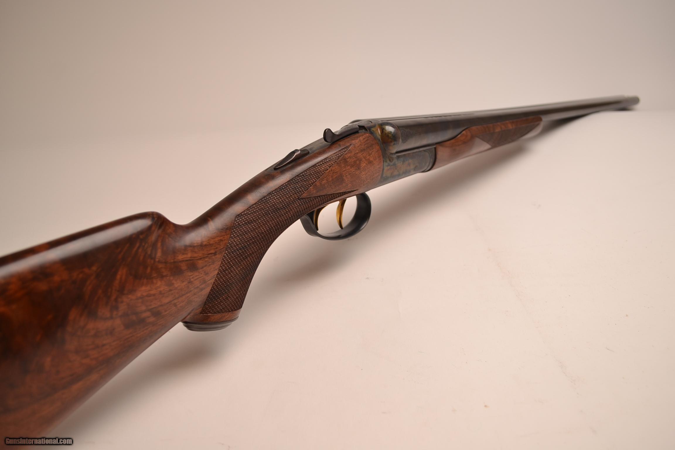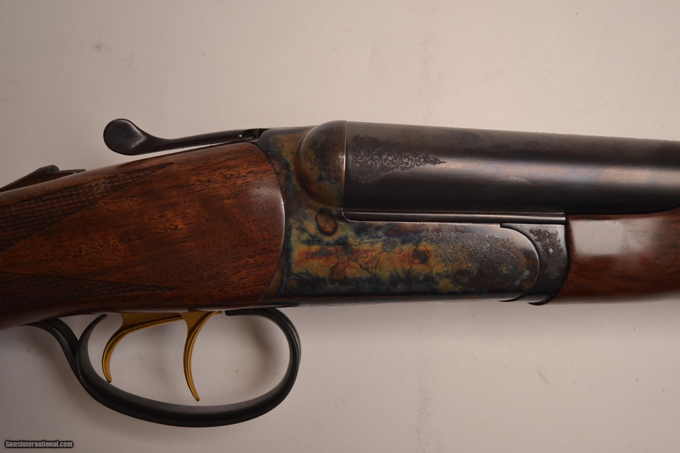 Description: RBL 16, 16ga, 29” Fixed chokes M/F, which can be opened to customer specifications, 4x feathercrotch American black walnut, long tang metal capped pistol grip stock, beavertail forend, London oil finish, gold double triggers, ¾” factory recoil pad, automatic ejectors, solid game rib, dogs on point surrounded full coverage scroll engraving over magnificent case coloring, Base price-$3,795.00, options include: 4x wood-$600, Beavertail forend-$175, S&H-$50.00, 100% new and unfired available for immediate delivery, includes makers case and accessories. Inv.# 30735 14 3/8” x 1 ½” x 2 ¼” 7 lbs. 0 oz. $4,620.00 SOLD |