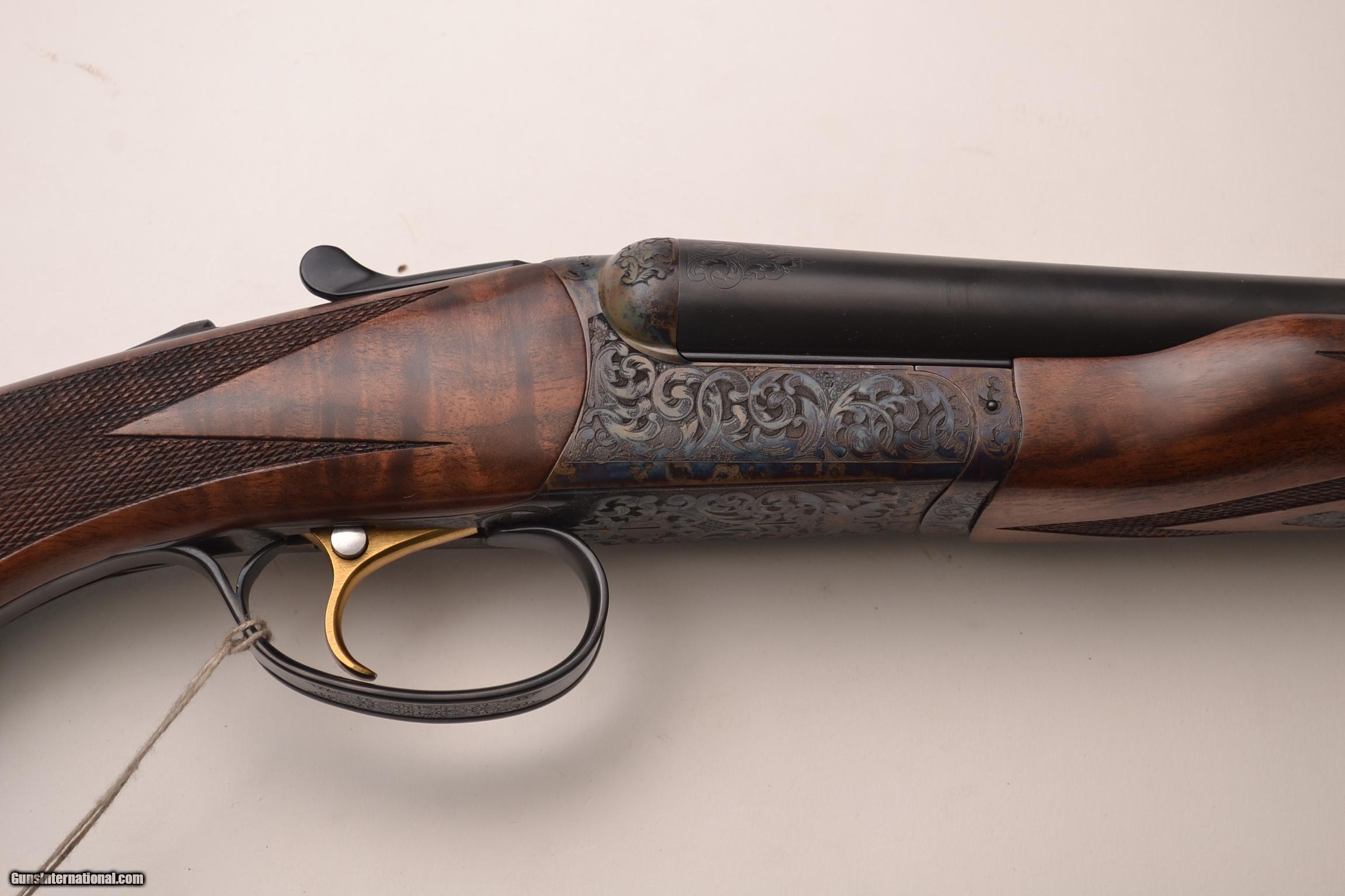 Description: RBL 20 - Rose & Scroll, 20ga., 28” barrels,trulock chokes, , solid game rib, Exhibition American wood, pistol grip stock, plastic butt pad, beavertail forend, single trigger, automatic ejectors, game scene engraving over spectacular case coloring. Base - $3,795.00, options include: Exhibition American wood - $900, SST $175, Beavertail $175, SST $175, S&H - $50.00. Inv# 18494 6lbs. 8oz. 14 3/4” x 1 ½” x 2 3/8” $5,095.00 SOLD |