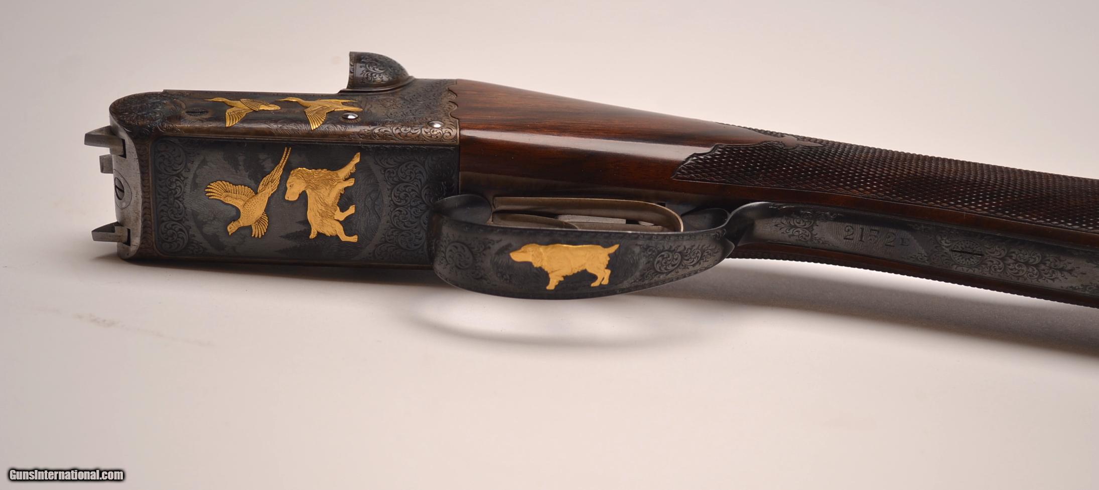 Description: Westley Richards Connaught Deluxe side by side, 28 gauge, #2152E, with seven gold inlays, engraved by Brown Brothers, with two sets of 27” chopper lump barrels, wioth tapered rib, choked improved cylinder and improved modified and modified and extra full, beautiful English walnut straight grip stock and beavertail forend, no cast, 14 ½” LOP, skeleton buttplate, double triggers, automatic ejectors, oak and leather case with canvas cover, two horn-handled screw drivers and horn-handled chamber brush, cleaning rod, gold plated oil can and snap caps, weight 5# 7oz. INV: 37913 SOLD |