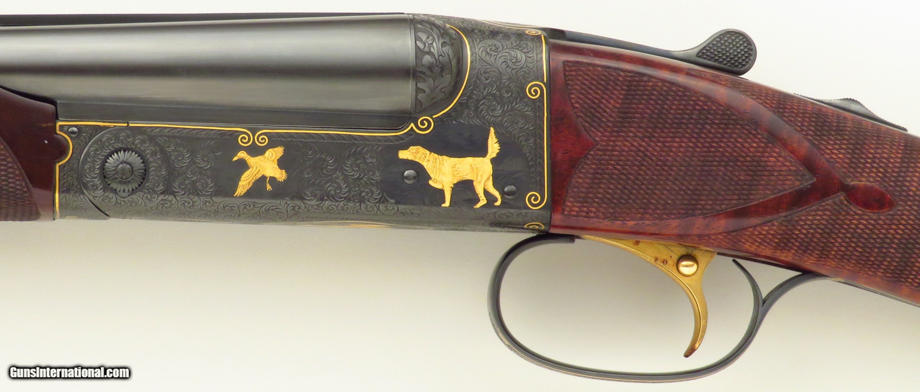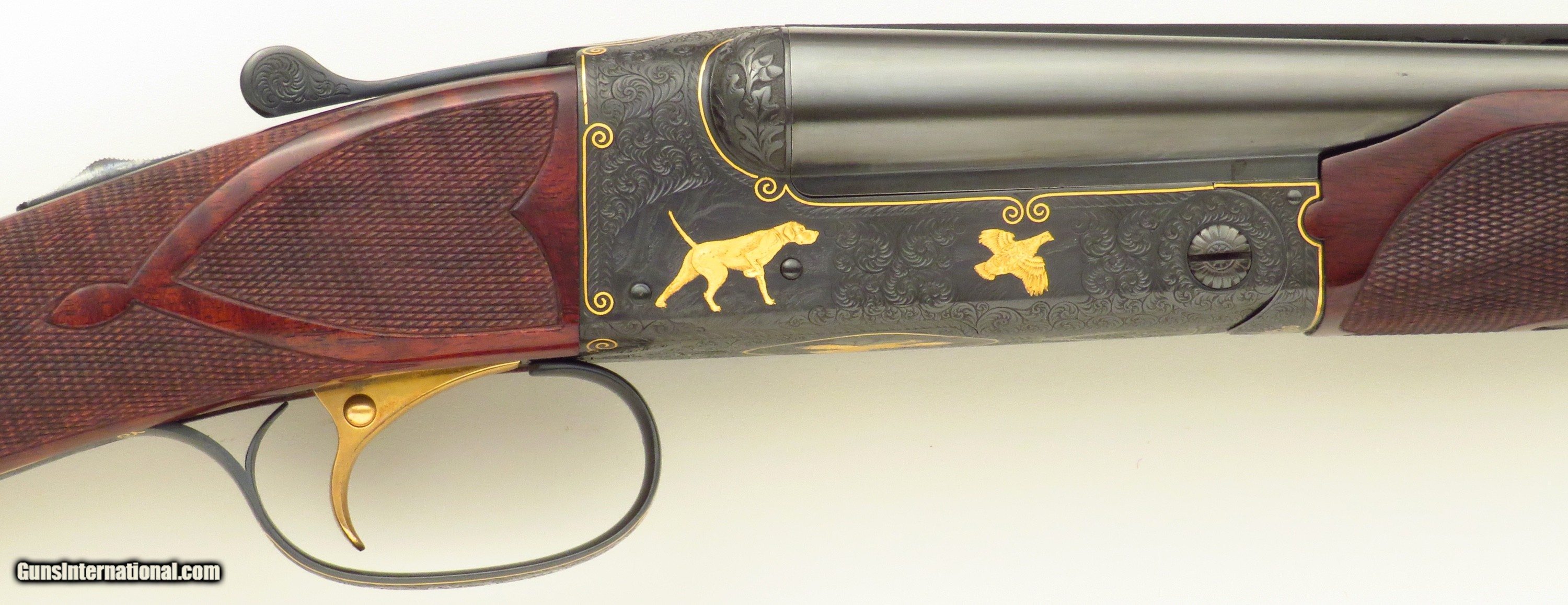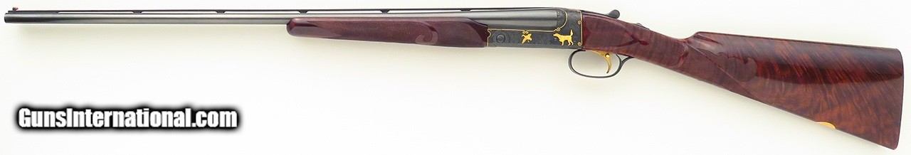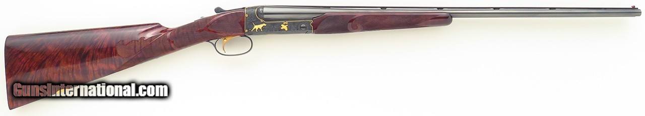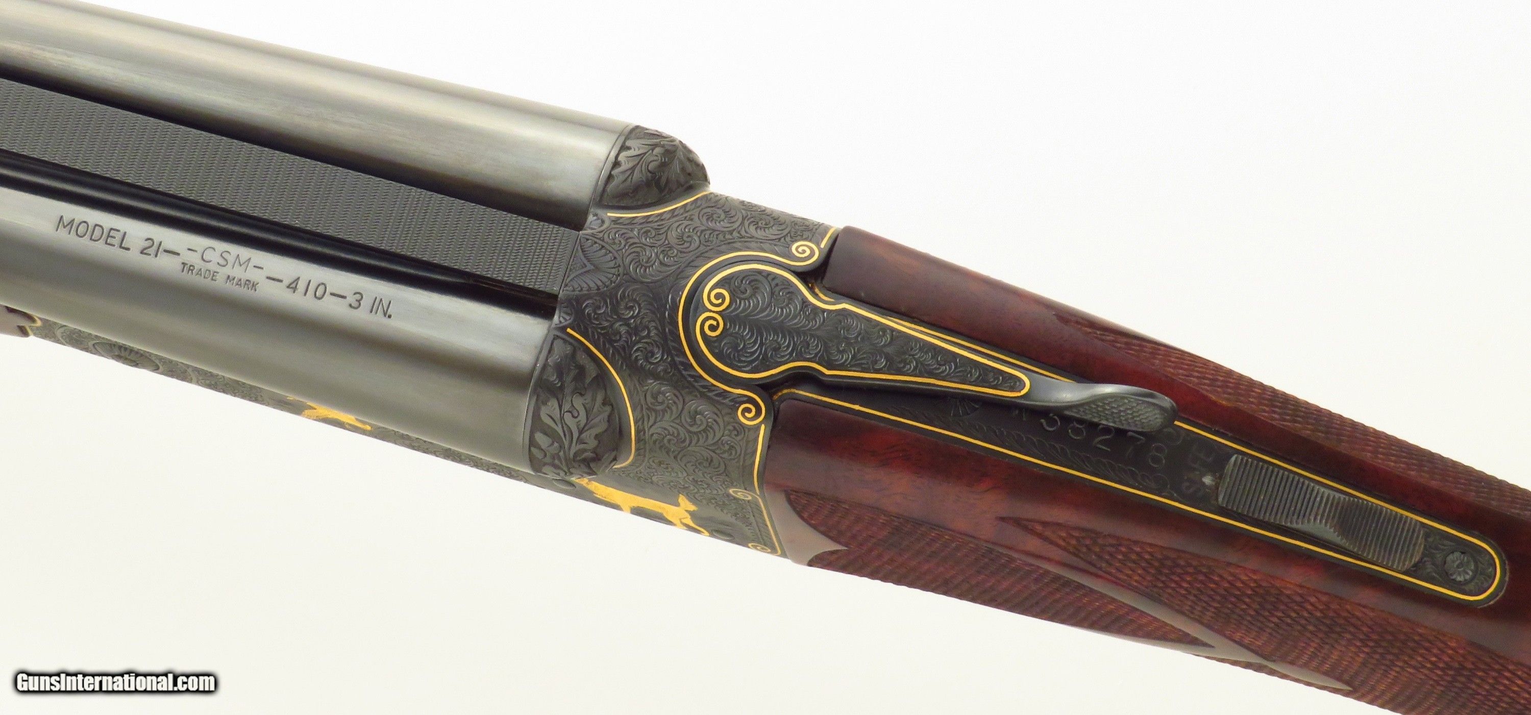 Description: Winchester / Connecticut Shotgun Manufacturing Company Model 21 Grand American .410. Consigned by the estate of the original owner, serial W38278 has 26-inch barrels (vent rib with single red bead, fixed IC/M, three-inch chambers, ejectors). Features include an automatic safety and a single select trigger. STOCK: The exceptional walnut blank set became a beavertail forend dressed with borderless checkering, ebony and bold ribbons. The straight grip butt continues the theme and includes an initial shield (blank) and checkering rather than a pad. ENGRAVING: The receiver has full coverage with a gold accents including a pointer and quail (right), setter and drake mallard (left), and a flying turkey (bottom). The surrounding gold-bordered scroll extends over the lever, tangs, guard and forend iron. DIMENSIONS: Weight is 7.2 pounds. Length-of-pull is 14.5 inches, drops are 1.25 and 2.2 inches, and cast off is approximately .25-inch. CONDITION: Bores are strong and bright. Barrels are full on face. Ejectors are strong. Metal and wood finishes are each approximately 97 percent owing to trace indications of being afield. INCLUSIONS: An oak and leather takedown case with maker's label, snaps, oiler, mahogany two-piece rod, cleaning tips and canvas cover is present and in excellent condition (label is loose at the edges). Some original paperwork is also present (as pictured). The price is firm and layaway is available. $17,500 plus shipping. SOLD Shotgun Gauge: .410 Gauge |