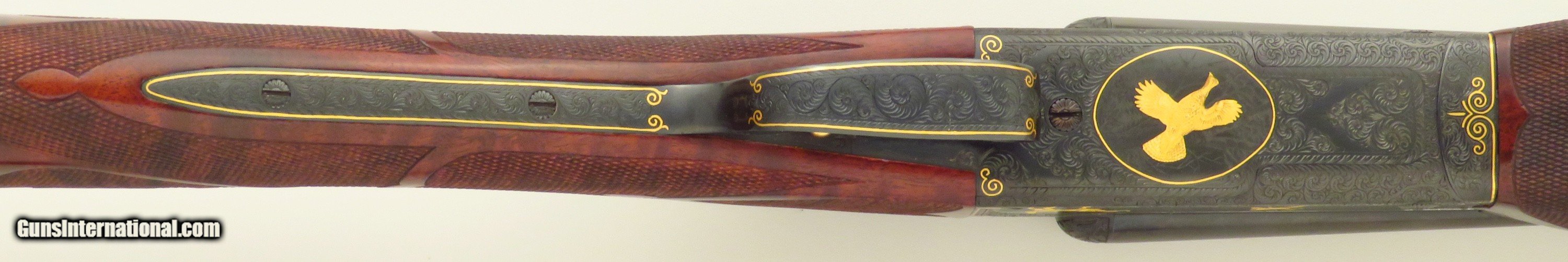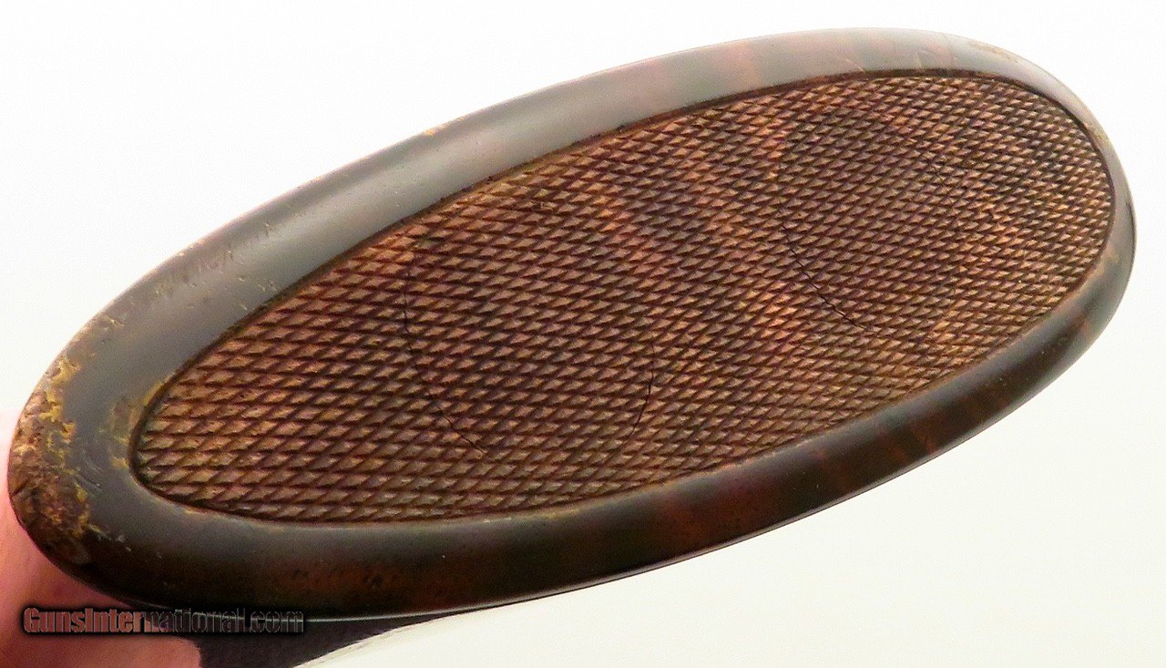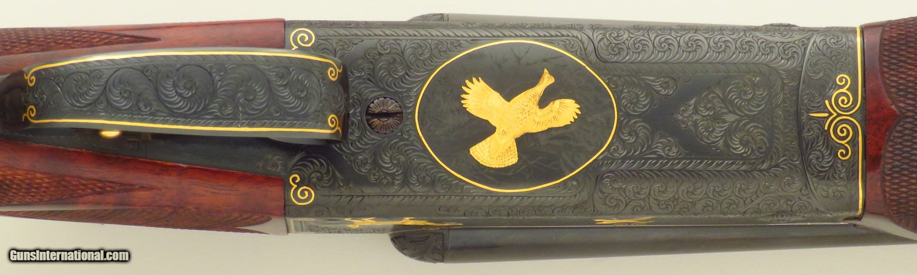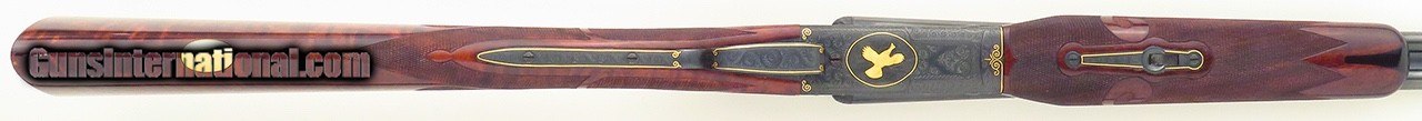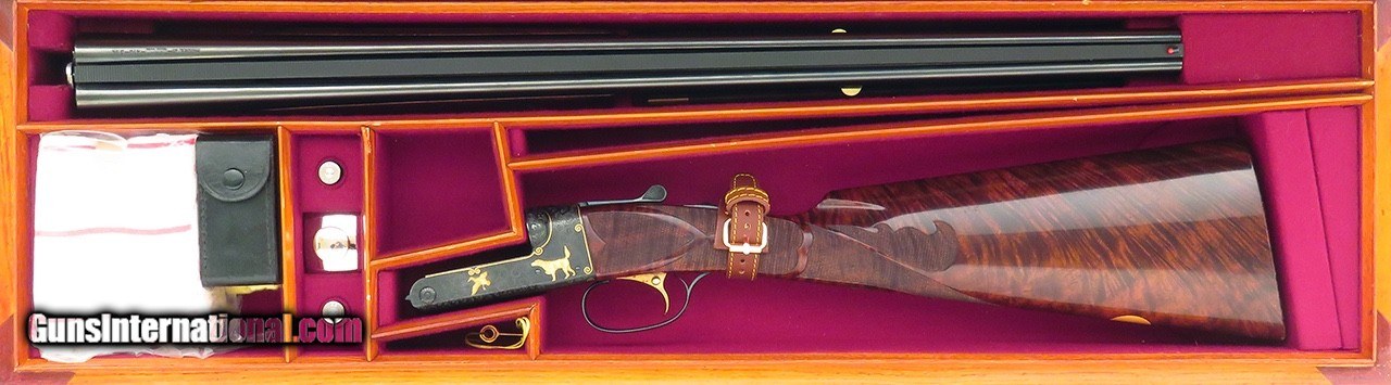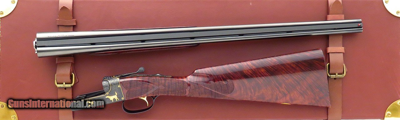 Description: Winchester / Connecticut Shotgun Manufacturing Company Model 21 Grand American .410. Consigned by the estate of the original owner, serial W38278 has 26-inch barrels (vent rib with single red bead, fixed IC/M, three-inch chambers, ejectors). Features include an automatic safety and a single select trigger. STOCK: The exceptional walnut blank set became a beavertail forend dressed with borderless checkering, ebony and bold ribbons. The straight grip butt continues the theme and includes an initial shield (blank) and checkering rather than a pad. ENGRAVING: The receiver has full coverage with a gold accents including a pointer and quail (right), setter and drake mallard (left), and a flying turkey (bottom). The surrounding gold-bordered scroll extends over the lever, tangs, guard and forend iron. DIMENSIONS: Weight is 7.2 pounds. Length-of-pull is 14.5 inches, drops are 1.25 and 2.2 inches, and cast off is approximately .25-inch. CONDITION: Bores are strong and bright. Barrels are full on face. Ejectors are strong. Metal and wood finishes are each approximately 97 percent owing to trace indications of being afield. INCLUSIONS: An oak and leather takedown case with maker's label, snaps, oiler, mahogany two-piece rod, cleaning tips and canvas cover is present and in excellent condition (label is loose at the edges). Some original paperwork is also present (as pictured). The price is firm and layaway is available. $17,500 plus shipping. SOLD Shotgun Gauge: .410 Gauge |