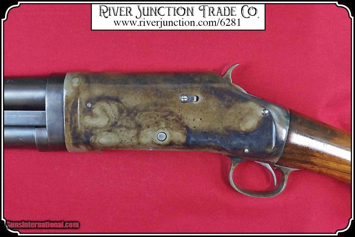 Description: If you are a Cowboy Action Shooter that likes the show just as well as the go, then this is just the thing. "BEAUTY & THE BEAST" Or, maybe you would like a home defense shotgun that looks like art hanging on your wall, but still ready when needed. Serial number 820993 Manufactured 1927. A Complete restoration by R.A. Dotzenrod. The BEAUTY shows off her curves with a newly restored stock that has her bottom covered with a fresh Winchester butt plate. What makes her a real stand out is the expertly applied CASED COLORED frame, trigger guard, magazine cap and barrel band. Truly a one of a kind not seen elsewhere. Of coarse all her moving parts perform well. Put her into action and that's when the BEAST in her comes to life. Now is the time to show off her vital statistics: 12 gauge, Barrel 18 1/2 inches, Cylinder bore, and deep blue complexion. Payment: Item, can be ordered on line with a credit card or paypal on our sight. Just Google (riverjunction) and type in the River Junction Trade Co. item number (6281) in the search box. Before you checkout you will see shipping cost and total. OR If you prefer: Pay by cash, postal money order, cashiers check, personal & business checks. We wait for checks to clear. We always answer questions and entertain offers. Have questions? Call me 563-880-4588. Jim SOLD |