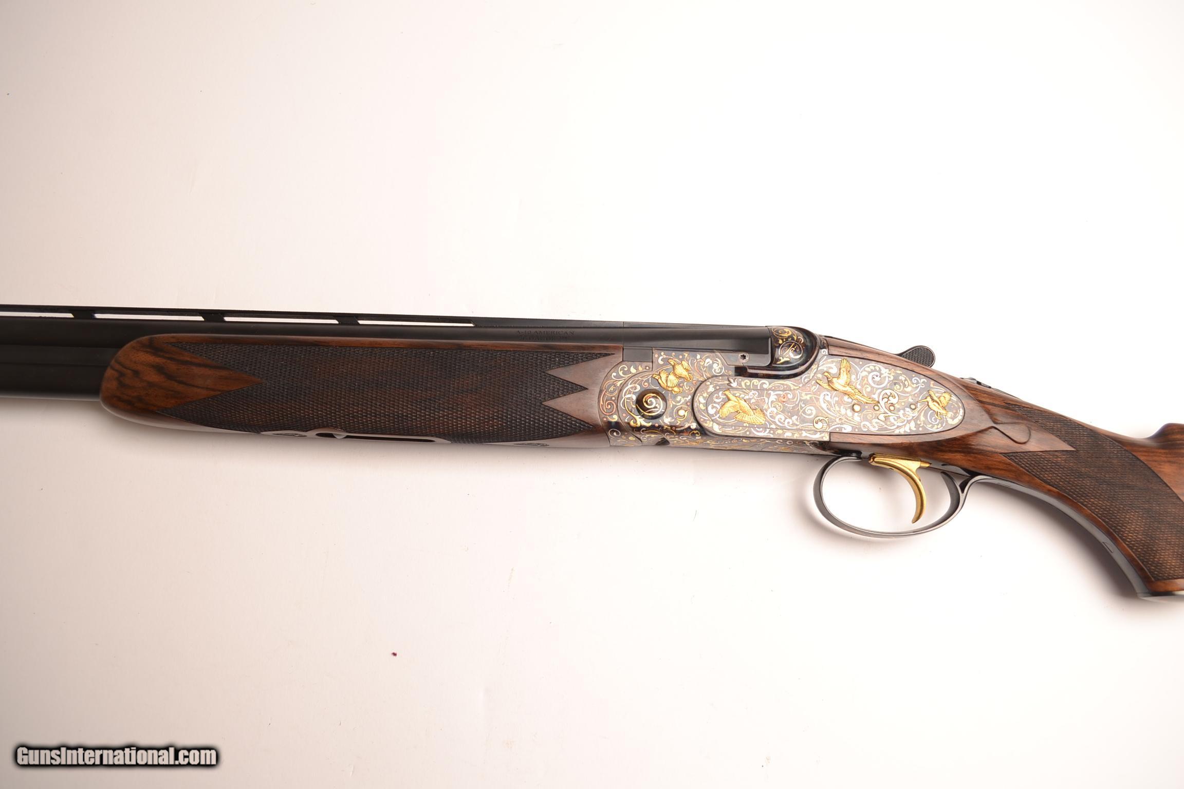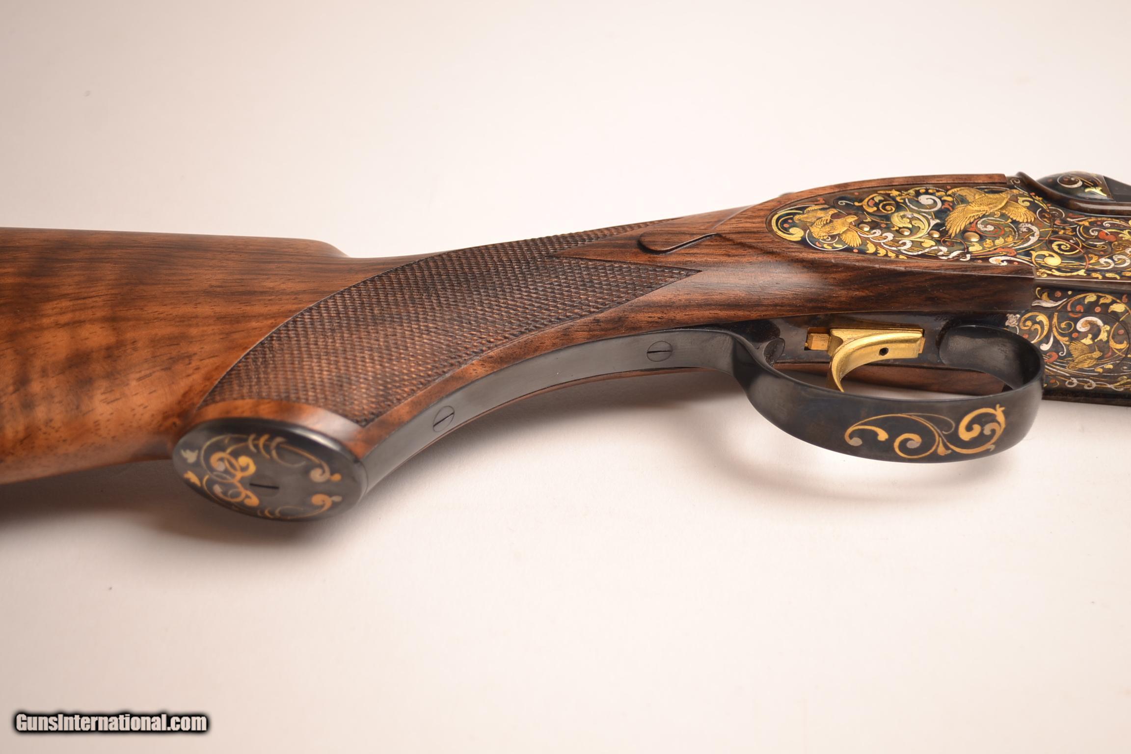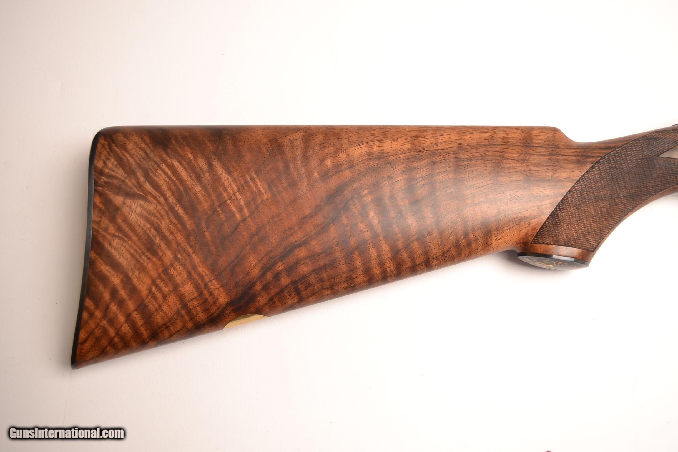 Description: CSMC - A10 Exhibition Grade, 20ga., 30” barrels with screw in choke tubes, highly figured exhibition Turkish Circassian walnut, capped Pistol grip with a long tang trigger guard, skeleton butt, traditional London oil finish, hunting forend, drop points, vent rib, automatic ejectors, automatic safety, single selective trigger, full sidelock shotgun with hand detachable locks, gold oval, highly detailed raised gold inlays of quail, pheasant, woodcock, and grouse surrounded by full coverage multi colored gold ribbons over a color case hardened receiver engraved by the Master Bonsi, stunning gun, available for immediate delivery. Inv# 29273 14 5/8” x 1 ½” x 2 ½” 6 lbs. 4 oz. $39,999 SOLD |